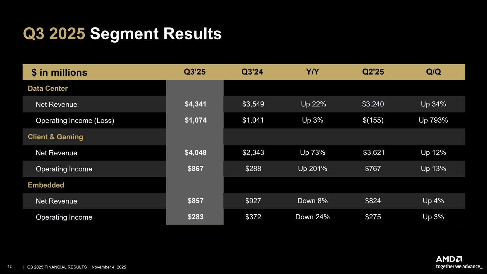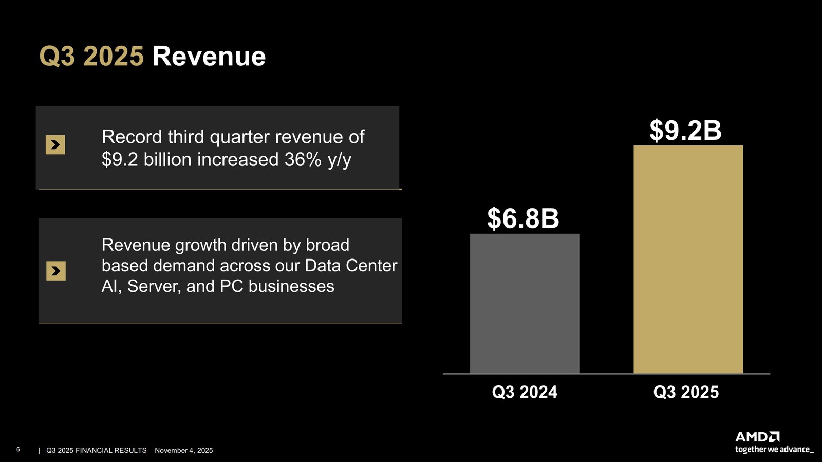 Dyrektor generalna Lisa Su podkreśliła, że „Popyt na moc obliczeniową nigdy nie był większy” oraz zwróciła uwagę na strategiczne inicjatywy spółki w zakresie sztucznej inteligencji: „Nasz biznes AI w centrach danych wchodzi w kolejną fazę wzrostu”.