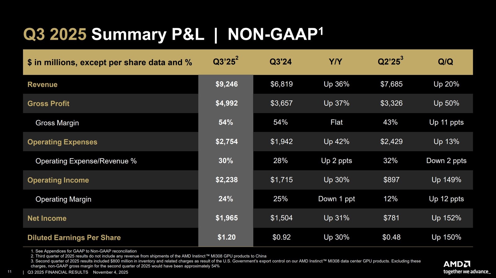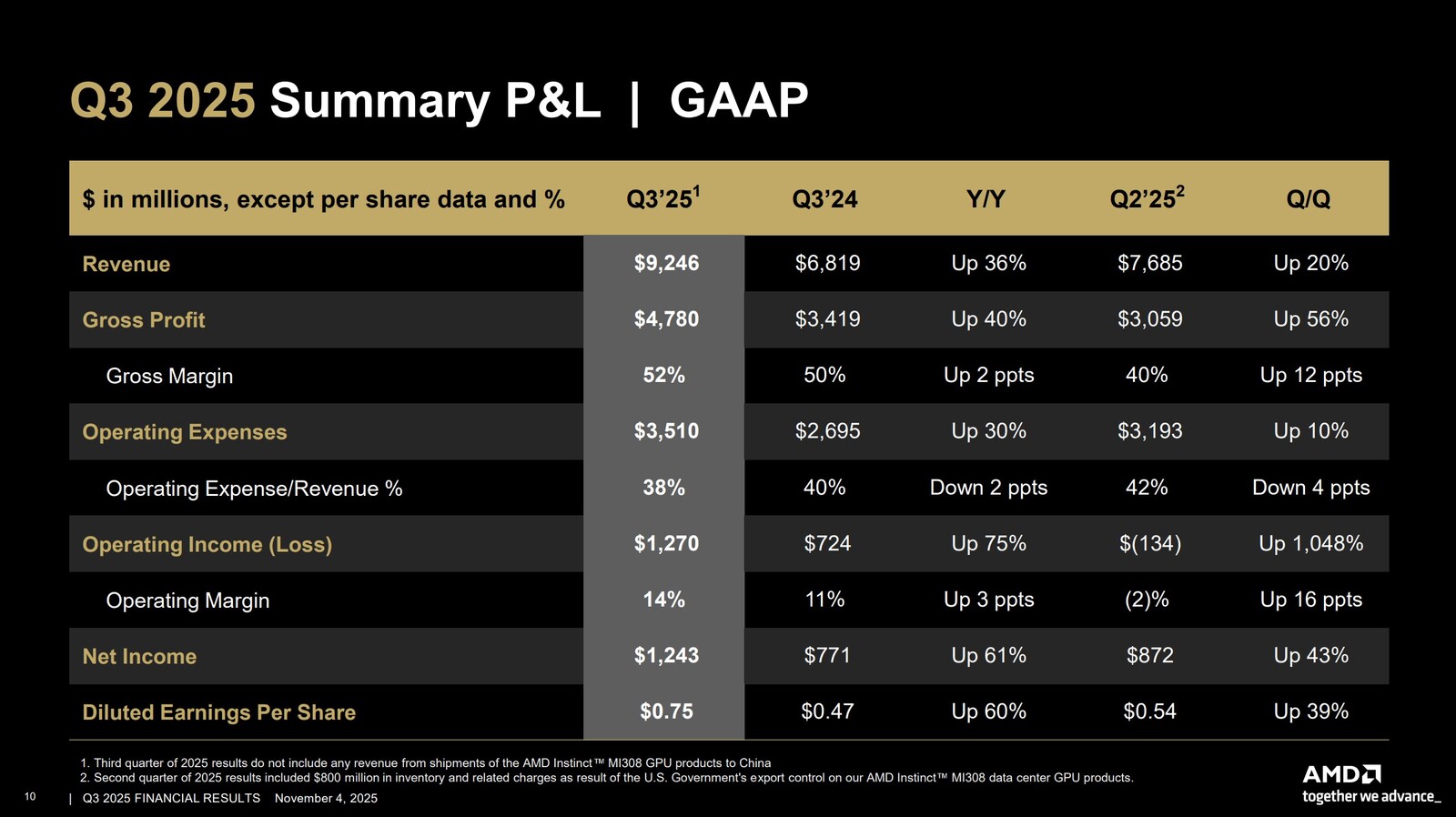 AMD przewyższyło konsensus analityków z EPS 1,20 dolara (wobec prognozy 1,17 dolara) oraz przychodami 9,25 mld dolarów (wobec oczekiwanych 8,74 mld dolarów), kontynuując trend przekraczania prognoz rynkowych.