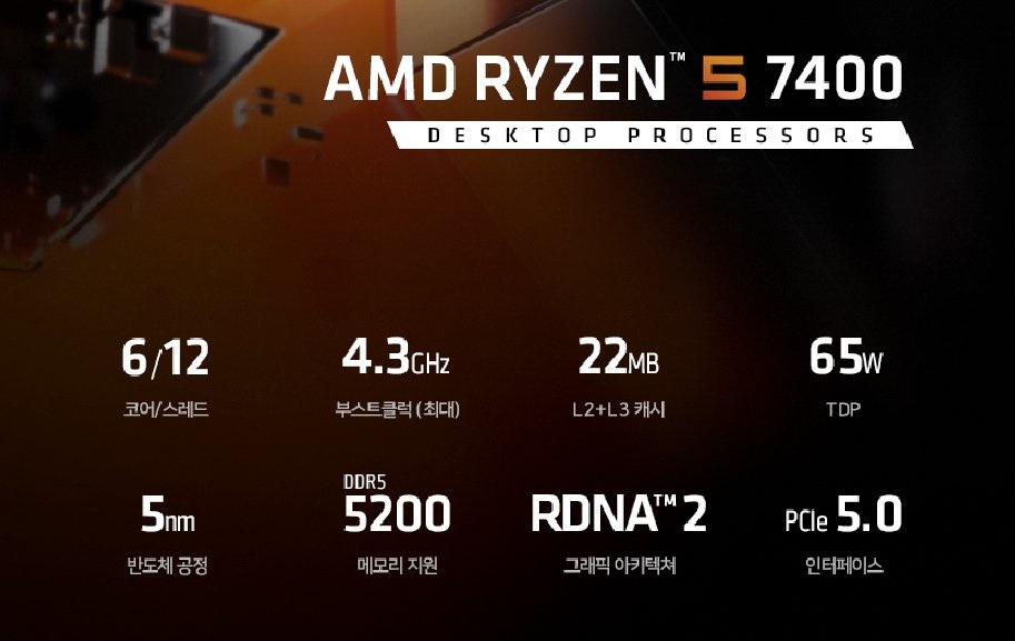 - Ryzen 5 7400: 6 rdzeni / 12 wątków, 3,3 / 4,3 GHz, 16 MB L3, TDP 65 W, z iGPU