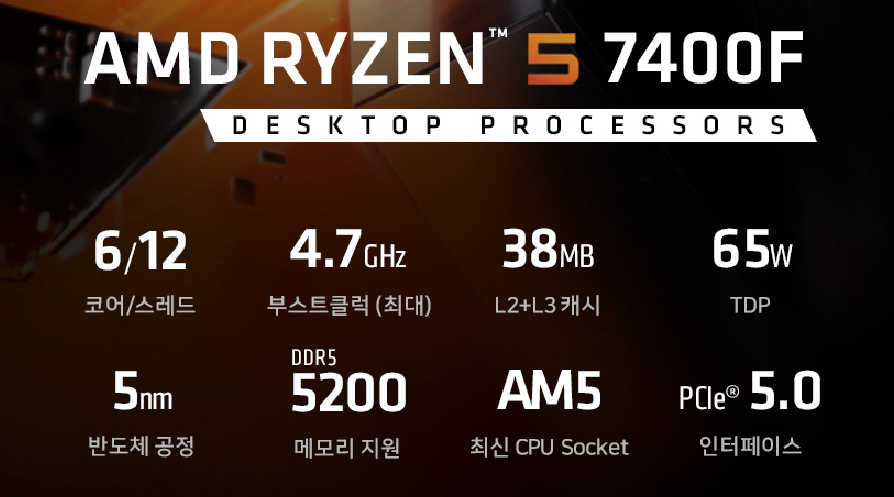 - Ryzen 5 7400F: 6 rdzeni / 12 wątków, 3,7 / 4,7 GHz, 32 MB L3, TDP 65 W, bez iGPU