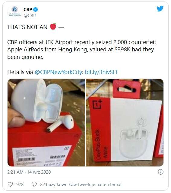 W tym przypadku jest jeszcze ciekawiej, bo celnicy zatrzymali na granicy 2000 pudełek ze słuchawkami OnePlus Buds, które wzięli za podróbki Apple AirPods. Ale to nie koniec, z wielką dumą pochwalili się sukcesem w Internecie.