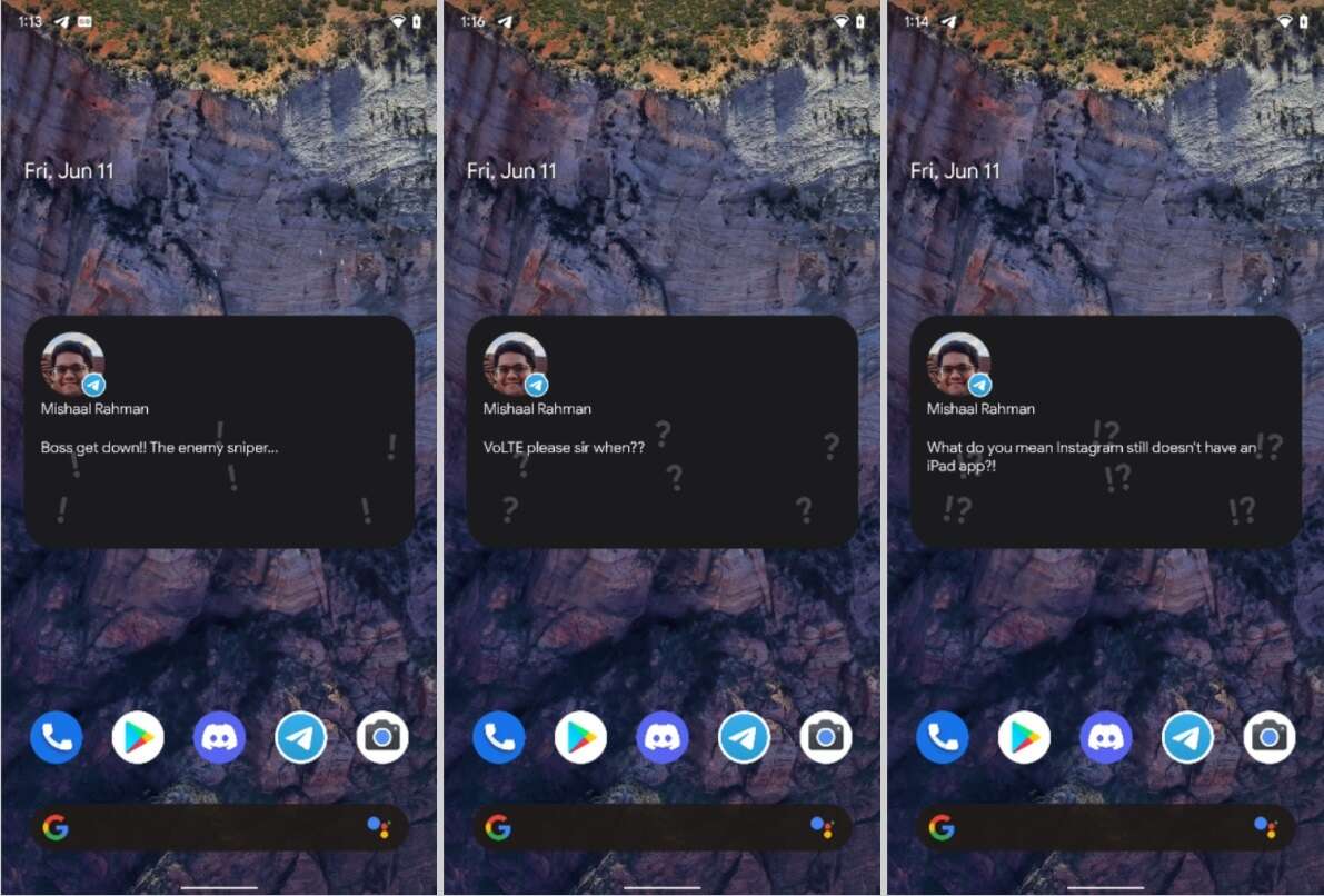 Serwis XDA pokazał kilka screenów przedstawiających zmiany, jakie zachodzą w widżecie w zależności od otrzymywanych wiadomości. Tło dostosowuje się bowiem do treści, np. jeśli umieścimy w nim kilka wykrzykników lub znaków zapytania – pokażą się one w tle wiadomości. Podobnie jest w przypadku kilkukrotnie użytych emoji.