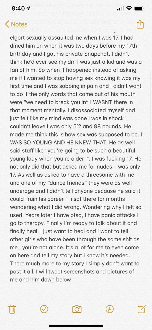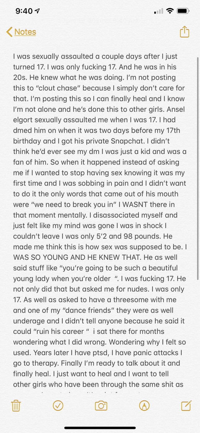 23-letnia Gabby opisała wczoraj na Twitterze swoją historię z Anselem Elgortem. Dziewczyna poznała go w 2014 roku, gdy miała 17 lat, a aktor 20. Według jej słów doszło między nimi do stosunku seksualnego, którego ostatecznie nie chciała. Pisała, że był to jej pierwszy raz i bardzo ja bolało, ale Elgort nie chciał przerywać zmuszając ją do kontynuowania. Aktor nie zważał na jej płacz i słowa protestu. Opisuje również, jak mocno odbiło się to na jej psychice. Ostatnie lata spędziła na terapii i miała ataki paniki. Opisuje tę sytuację, bo chce w końcu wyzdrowieć i pozbyć się tego ciężaru. Na potwierdzenie swojego związku z aktorem dodała zdjęcie, a nawet fragmenty rozmów.