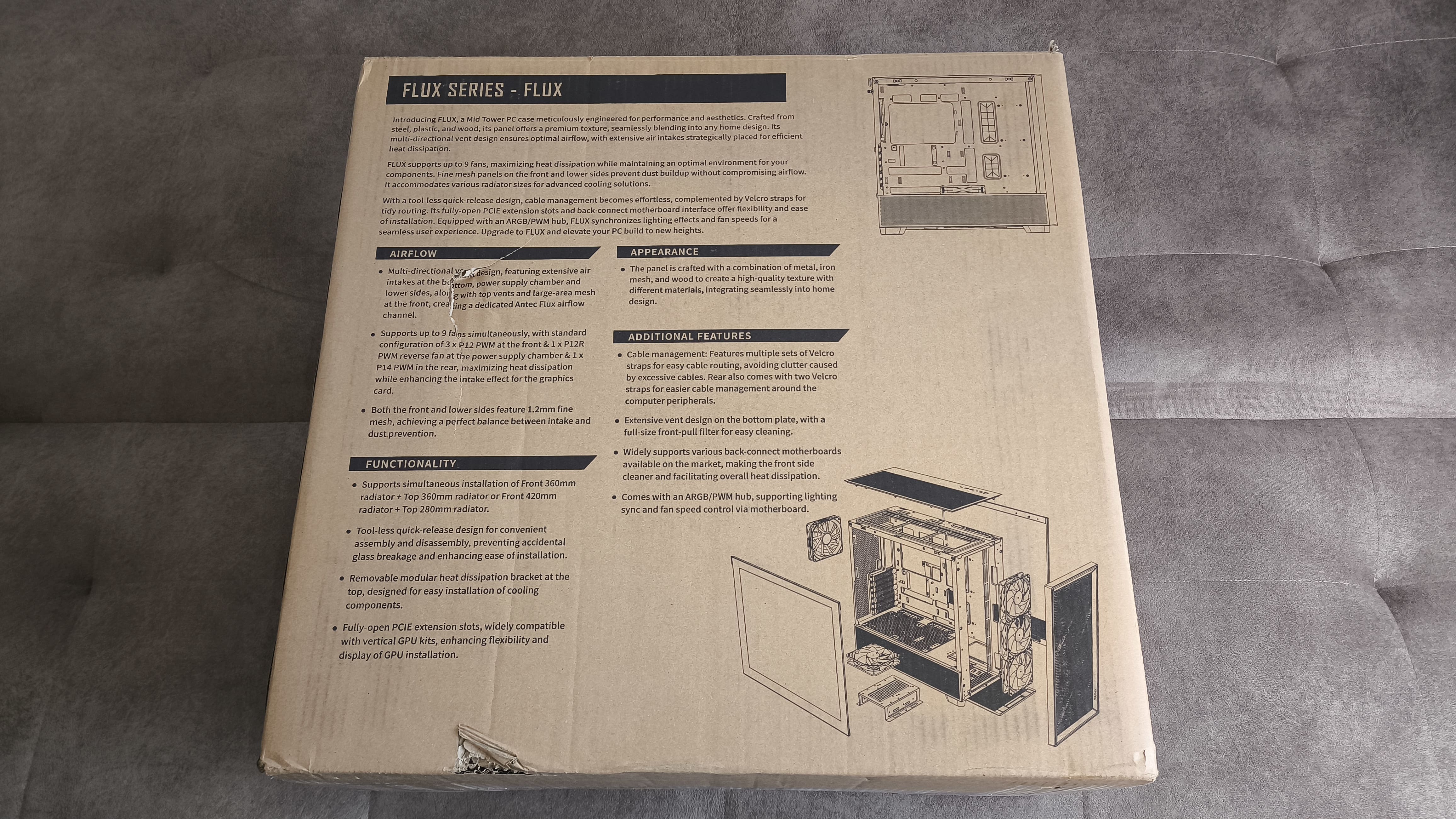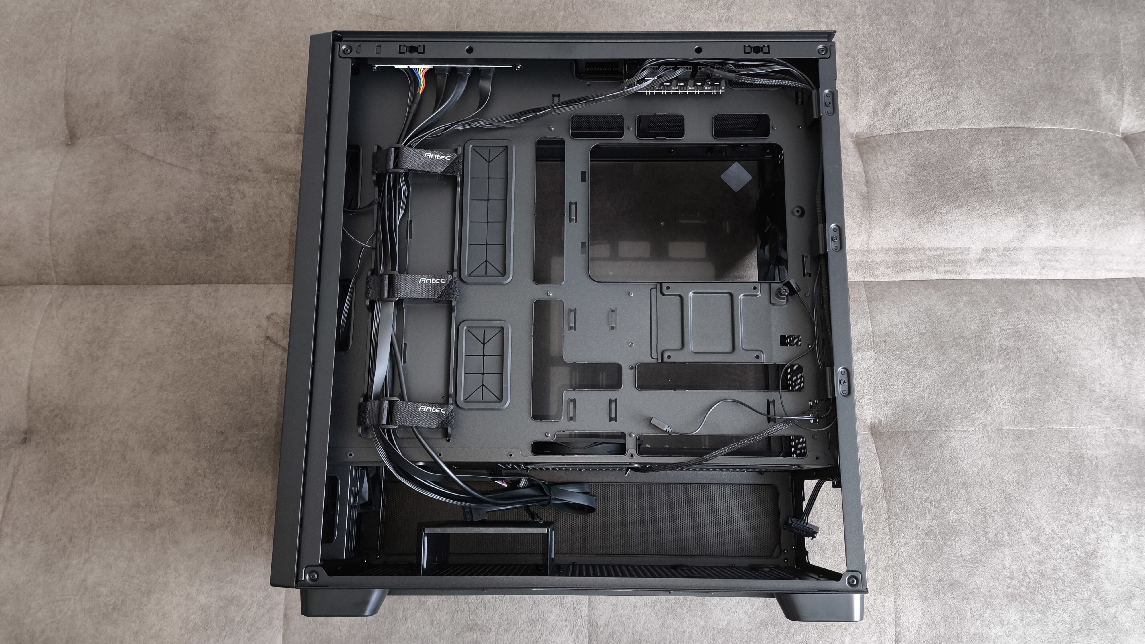 Antec Flux to obudowa, która już od pierwszych chwil pracy z nią sprawia bardzo dobre wrażenie pod względem ergonomii montażu. Producent wyraźnie położył nacisk na funkcjonalność i wygodę użytkownika, co zaowocowało konstrukcją nie tylko przestronną, ale też dobrze przemyślaną pod kątem rozmieszczenia podzespołów, trasowania okablowania i swobodnego dostępu do kluczowych miejsc.
