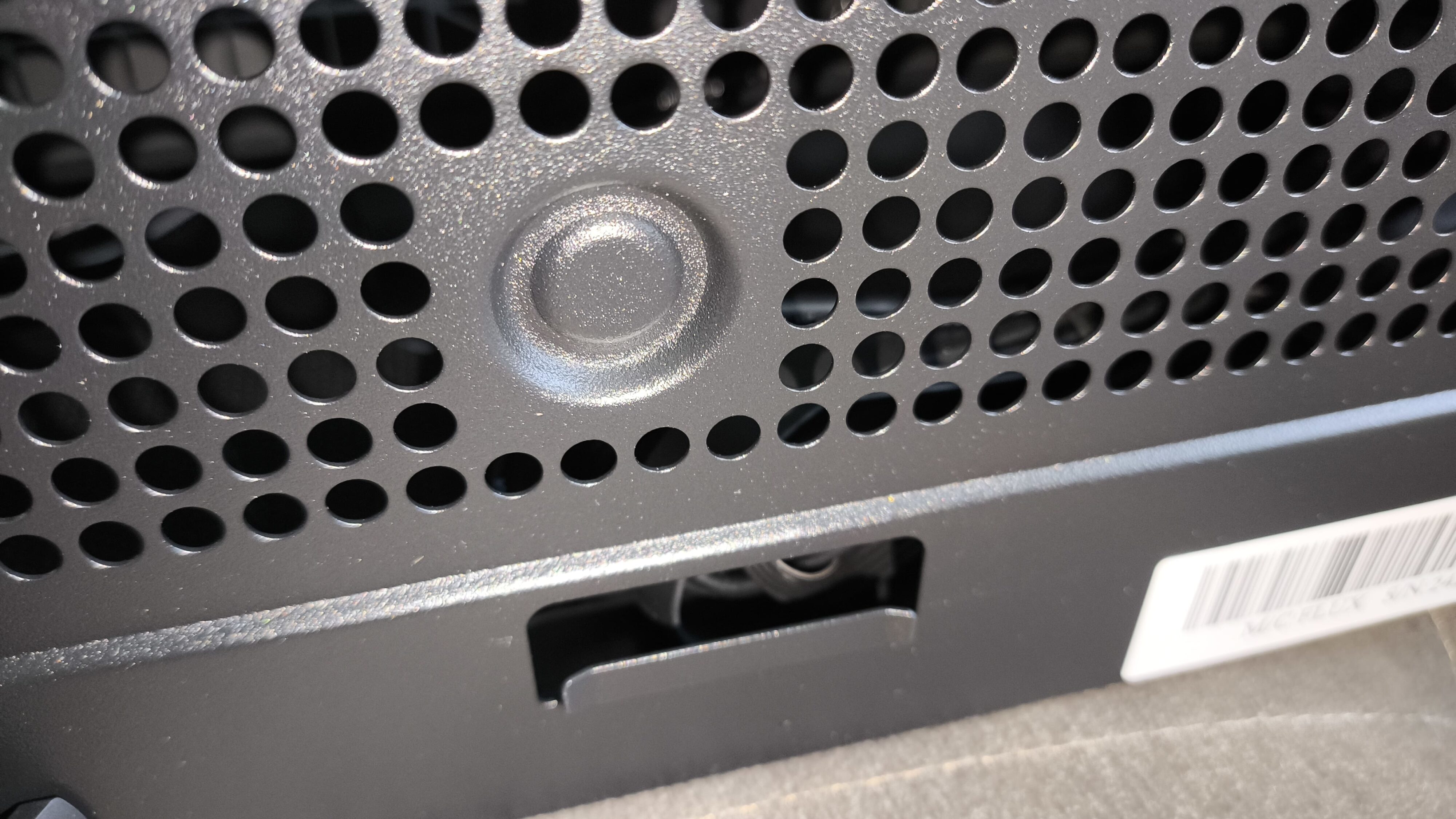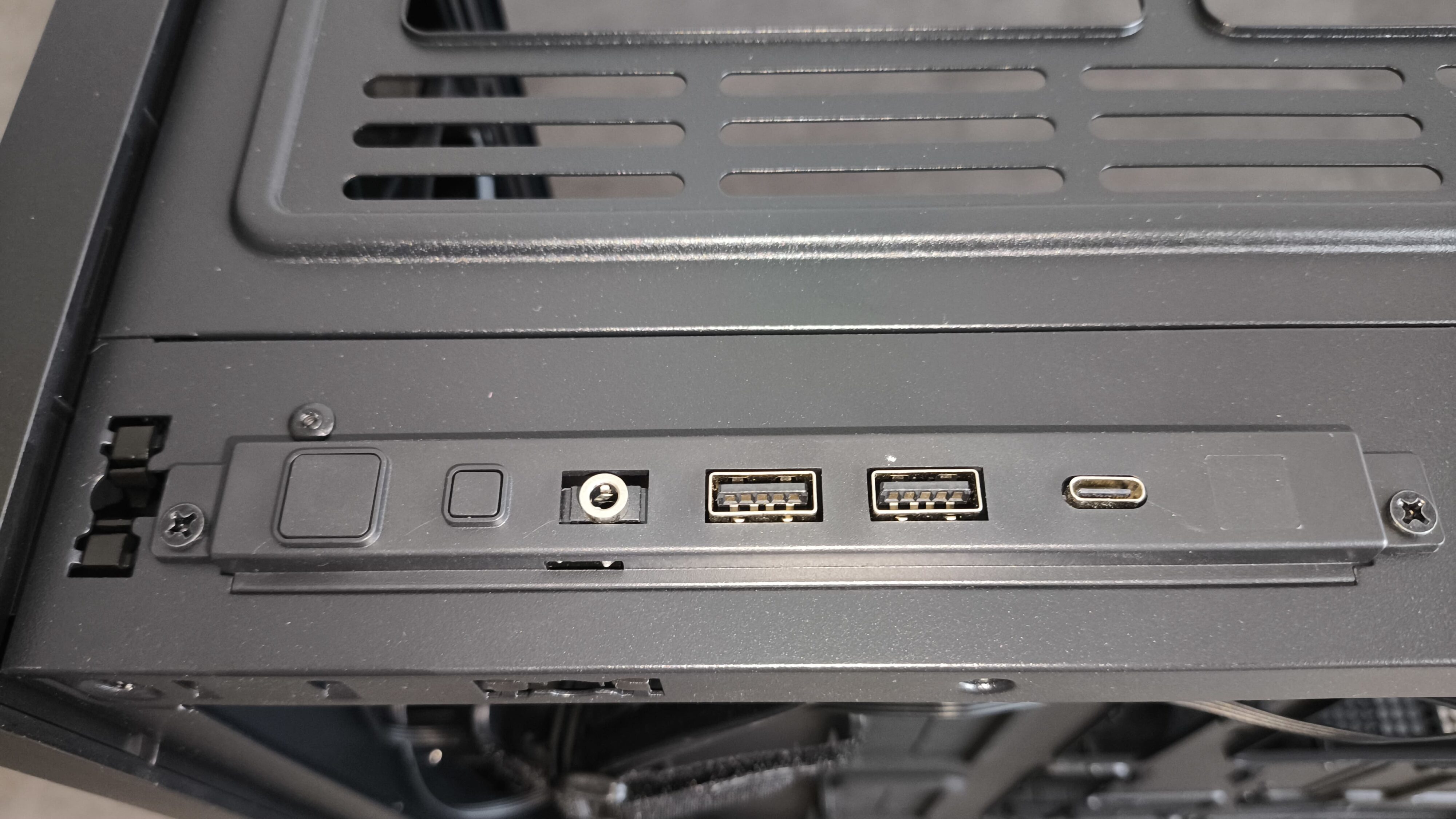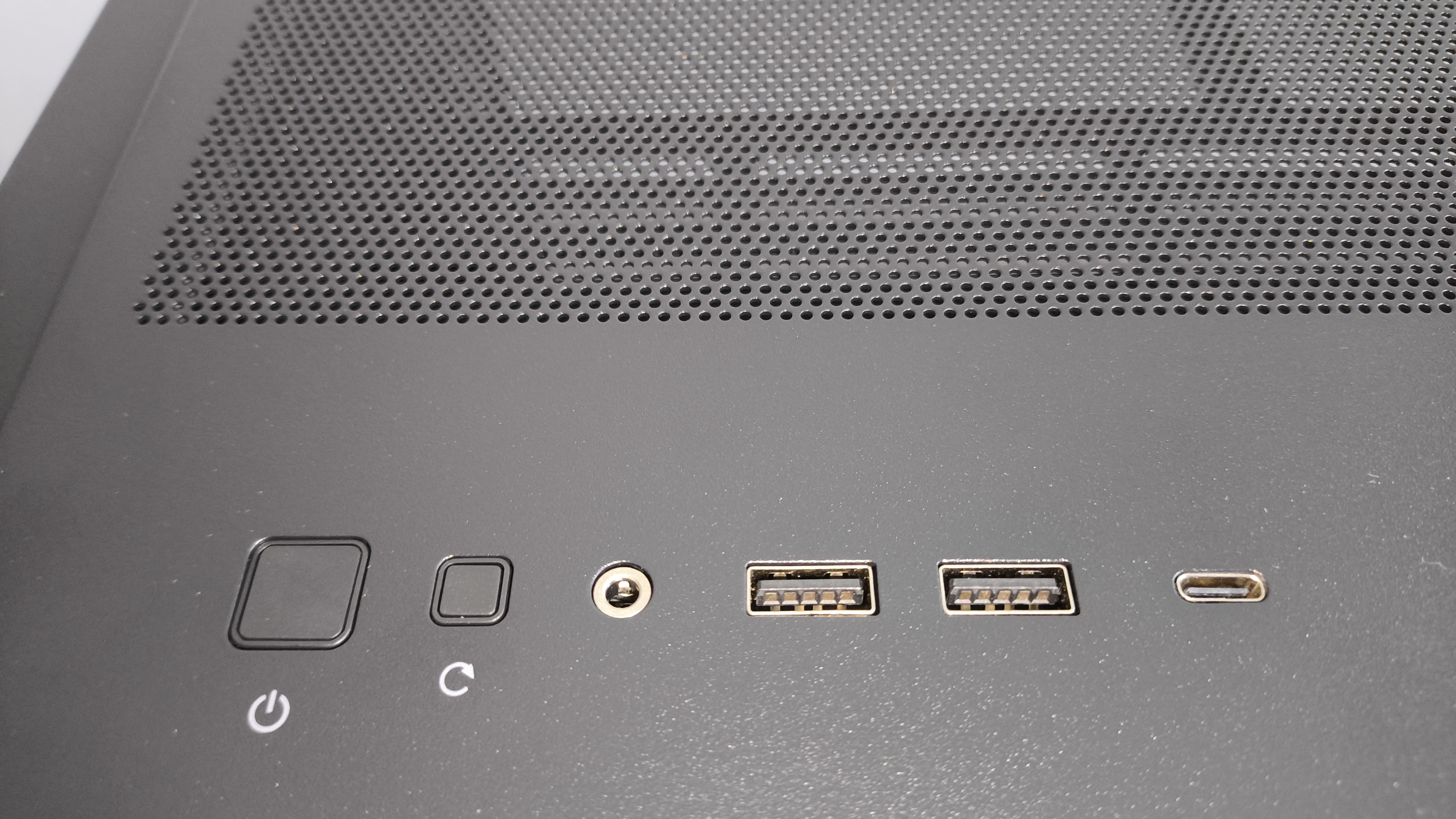 Górny panel obudowy to również metalowa siatka mesh (bardzo łatwo wyjmowalna), pod którą znajdują się porty I/O. Do dyspozycji użytkownika są tutaj przycisk zasilania, przycisk resetu, dwa porty USB 3.0, jeden port USB-C o prędkości 10 Gb/s oraz combo jack audio łączący wejście mikrofonowe i wyjście słuchawkowe.