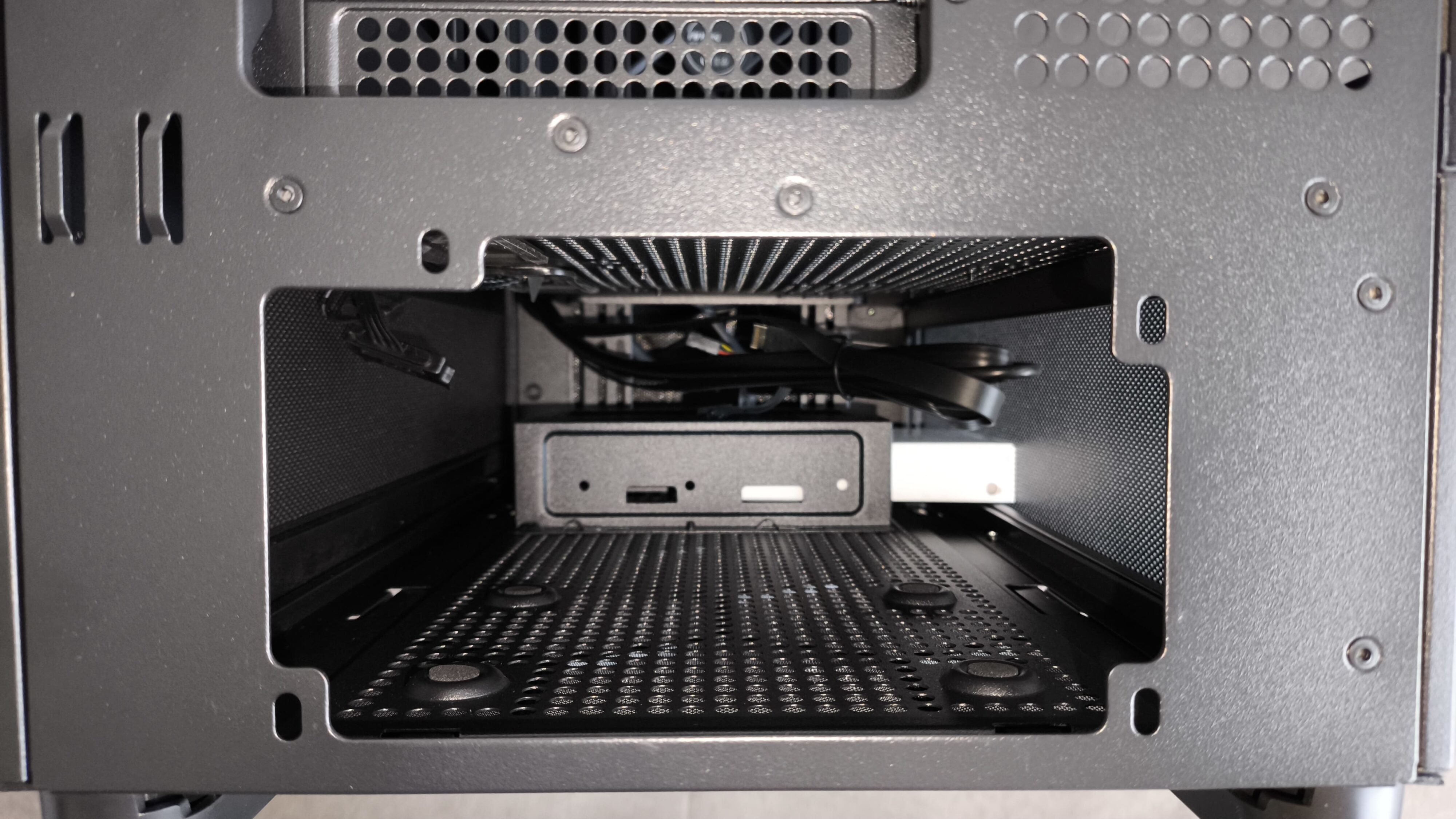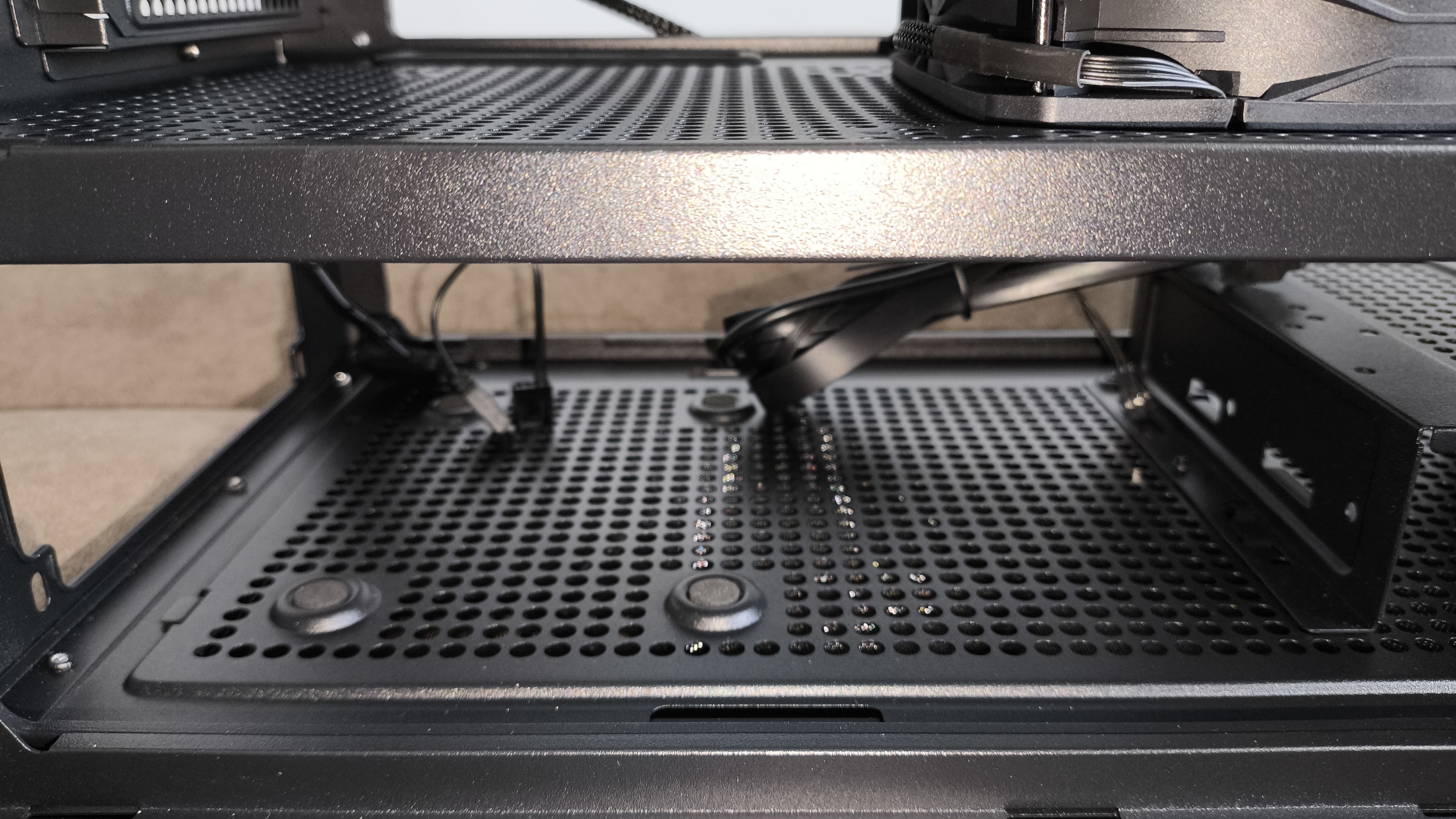 W dolnej części obudowy znajduje się osobna komora przeznaczona pod montaż zasilacza. Owa 'piwnica’ na zasilacz jest perforowana z obu stron, co znacząco poprawia przepływ powietrza. Dzięki temu komponent ten może pracować w możliwie jak najbardziej optymalnych warunkach termicznych.