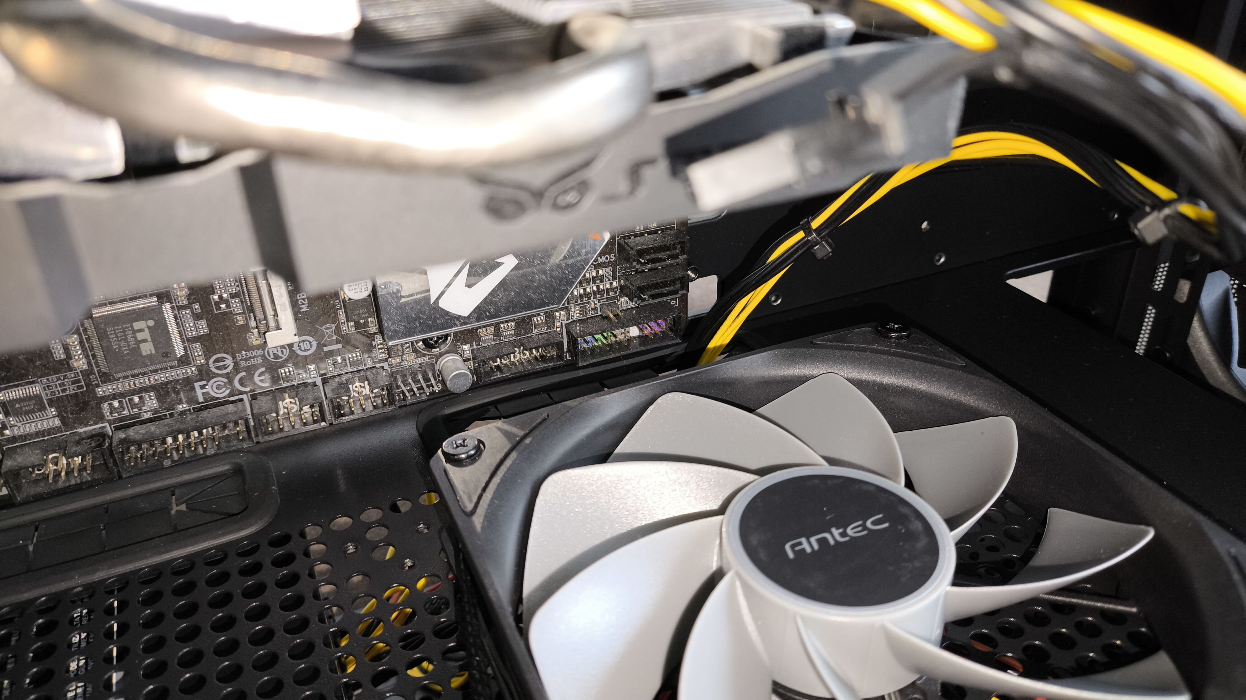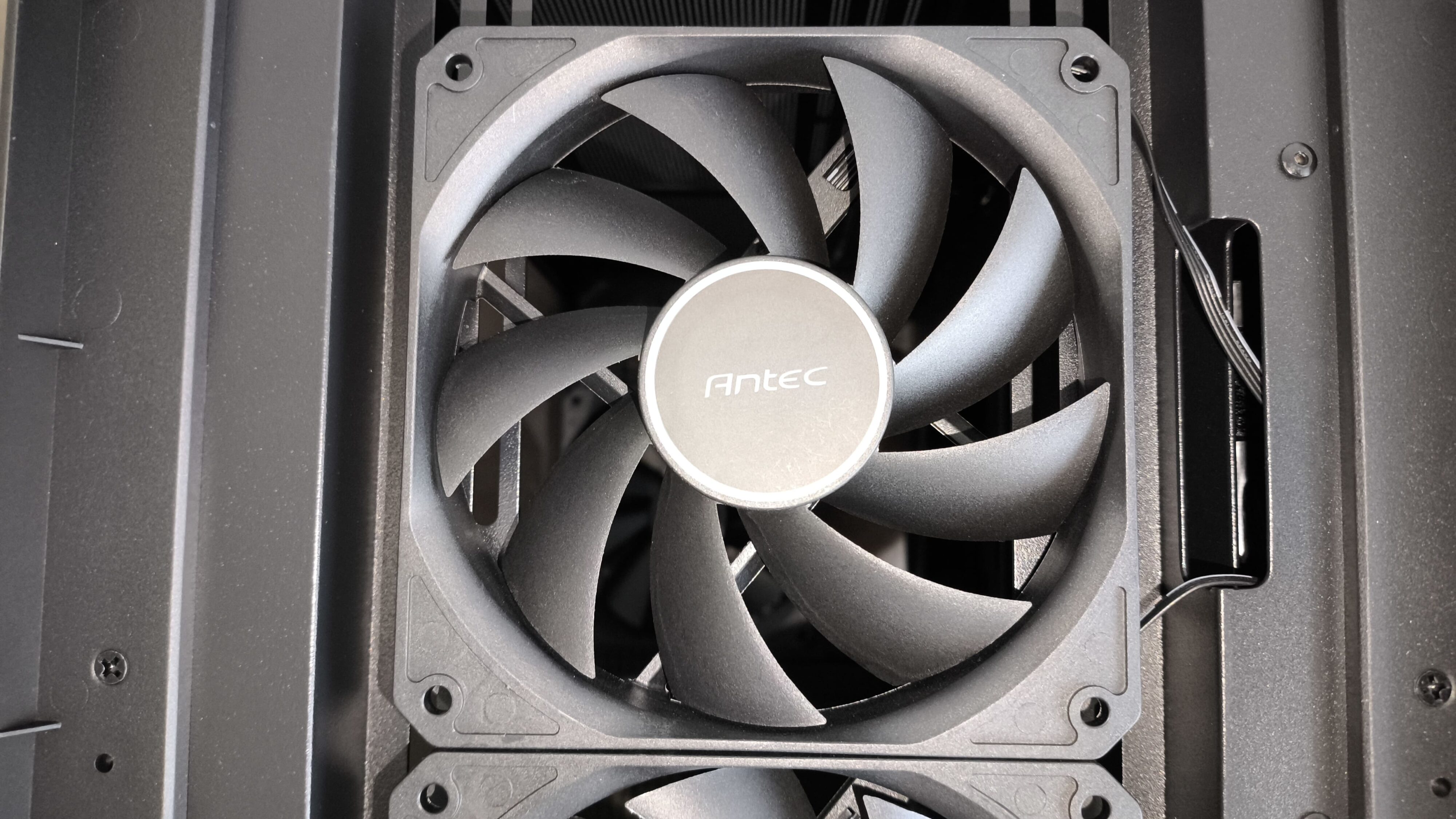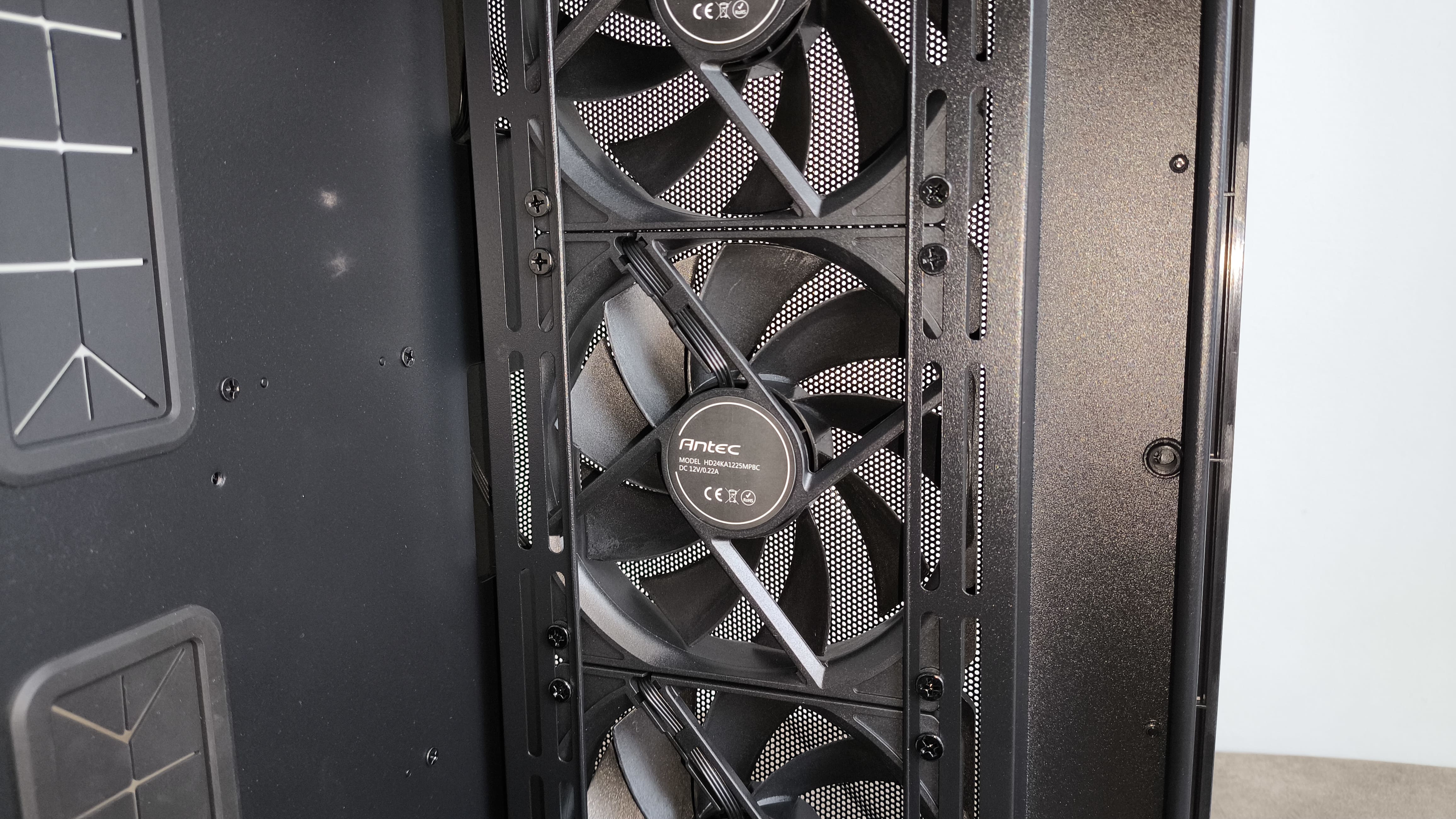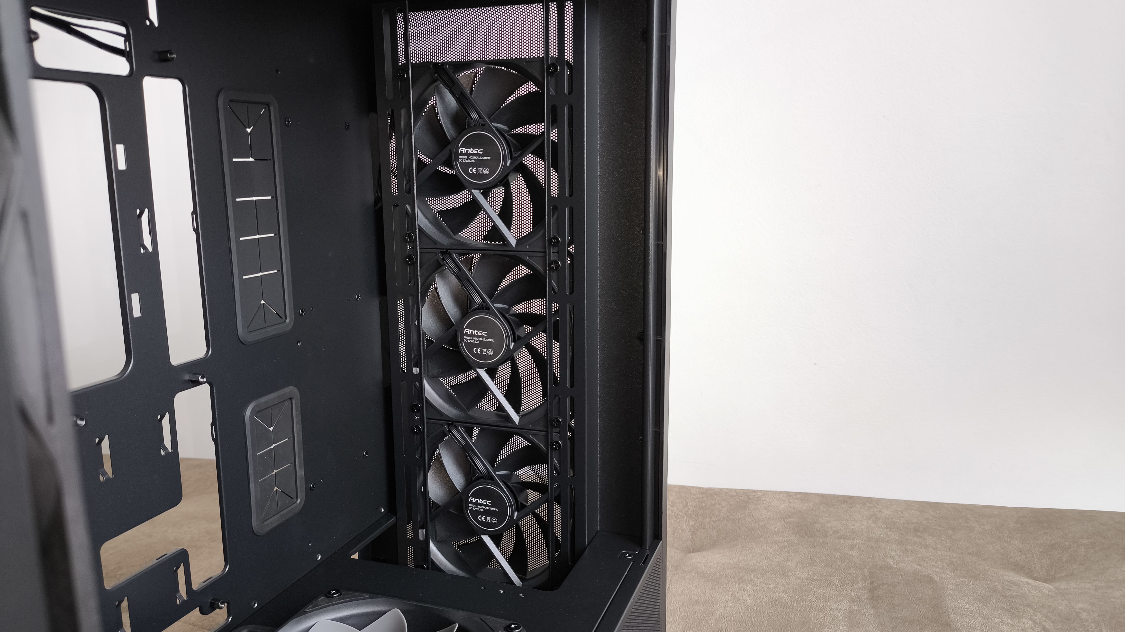 Z przodu obudowy zamontowano trzy wentylatory o średnicy 120 mm. Są to konstrukcje z łożyskami hydraulicznymi (Hydraulic Bearing), które cechują się dobrą kulturą pracy i nadal znośną głośnością przy średnim RPM (> 1100 / +- 46 dBA).