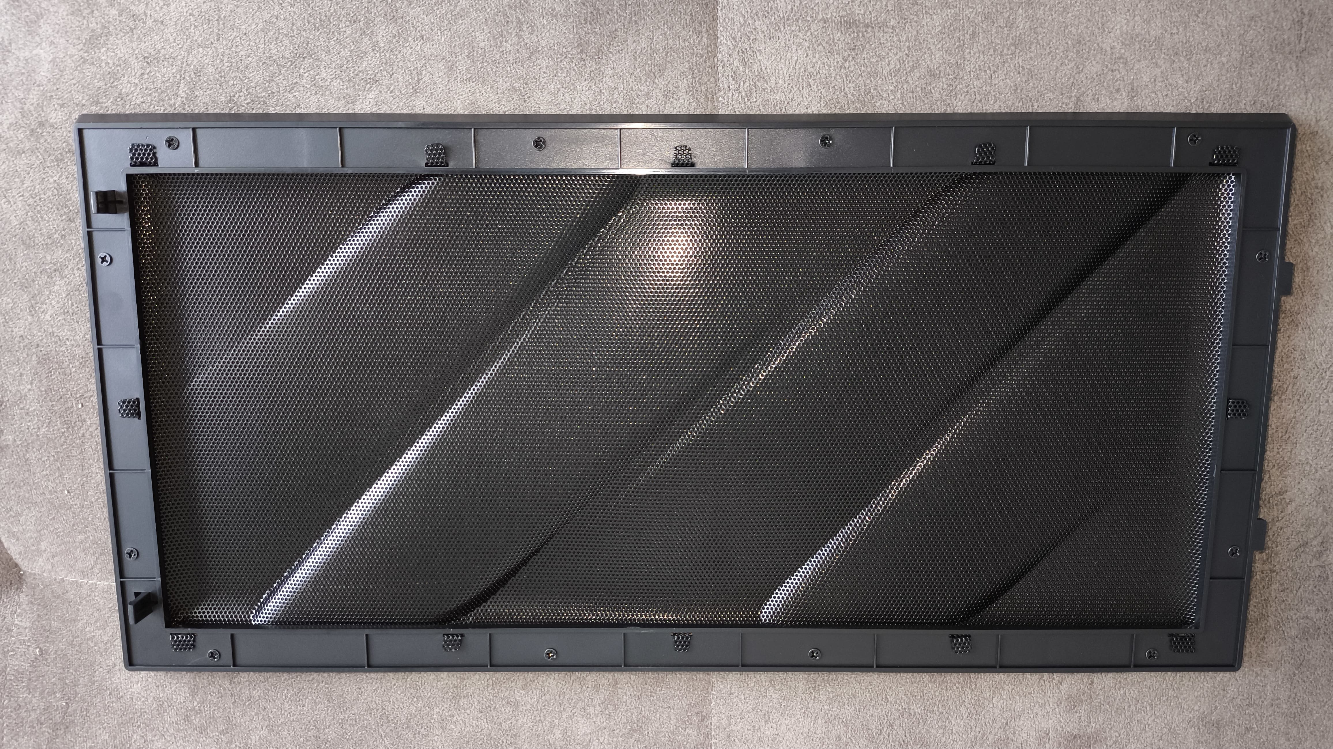 Magnetyczny panel-filtr frontowy oraz wpinany panel-filtr górny nie posiadają klasycznych filtrów materiałowych/magnetycznych, ale dzięki swojej strukturze siatki mesh skutecznie zatrzymują kurz, a ich czyszczenie jest wyjątkowo proste – wystarczy wilgotna ściereczka.
