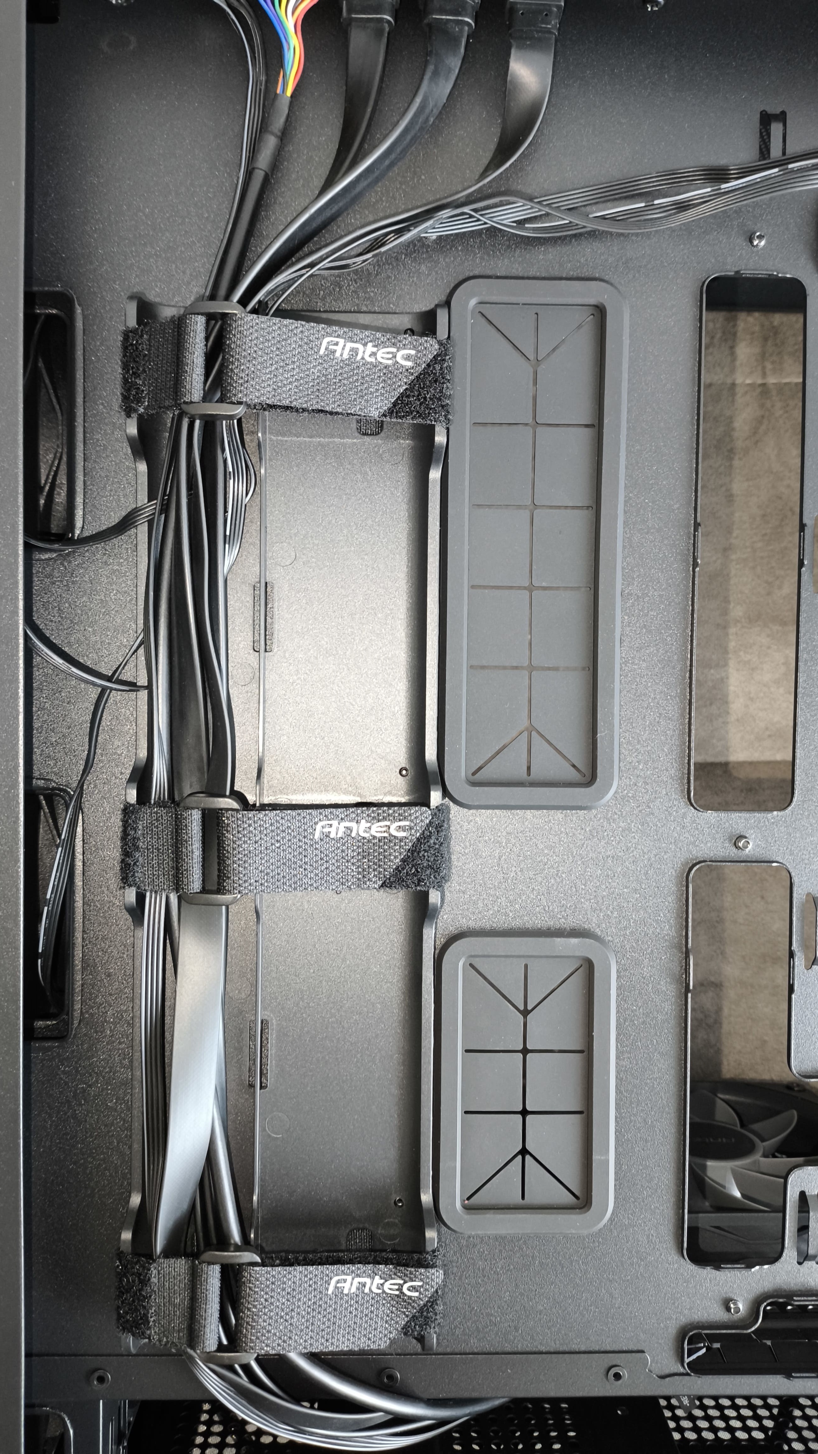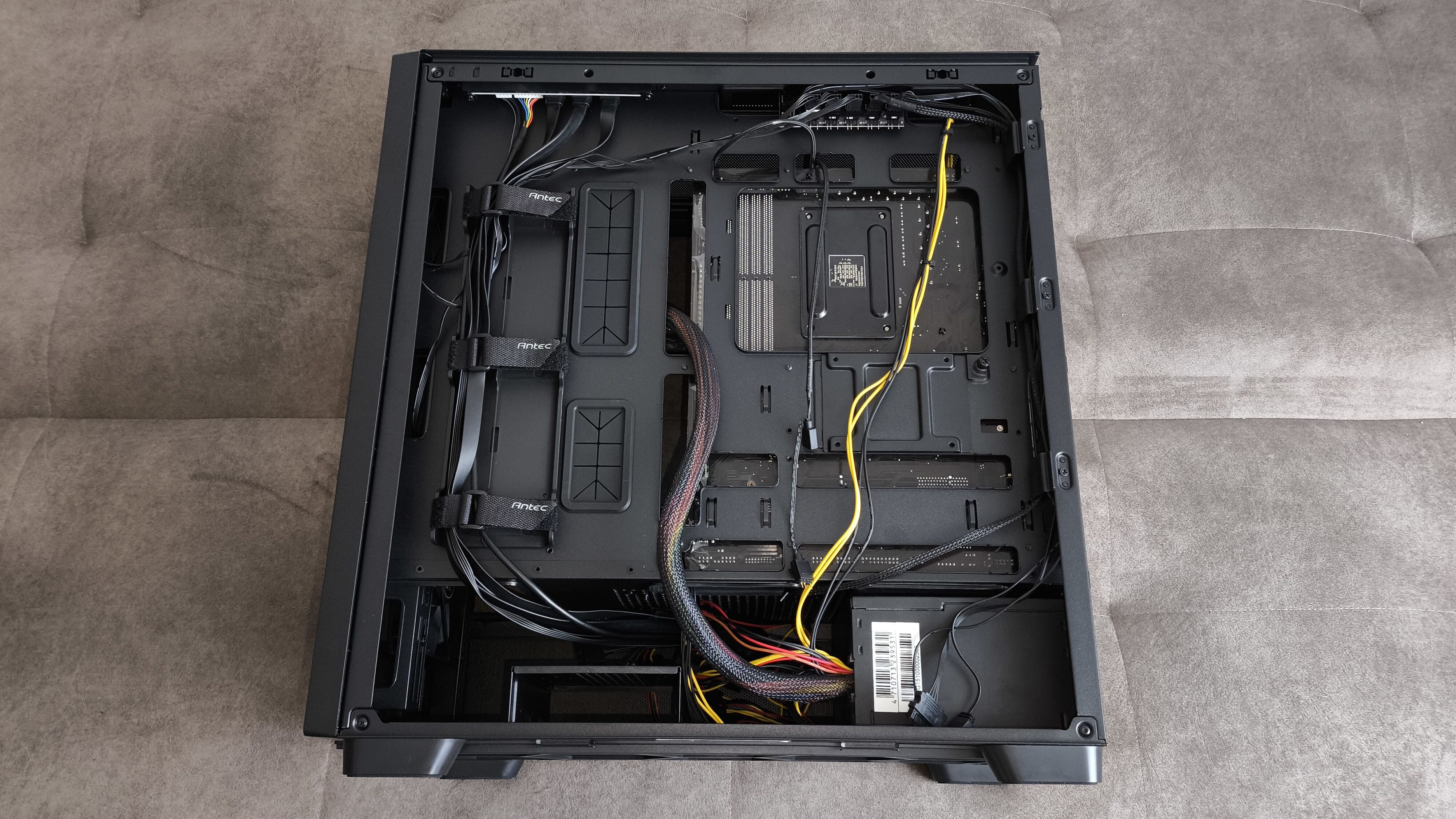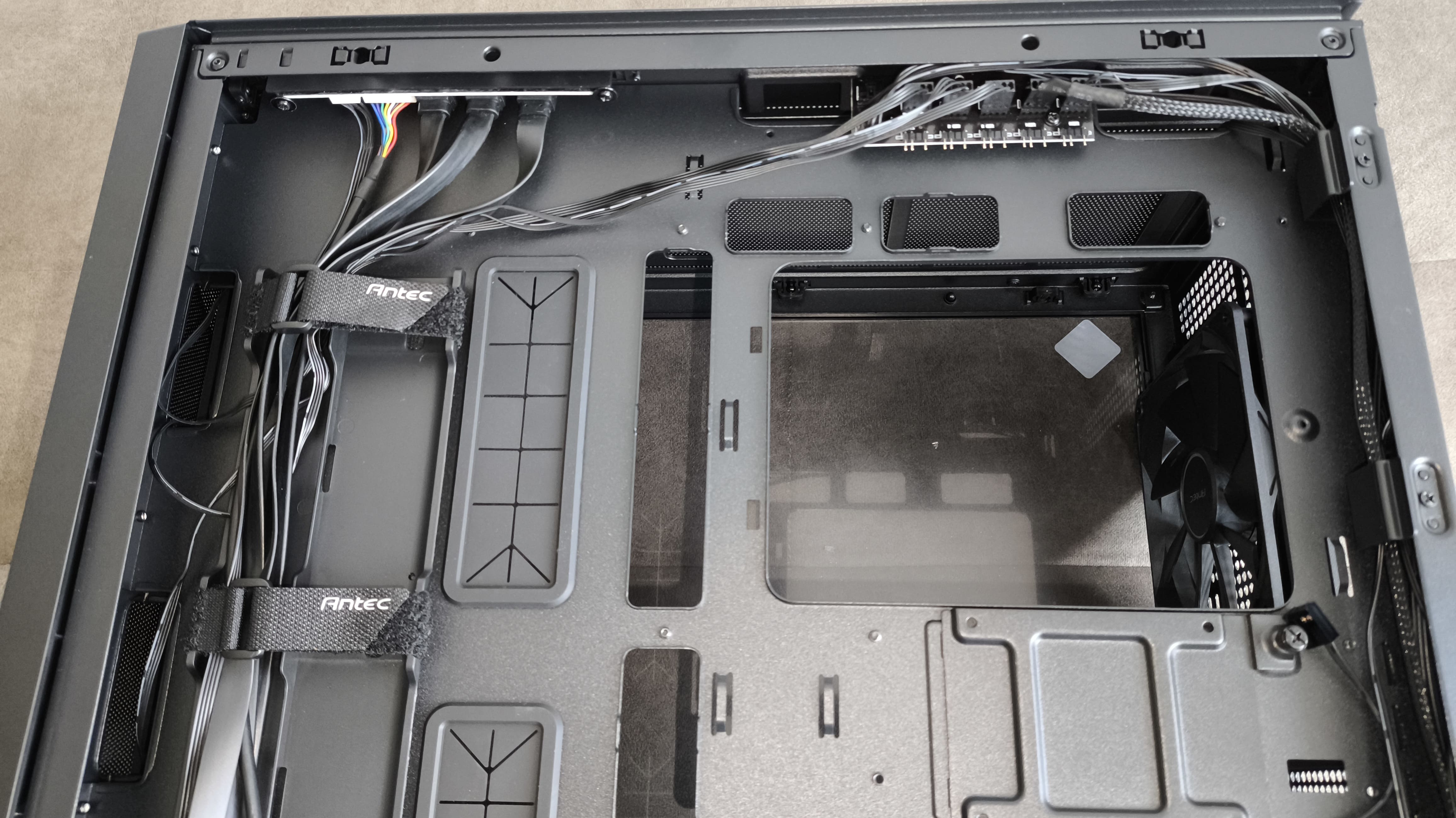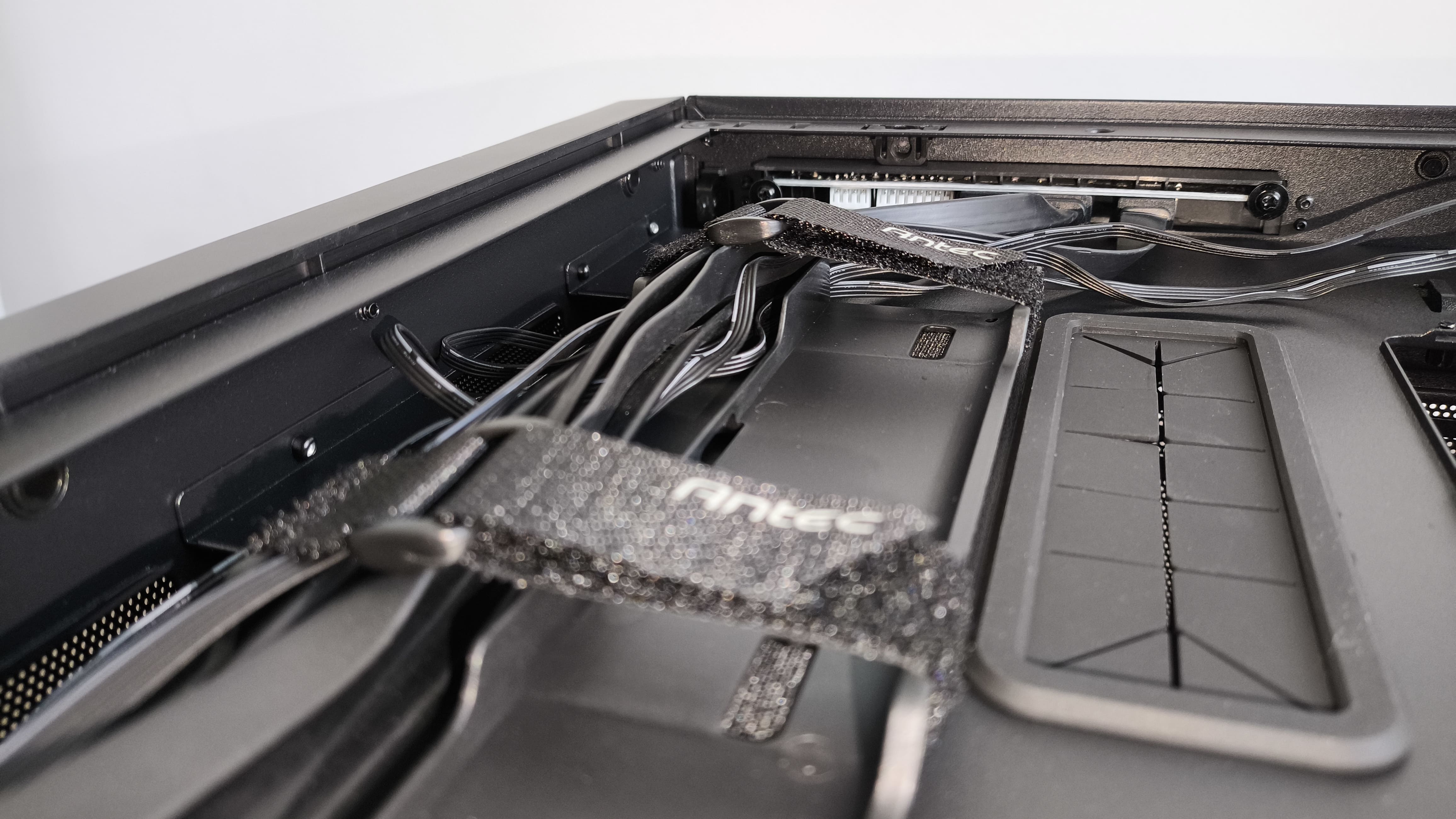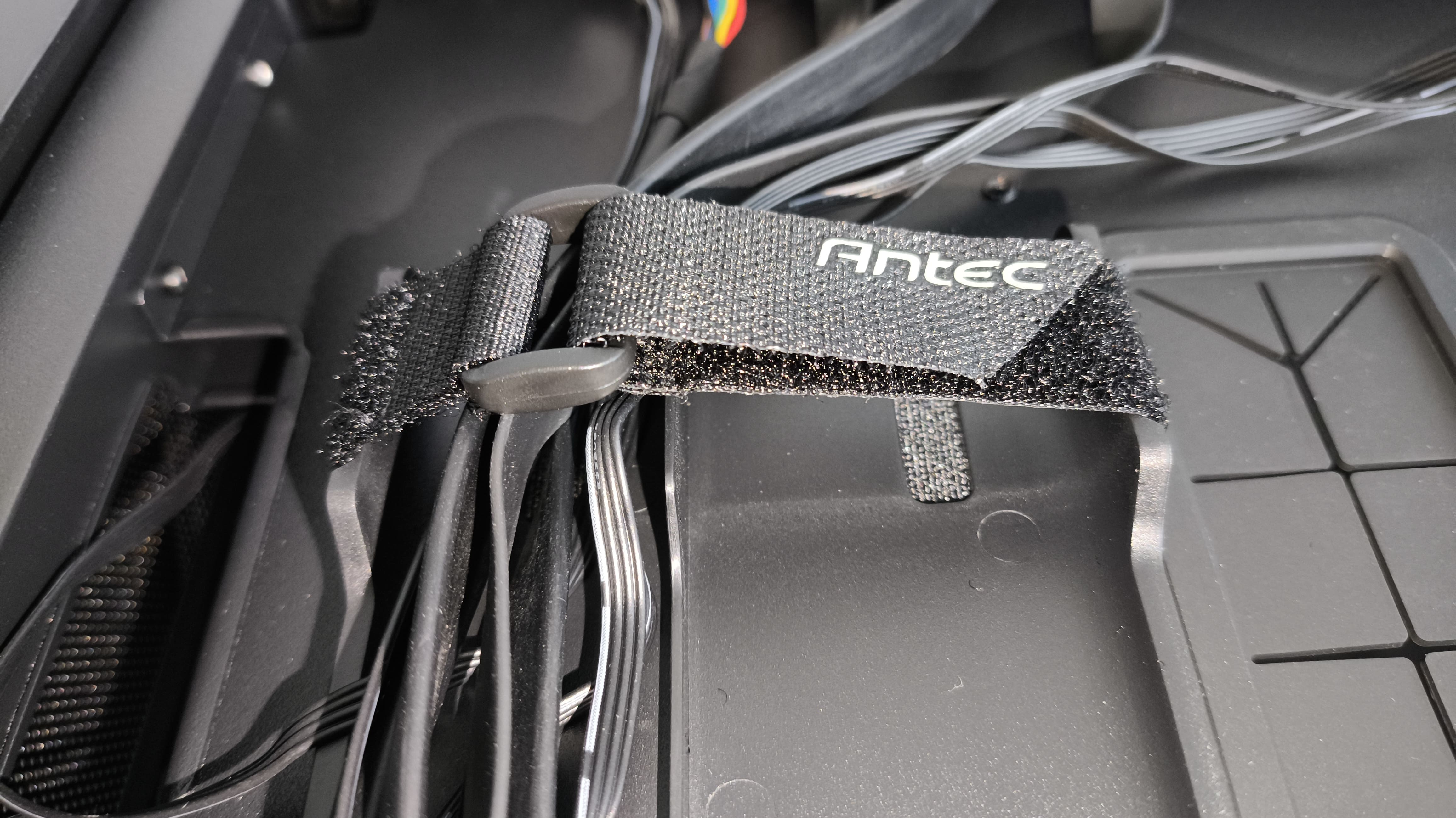 Jednym z mocnych punktów Anteca Flux jest także sposób organizacji okablowania. Z tyłu tacki montażowej znajduje się szeroki kanał z trzema dużymi opaskami rzepowymi, umożliwiający prowadzenie głównego okablowania 24-pin czy przewodów PCIe.