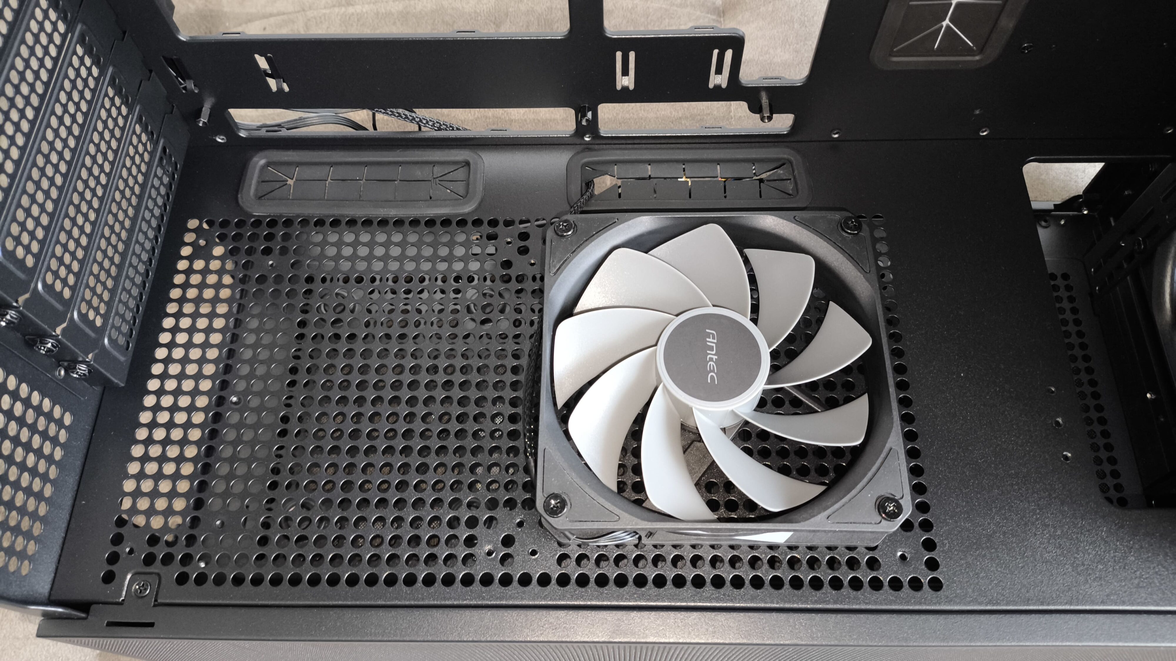 Ciekawym dodatkiem jest odwrócony wentylator 120 mm zamontowany bezpośrednio na osłonie zasilacza (tzw. reverse fan). Jego zadaniem jest aktywne wspomaganie cyrkulacji powietrza w dolnej części obudowy – głównie w obrębie karty graficznej i zasilacza.