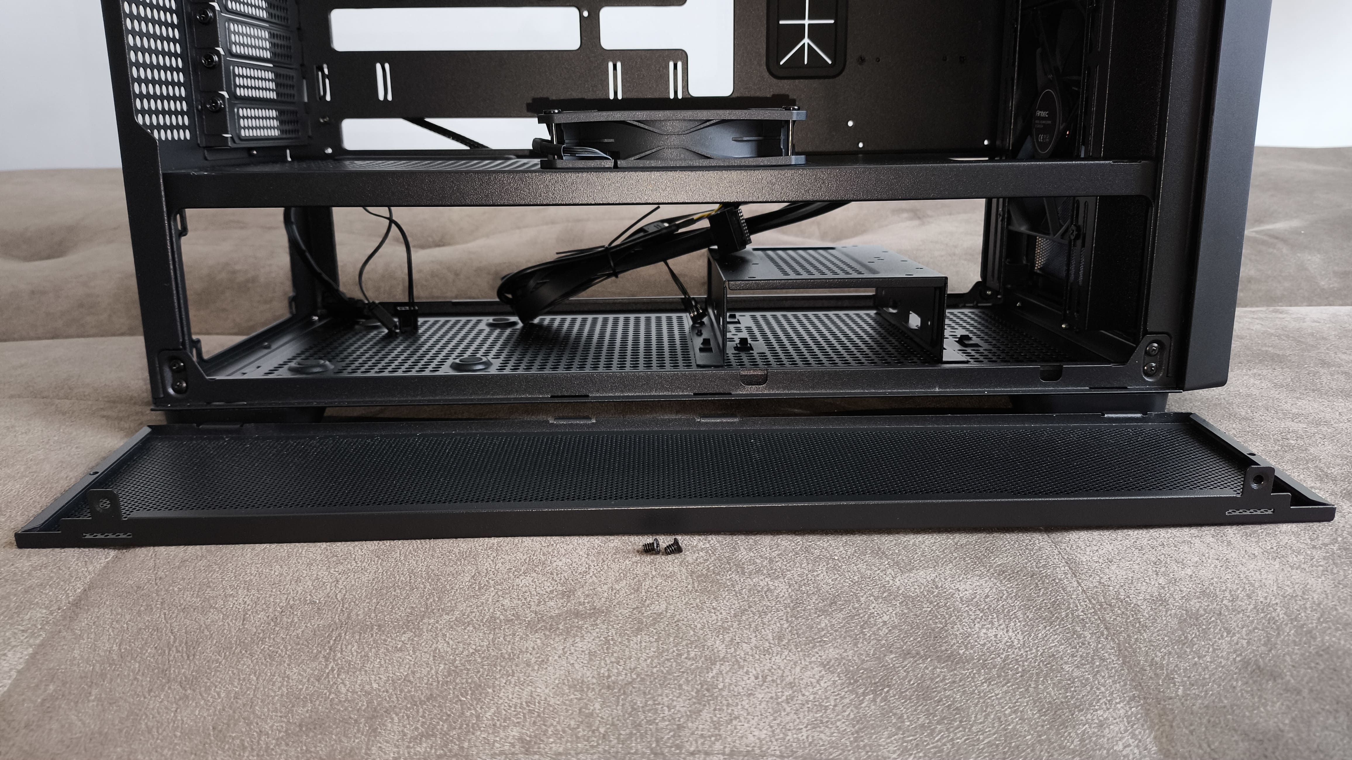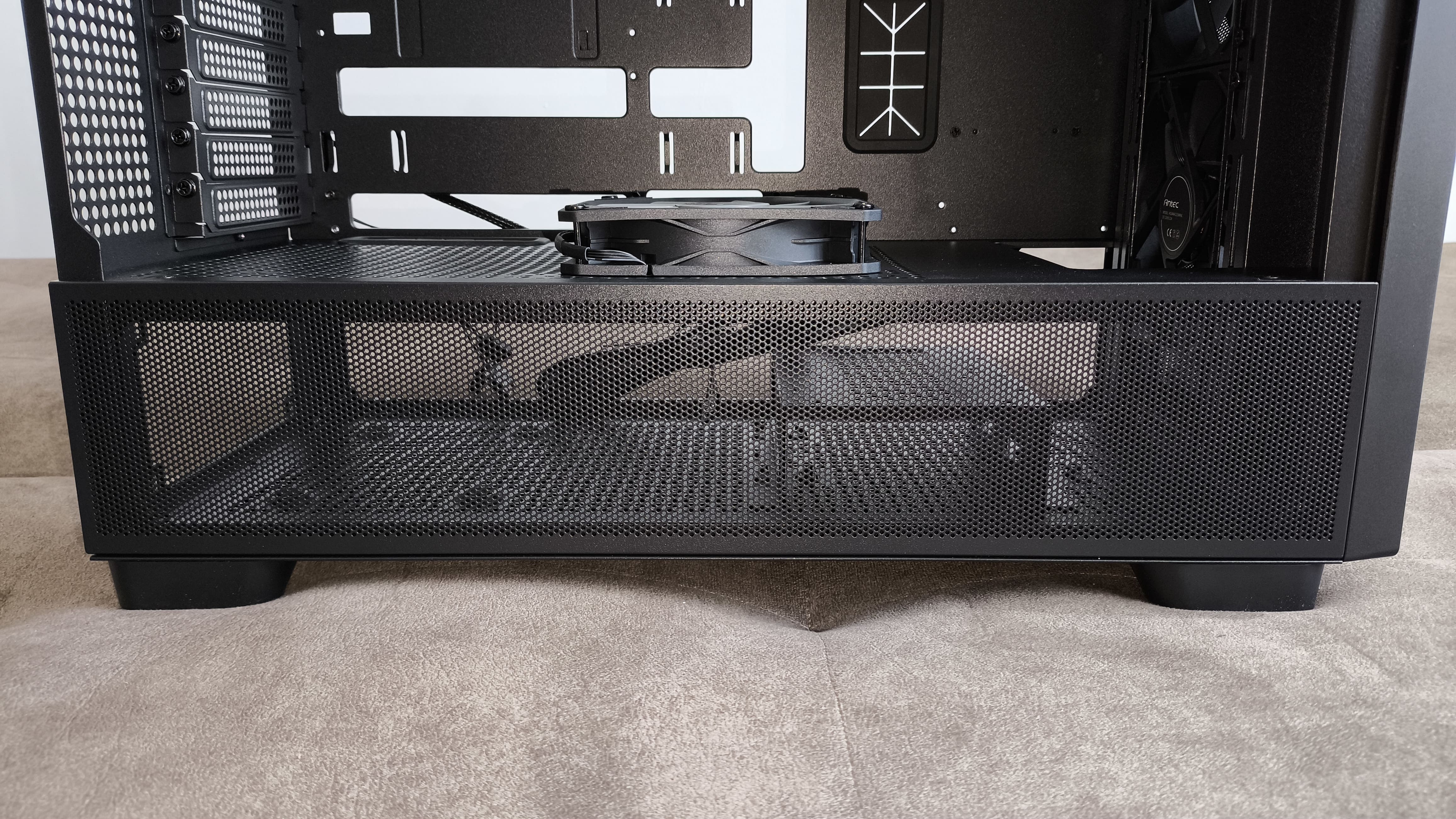 Na uwagę zasługuje również łatwy dostęp do PSU – dzięki odkręcanej osłonie piwnicy, użytkownik może swobodnie prowadzić kable zasilające, a duża przestrzeń wokół zasilacza (do 235 mm długości z zamontowaną klatką HDD) pozwala bez problemu zmieścić nawet dłuższe jednostki typu ATX. Dodatkowo umieszczony pod spodem, wysuwany filtr przeciwkurzowy umożliwia czyszczenie bez potrzeby przesuwania całej obudowy.