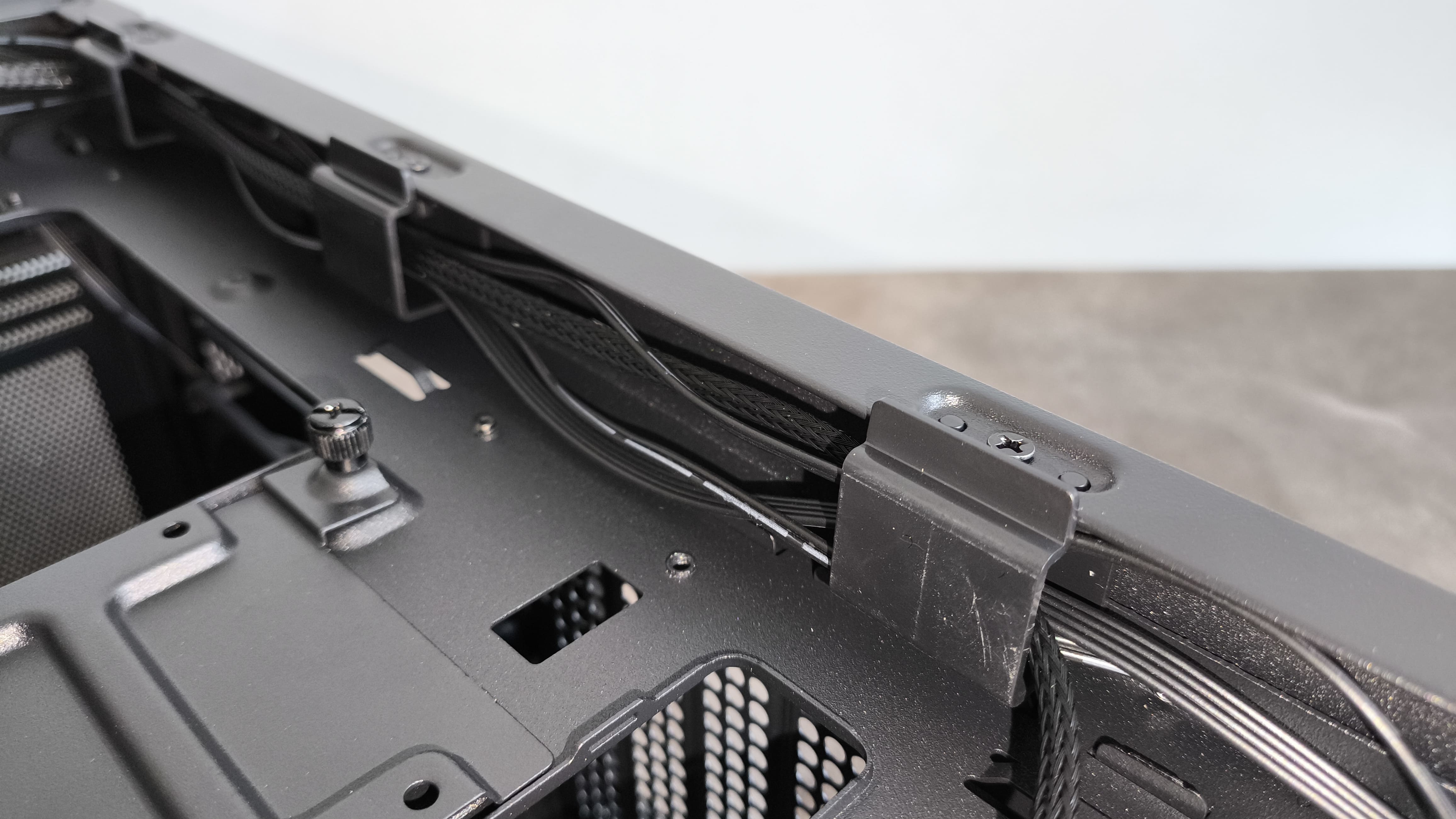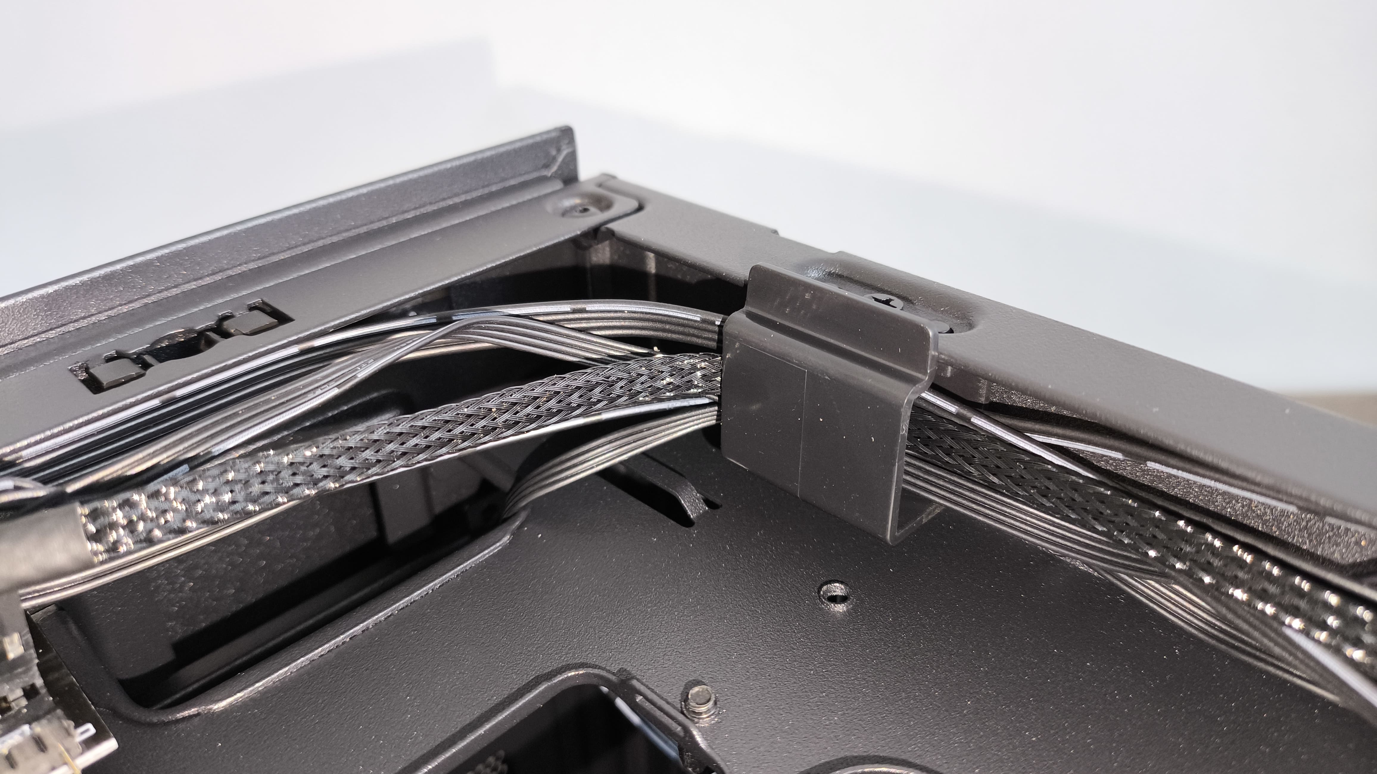 Zastosowanie gumowych przelotek (tzw. grometów) to kolejny plus. Te tutaj są nie tylko obecne, ale i bardzo dobrze rozmieszczone – także na dolnej krawędzi obudowy. Dodatkowe plastikowe klipsy oraz dwusegmentowy system prowadnic (zawiasów) ułatwiają trzymanie kabli w ryzach i poprawiają estetykę wnętrza.
