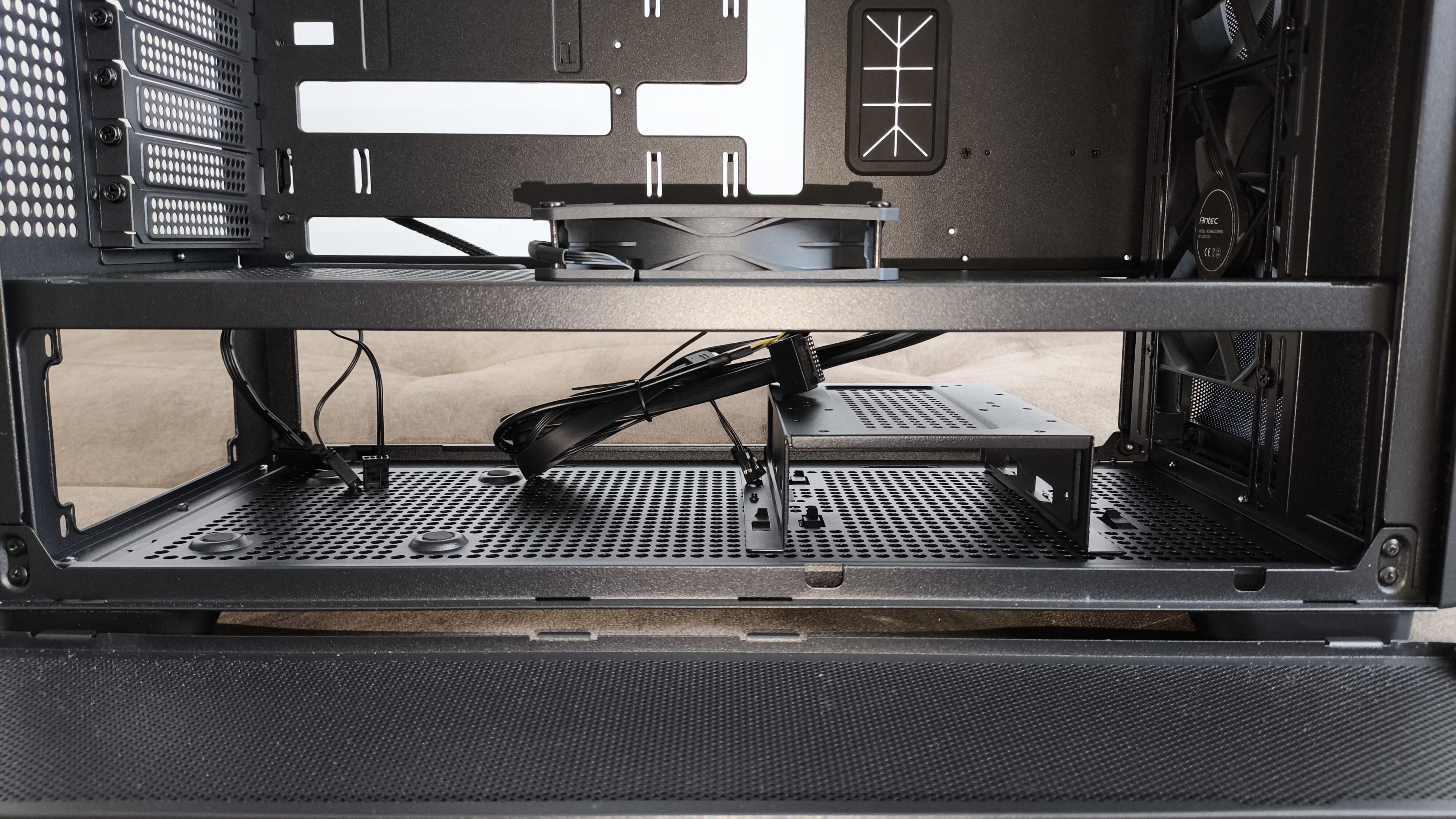 Na spodzie obudowy znajduje się klatka montażowa, która umożliwia instalację dwóch dysków twardych. Konstrukcja klatki jest modułowa – można ją wypiąć i przymocować w alternatywnym miejscu nad osłoną zasilacza, co daje sporą elastyczność w planowaniu przestrzeni wewnętrznej, zwłaszcza pod kątem zarządzania kablami lub montażu dłuższego zasilacza.
