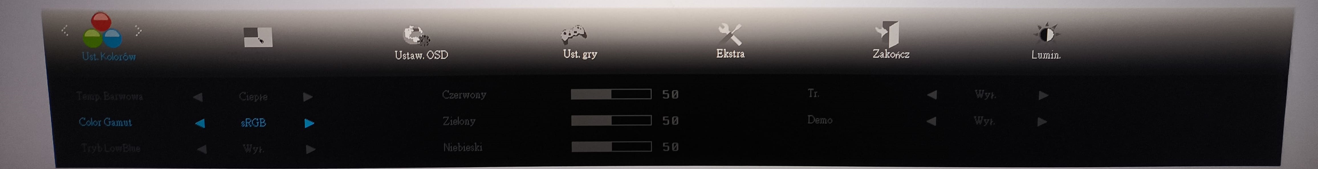 Przechodząc do ustawień kolorów możemy zmienić temperaturę barwową wybierając jeden z trzech gotowych profili (ciepły, normalny lub zimny) lub skorzystać z trybu użytkownika, w którym ręcznie dostosowujemy nasycenie kolorów. Dodatkowo w opcji kolor gamut można aktywować tryb sRGB.