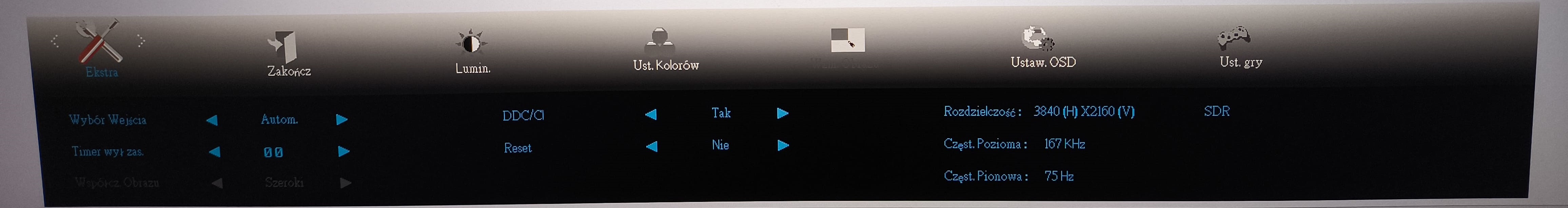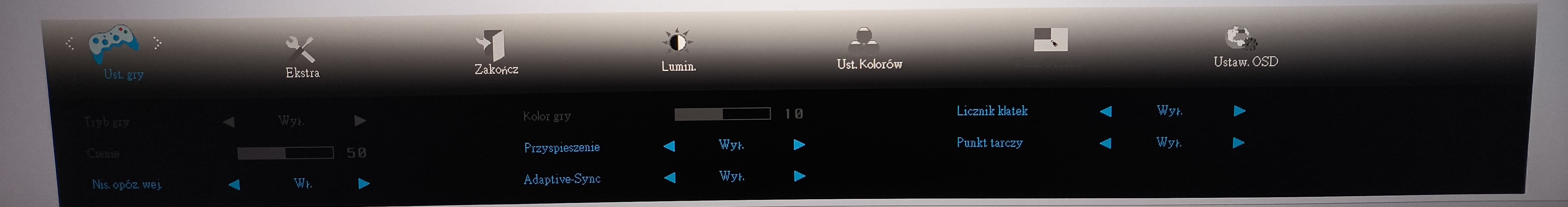 Menu monitora jest przejrzyste i funkcjonalne, a dodatkowo mamy możliwość zmiany języka interfejsu na polski. W sekcji ustawień iluminacji możemy dostosować najważniejsze parametry obrazu, takie jak kontrast, jasność, gamma, funkcje DCR, tryb HDR, a także wybrać jeden z predefiniowanych profili, m.in. tekst, internet, gra, film, sport, czytanie oraz uniformity.