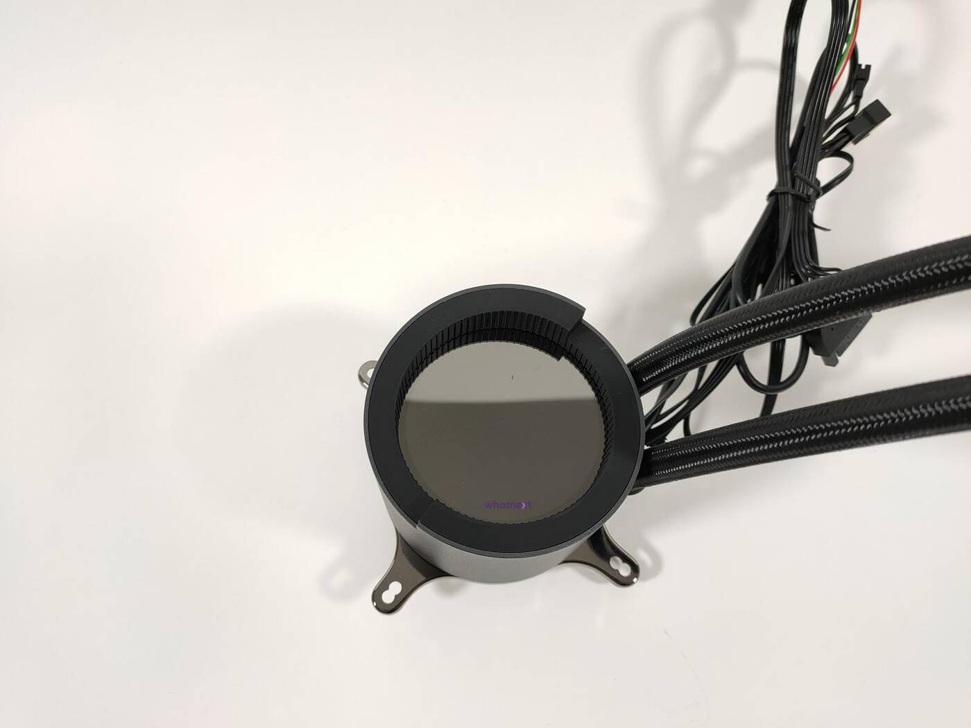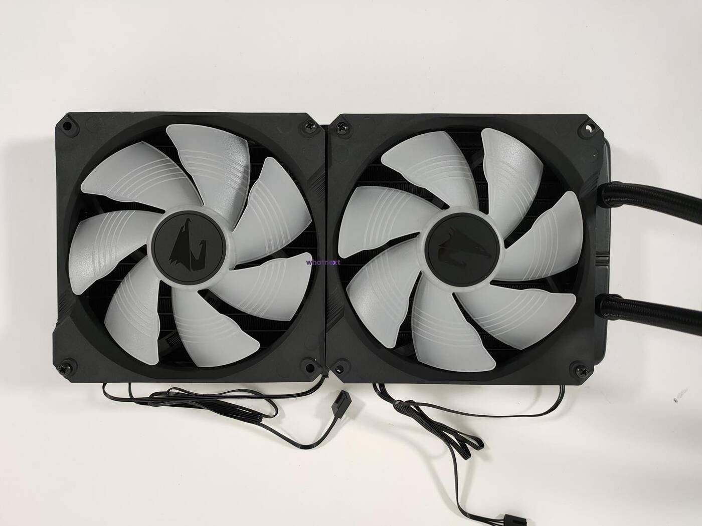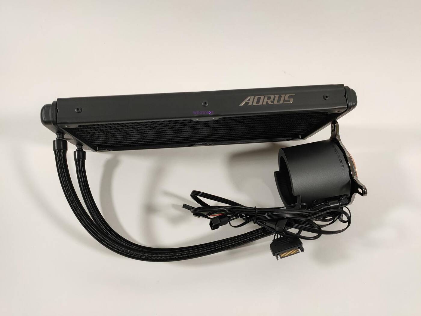 Zacznijmy od wspólnych rzeczy obu modeli. Blokopompka jest całkiem spora bowiem ma wymiary 80 x 80 x 60 mm. Na górze znajduje się wyświetlacz LCD 60 x 60 mm (320 x 320 px). Możecie na nim wyświetlić temperaturę procesora, jego nazwę, taktowanie, własny tekst czy obrazek. W obudowie z oknem będzie to naprawdę świetnie wyglądało. Możecie tym sterować za pomocą odpowiedniego oprogramowania Aorus. Podstawa blokopompki jest miedziana. Maksymalna prędkość pompki wynosi 2700 RPM. Z całości wychodzi sporo kabli. Do nich podłączacie przewody od wentylatorów a całość podłączacie do złącza SATA od zasilacza oraz USB 2.0 na płycie głównej. Dopiero wtedy będziecie mogli sterować podświetleniem oraz prędkościami wentylatorów. Węże mają długość 380 mm i są całkiem elastyczne – nie będziecie mieli problemów z ich dopasowaniem do obudowy.