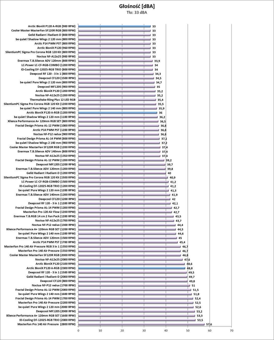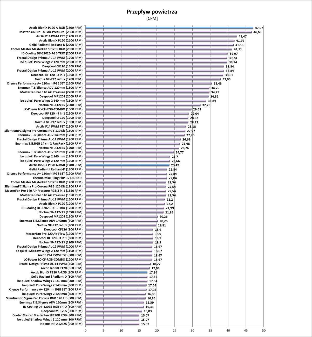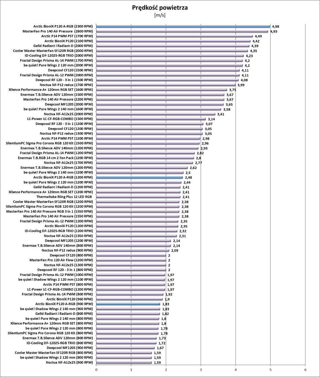Wentylator wypadł fantastycznie w testach. Na maksymalnych obrotach jest on dosyć głośny, ale nie jest tak źle w porównaniu do konkurencji oraz jest to najwydajniejsze śmigło w naszym zestawieniu. Na 1200 RPM jest już prawie idealna cisza, a przy tym przepływ powietrza to czołówka wśród konkurencji skręconej na te obroty. Na 900 RPM jest już idealna cisza, a przepływ powietrza nadal pozostaje na bardzo dobrym poziomie.
