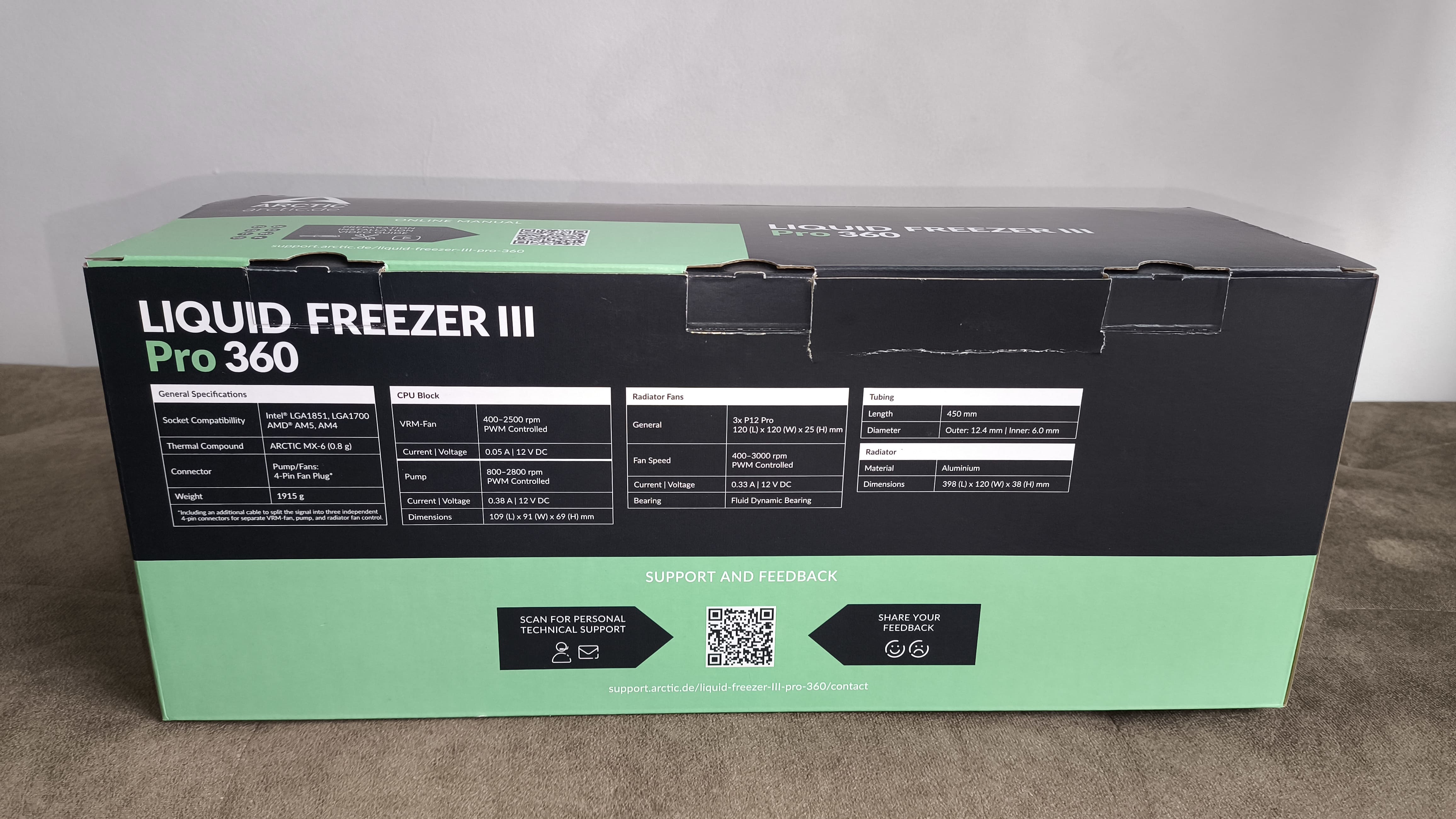 Zewnętrzne pudełko, choć wizualnie nieco zmienione względem poprzednich produktów Arctic, nadal utrzymane jest w charakterystycznej dla producenta stylistyce, tym razem z wyraźniejszym akcentem kolorystycznym. Na froncie znalazła się grafika przedstawiająca chłodzenie Liquid Freezer III Pro 360 wraz z informacjami o obsługiwanych podstawkach CPU, sześcioletniej gwarancji oraz dołączonej paście termoprzewodzącej Arctic MX-6.