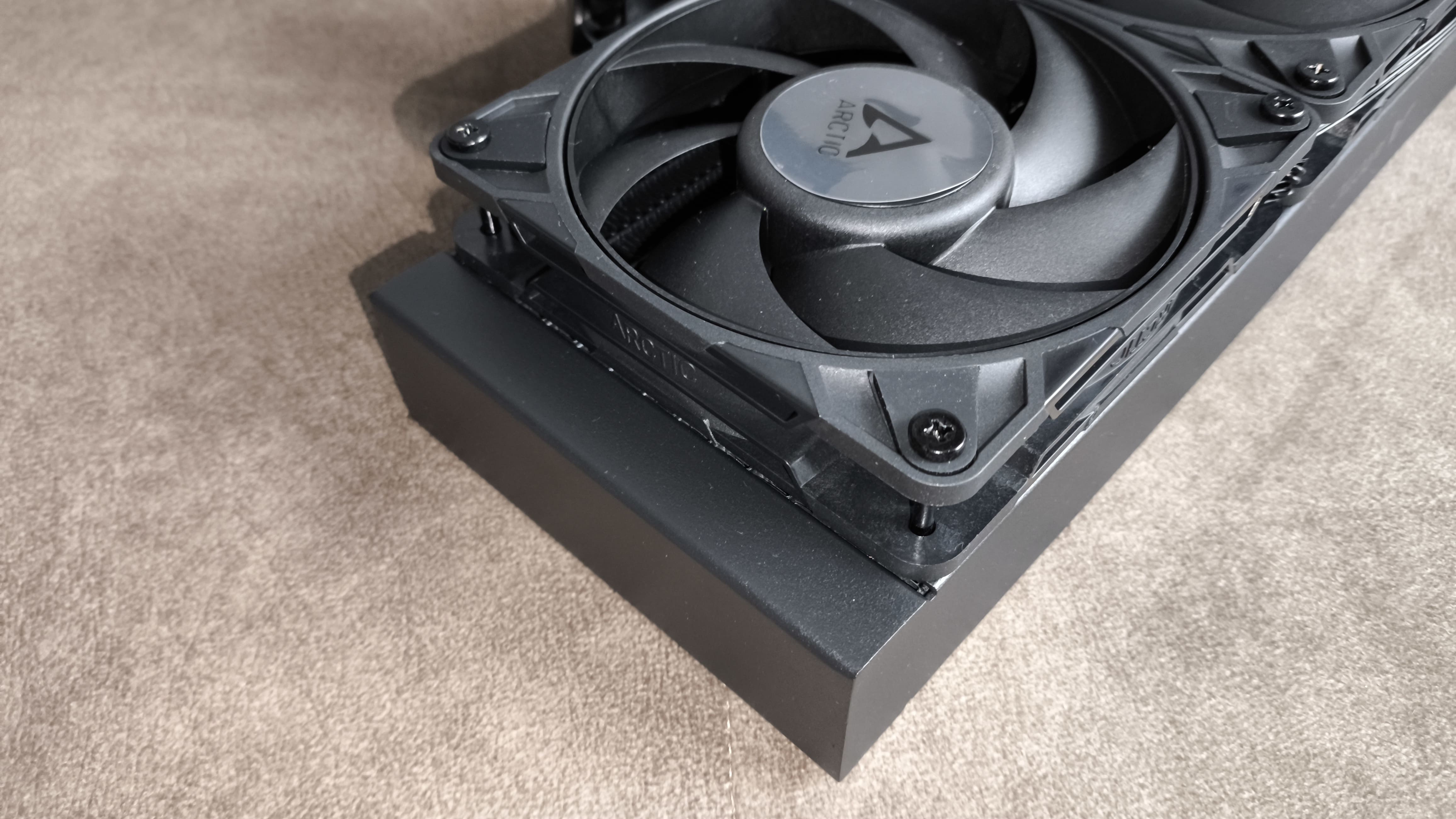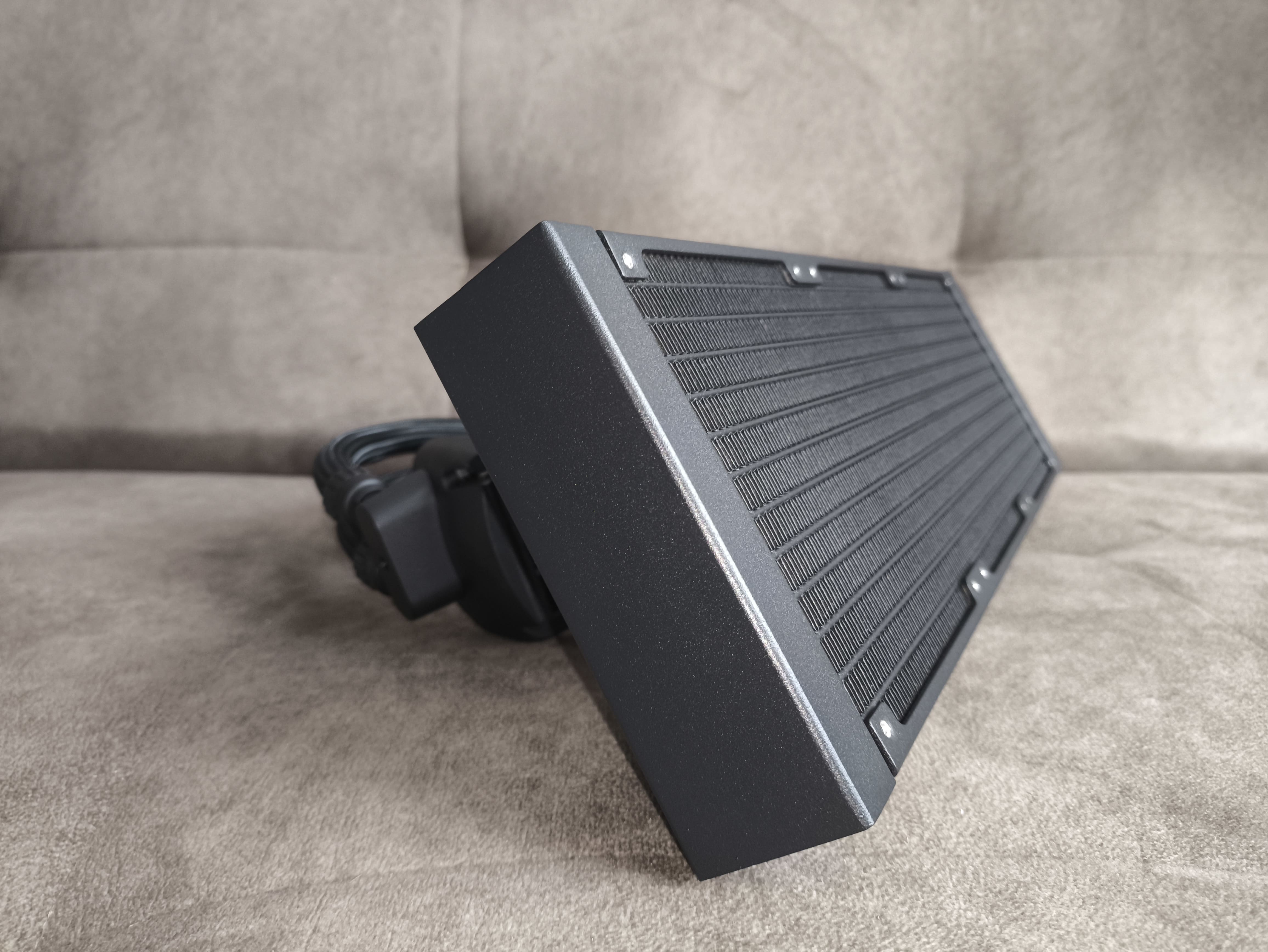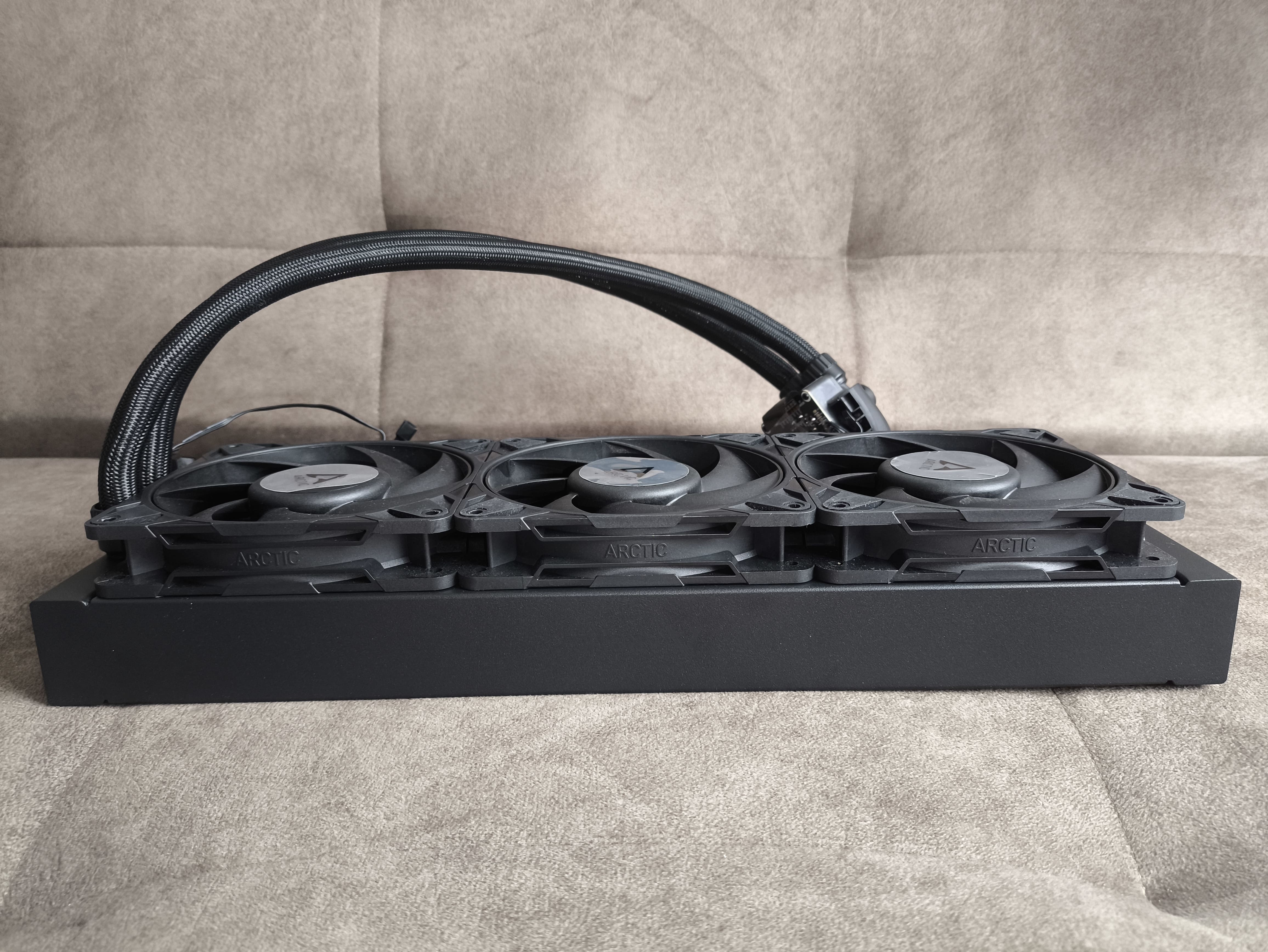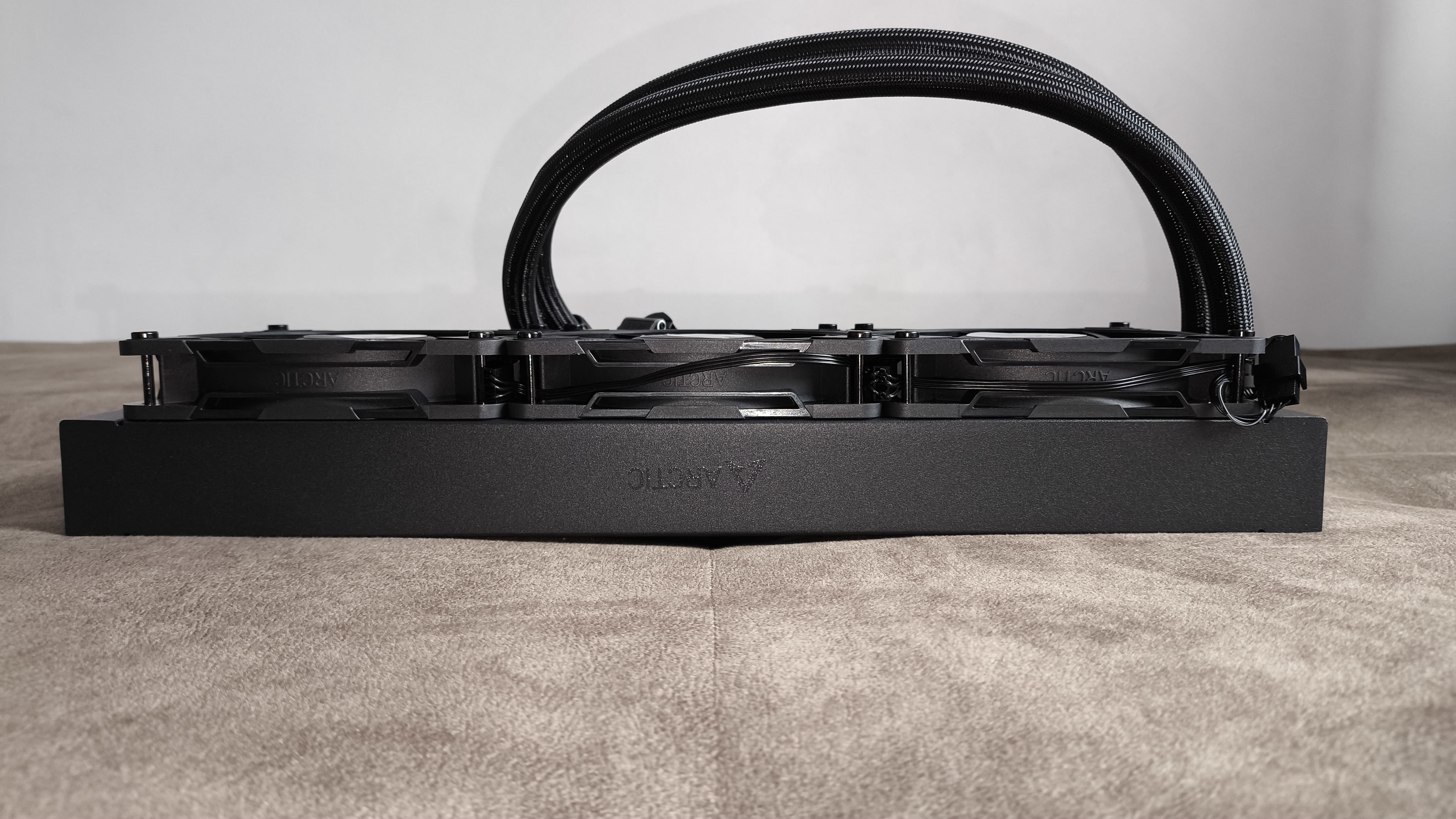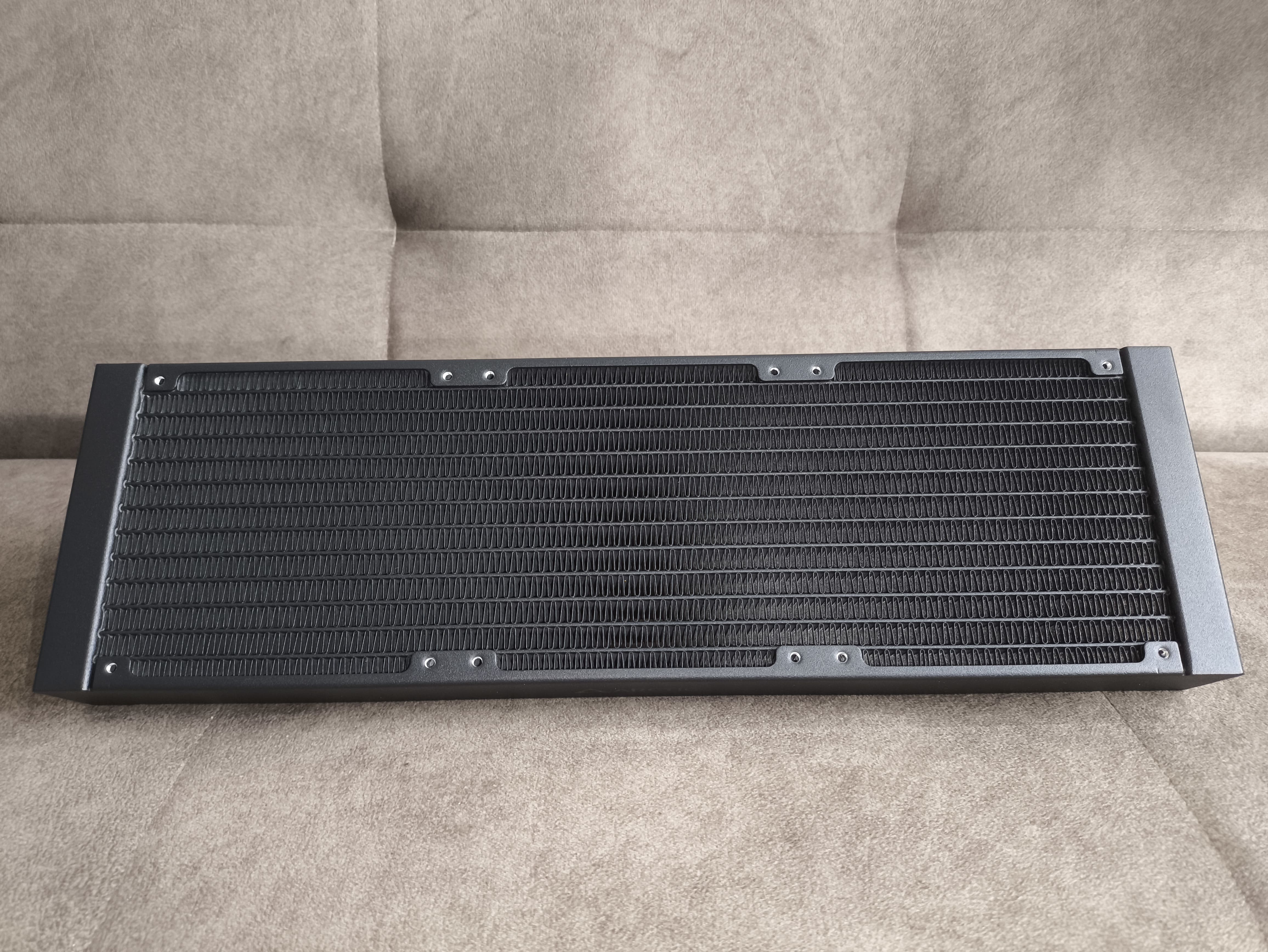 Mimo że Arctic Liquid Freezer III Pro 360 wciąż korzysta z aluminiowego radiatora (o wymiarach 397 × 120 × 38 mm), to całość sprawia znacznie bardziej prestiżowe wrażenie niż większość konkurencyjnych rozwiązań. Blok jest wyczuwalnie masywny, a jego bardziej kanciasta forma dobrze leży w dłoniach. Innymi słowy, grubość na poziomie 38 mm jest tu bardzo wyraźna i znacząco odróżnia konstrukcję od standardowych radiatorów o grubości 27 mm, spotykanych w standardowych zestawach AiO.