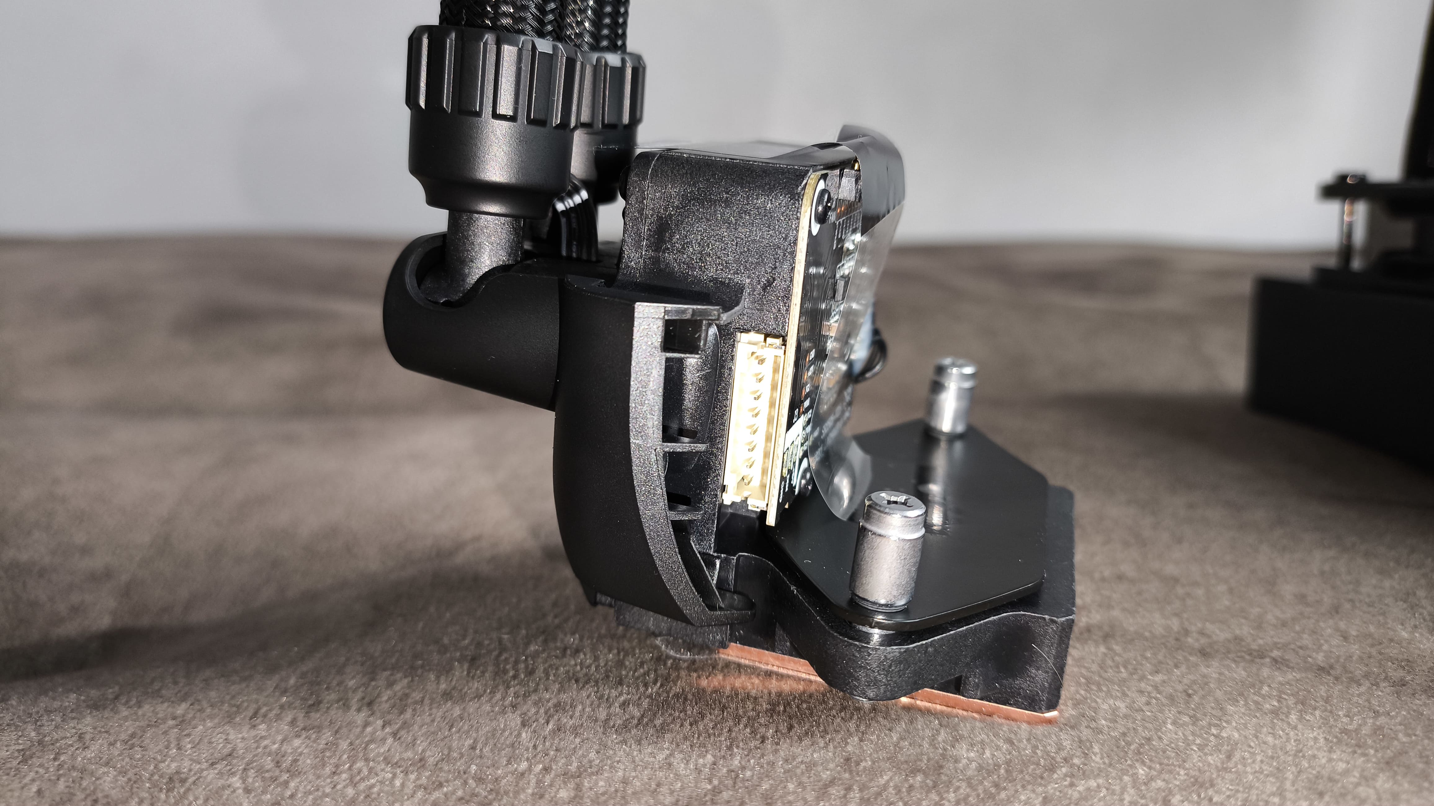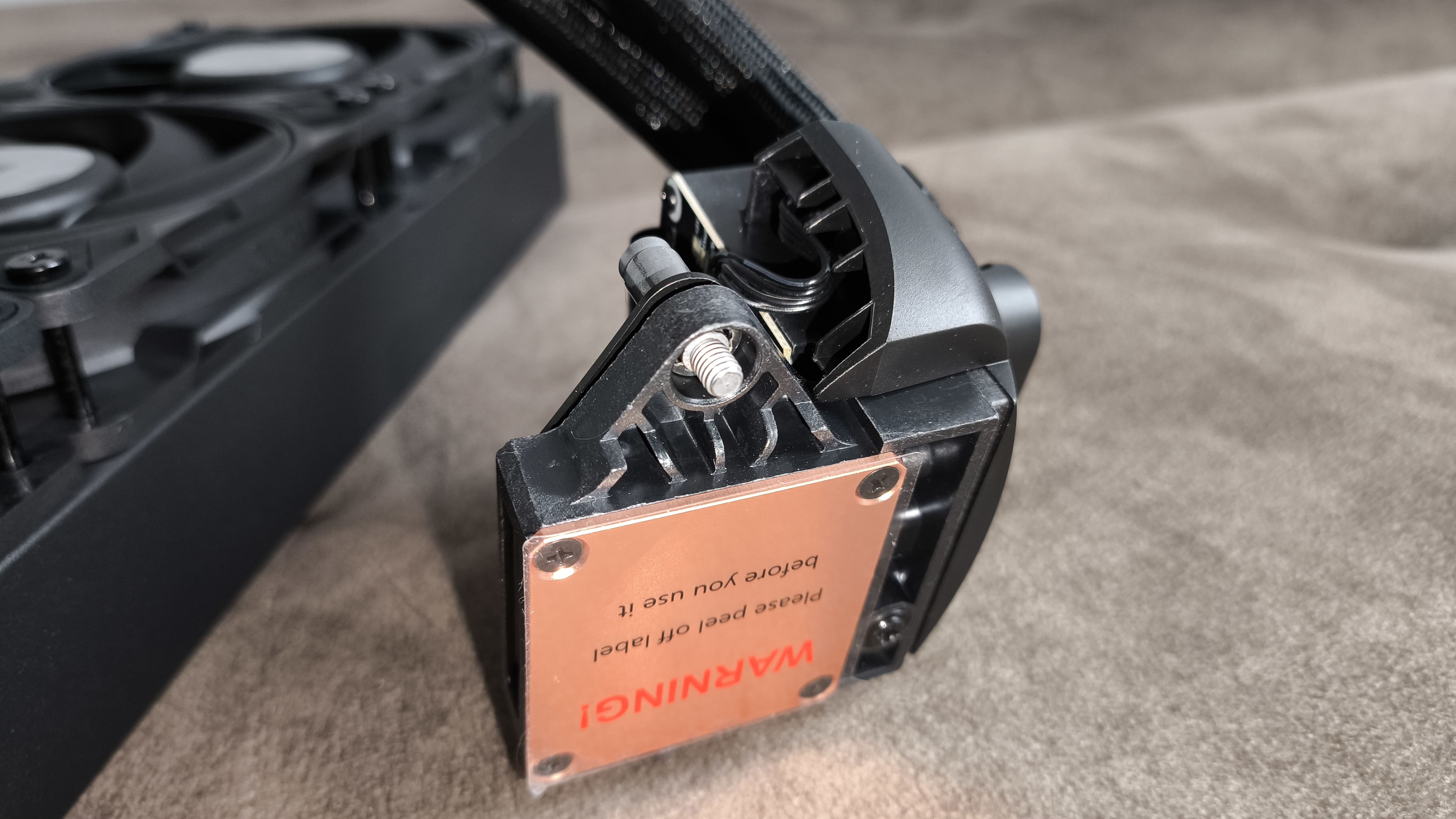 Układ pompki oraz miedzianej podstawy także odbiega od typowego projektu. Sama pompa została przesunięta, aby zrobić miejsce dla większego wentylatora VRM, poprawiającego przepływ powietrza w kierunku sąsiadujących komponentów. Montaż jest niezwykle prosty – wystarczy wsunąć całość na miejsce, gdzie utrzymywana jest dzięki magnesom.