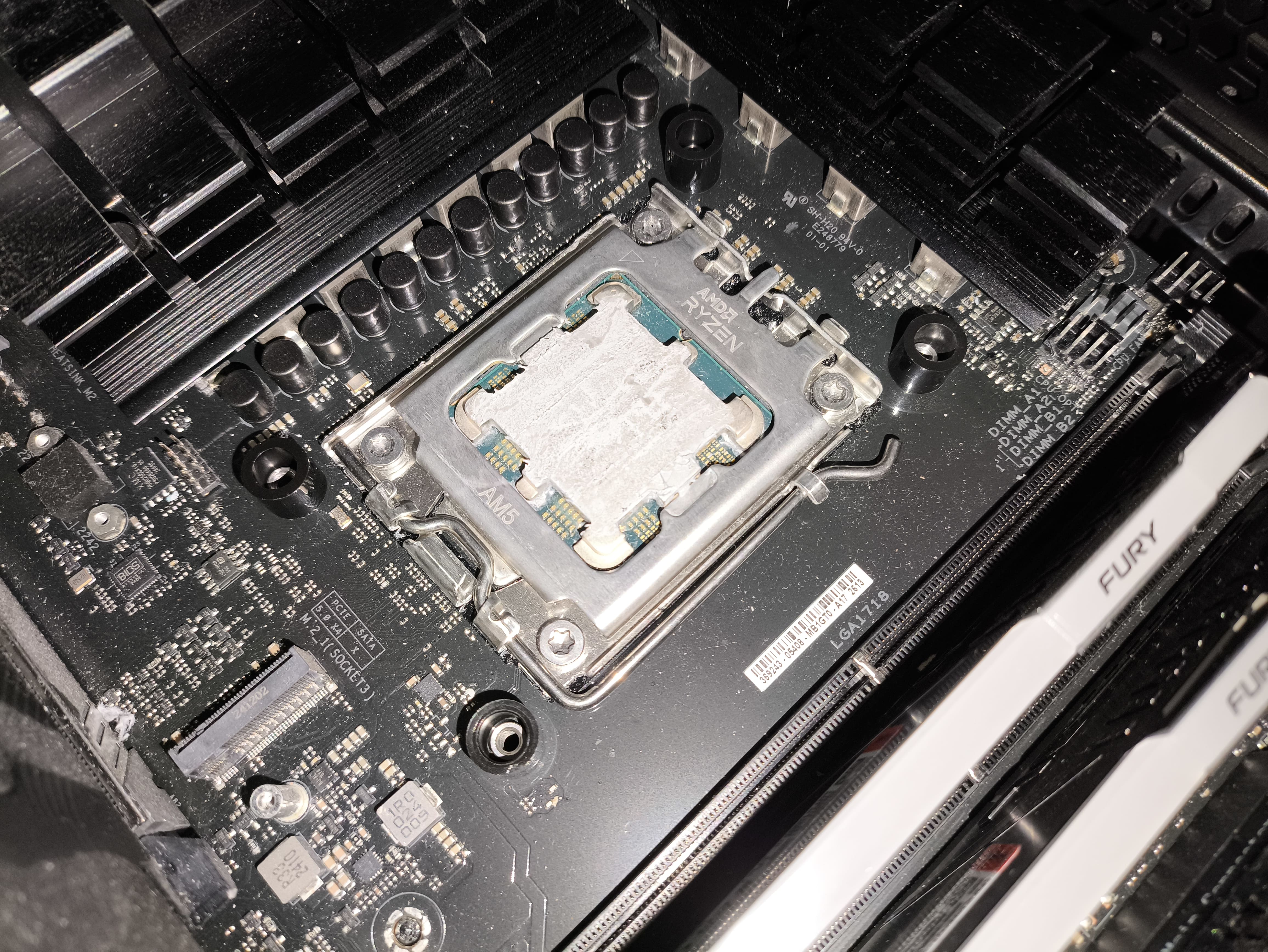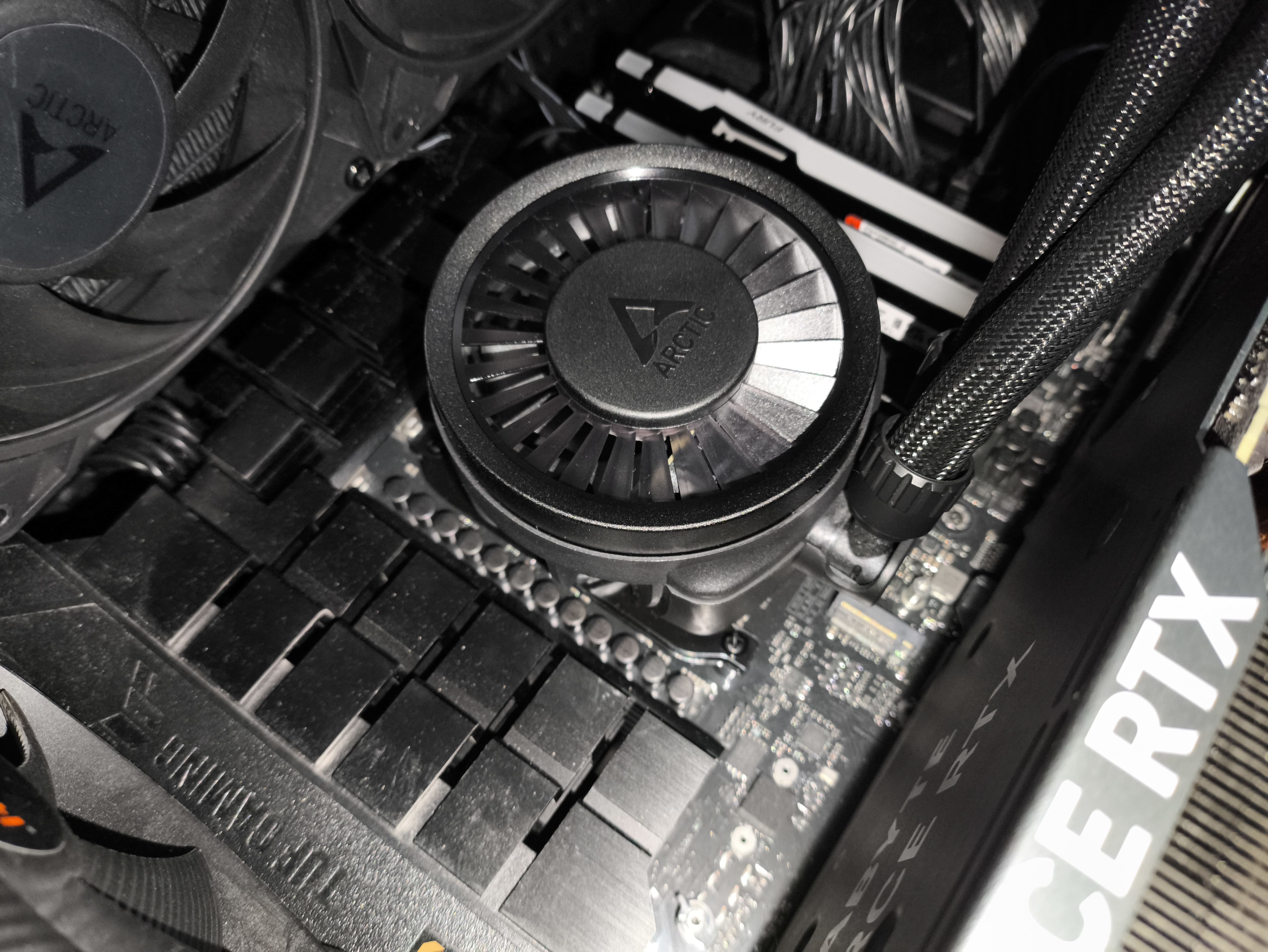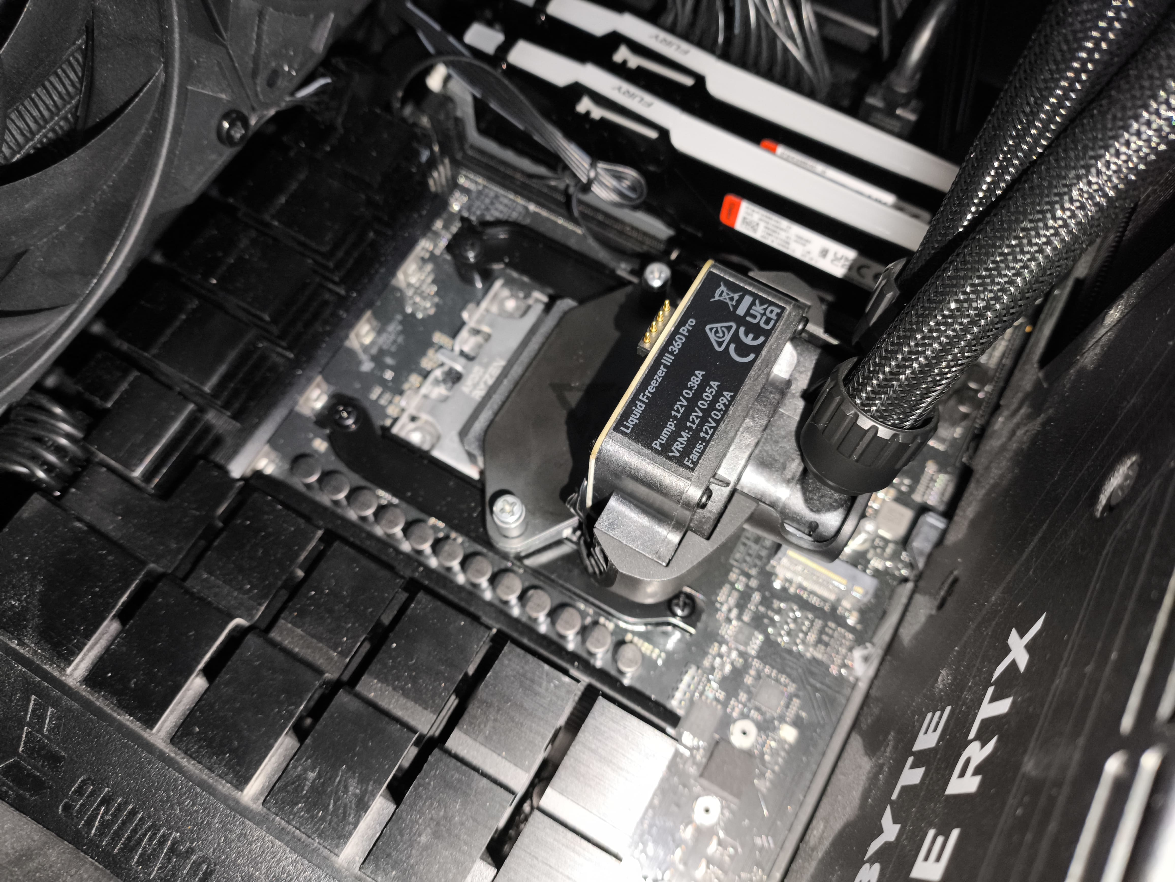 Po przygotowaniu systemu montażowego nakładamy pastę termoprzewodzącą – w testach posłużyła mi Cooler Master CryoFuze 7 – i osadzamy pompę na uchwytach, przykręcając ją równomiernie do płyty głównej. Kolejnym krokiem jest instalacja wentylatora VRM, który wsuwamy w wyznaczone miejsce na obudowie pompy. W pełnym osadzeniu pomaga charakterystyczny klik, powstający dzięki magnetycznemu mocowaniu, które utrzymuje wentylator stabilnie na miejscu.