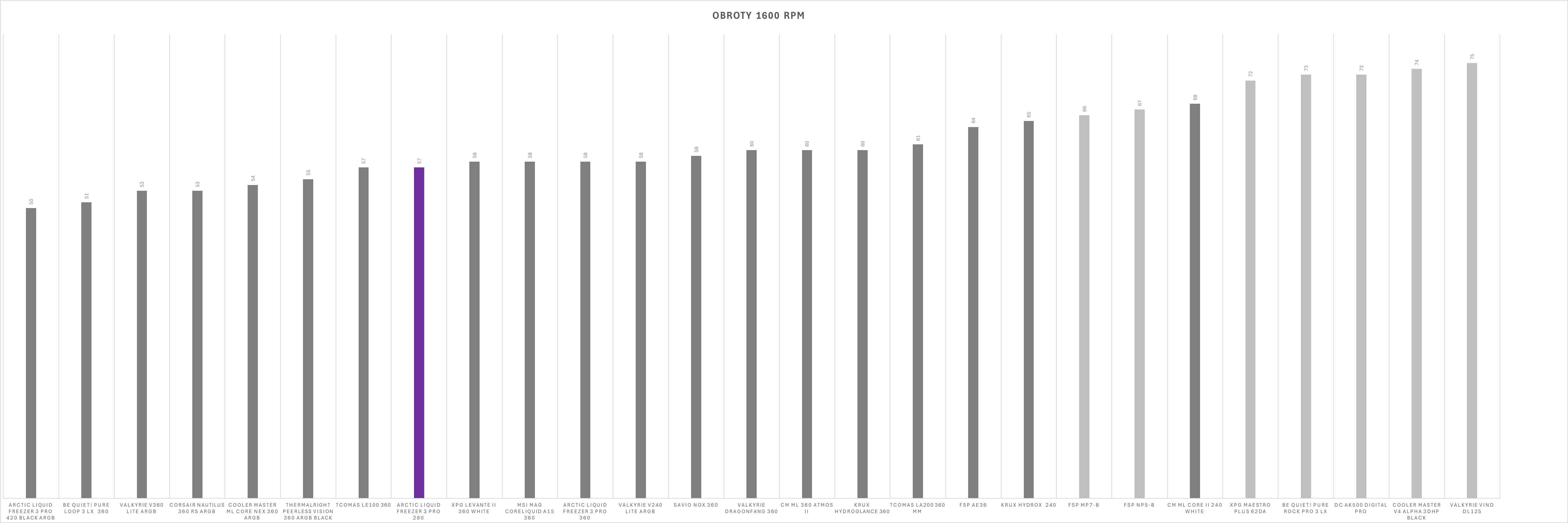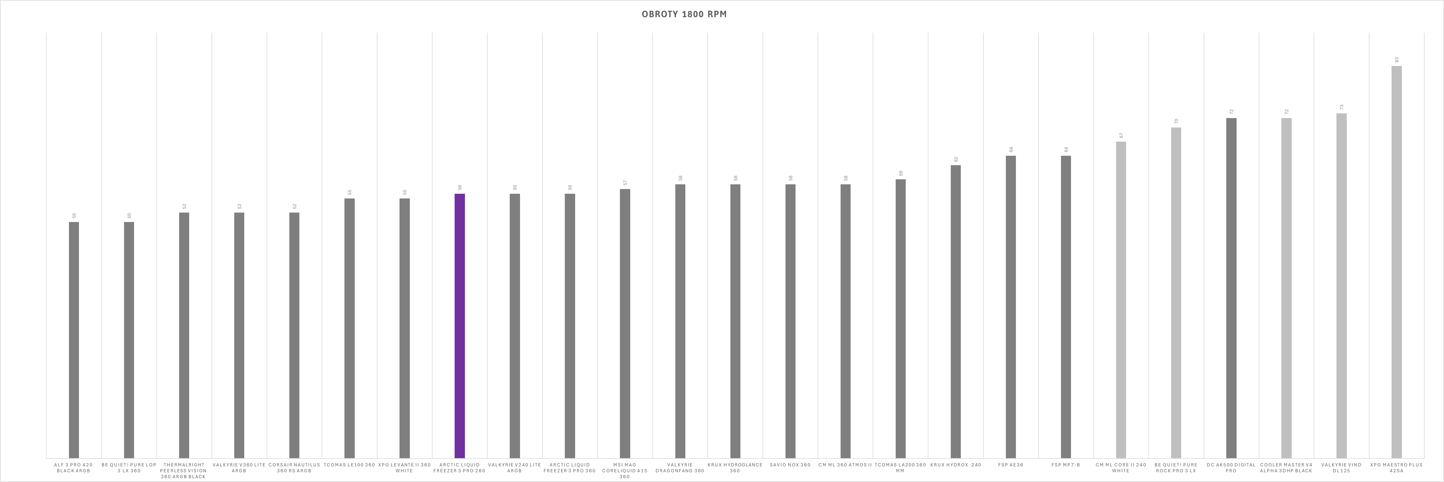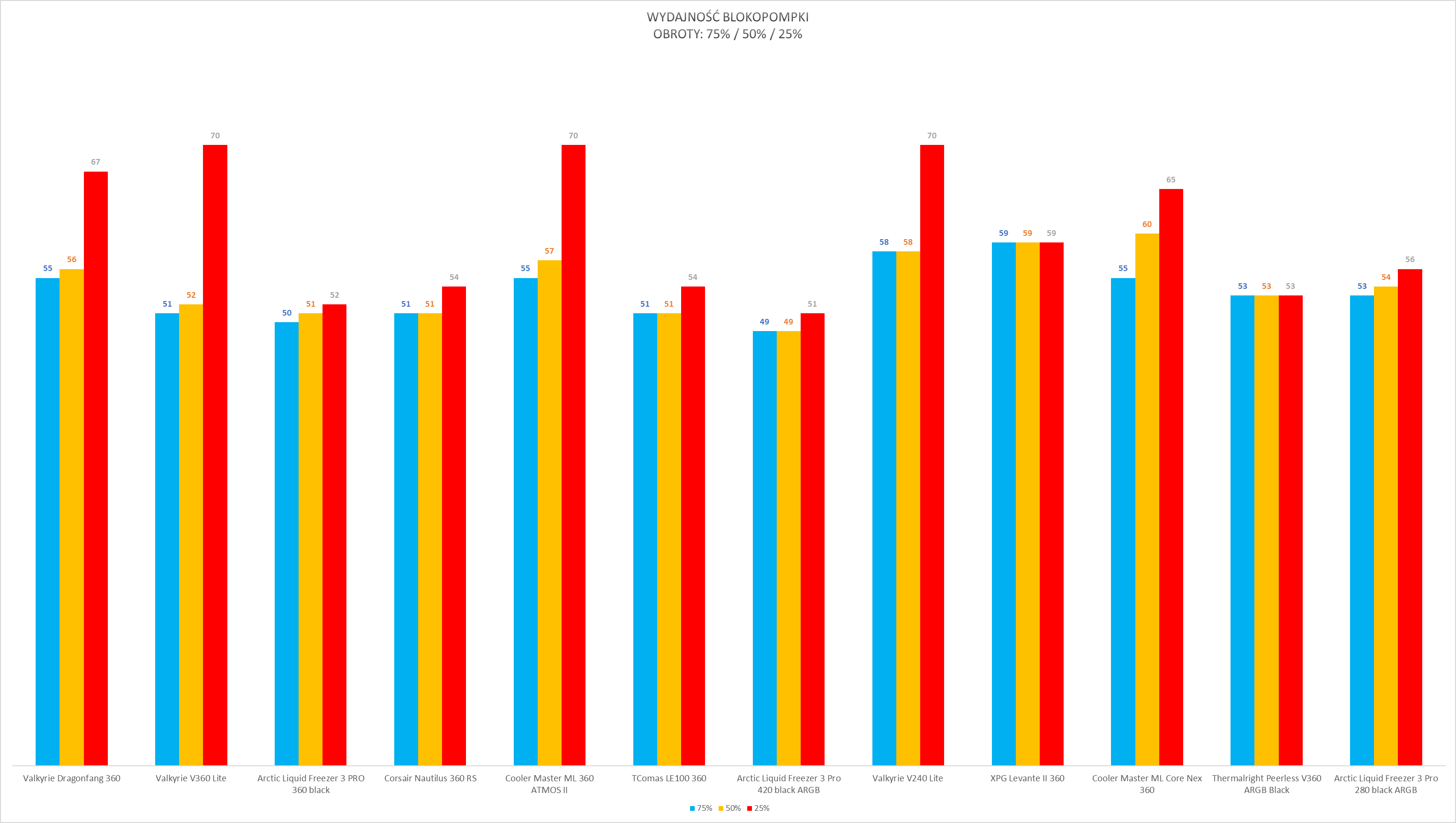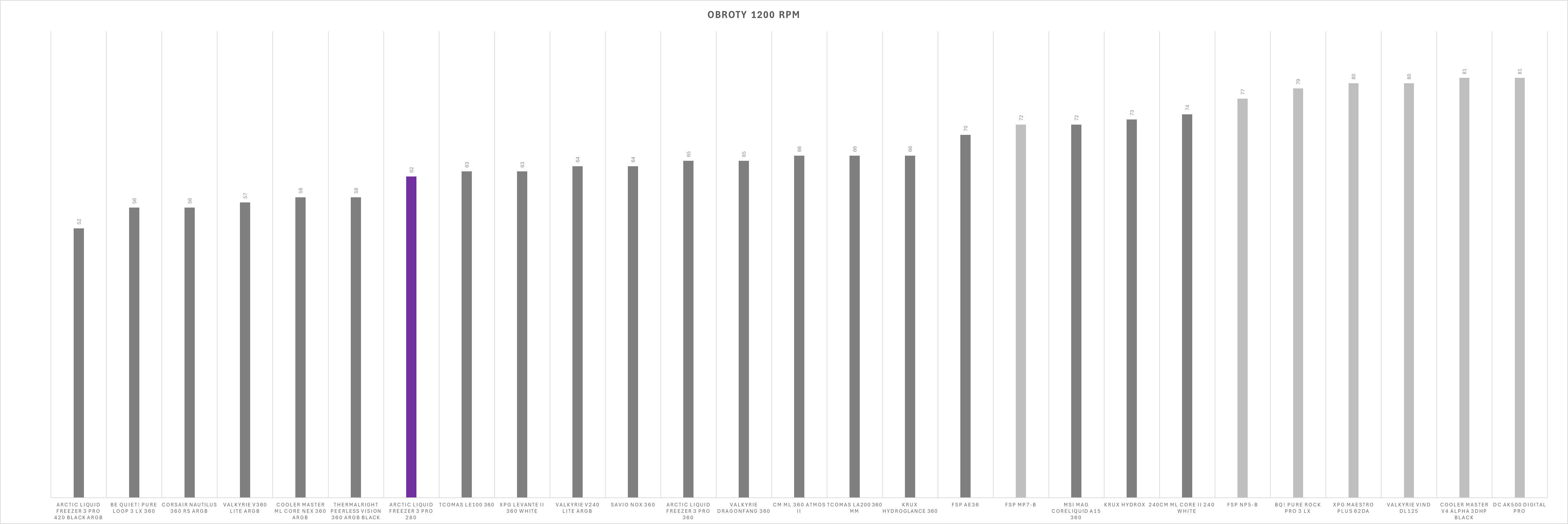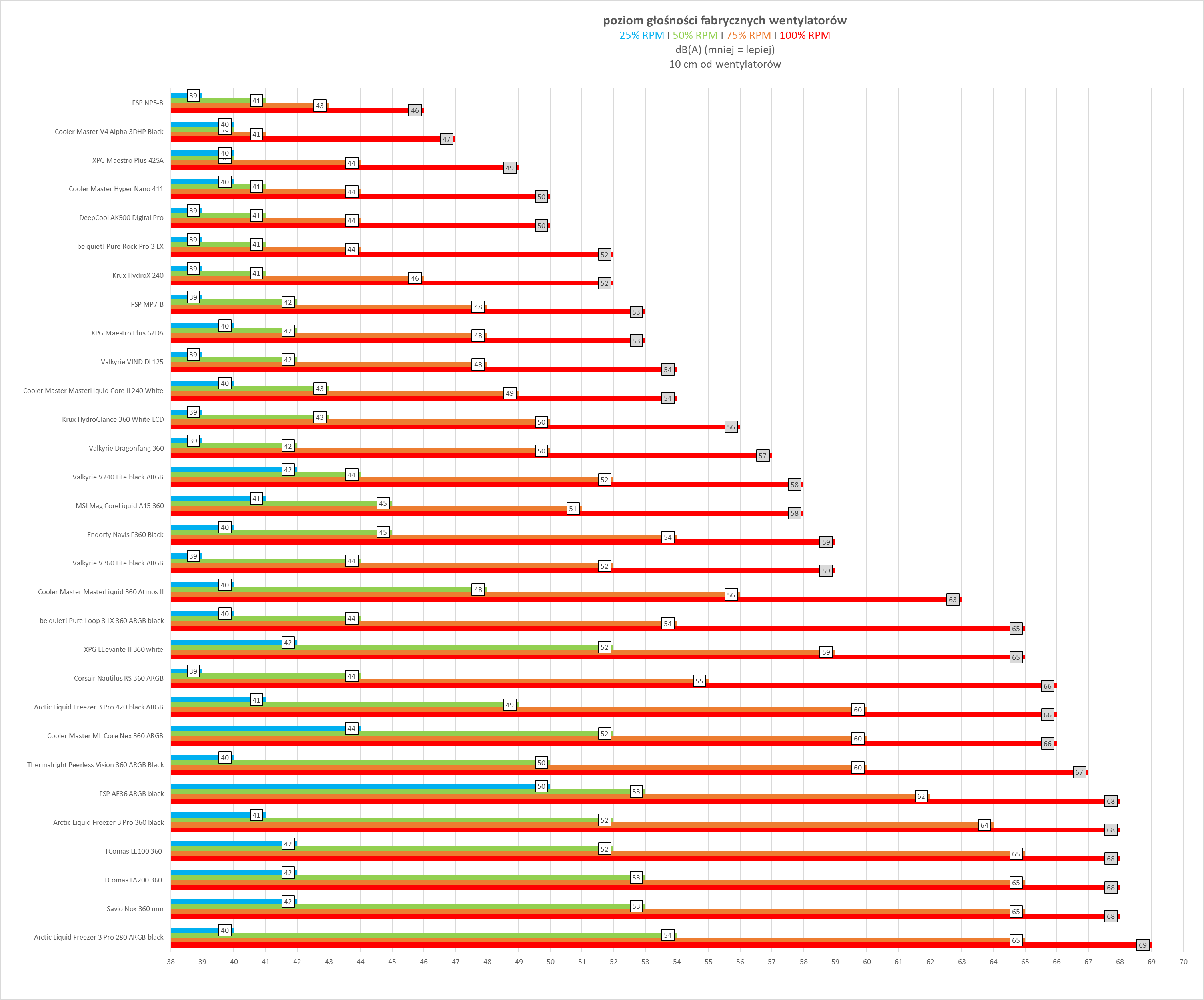 Kultura pracy w dużej mierze zależy od ustawień wentylatorów. Sama pompka oraz dodatkowy wentylator VRM działają cicho i nie wyróżniają się negatywnie nawet przy niższych wartościach PWM – w zamkniętej obudowie pozostają praktycznie niesłyszalne. Sytuacja zmienia się jednak przy wentylatorach chłodnicy. Po przekroczeniu około 60% prędkości obrotowej generowany hałas rośnie wyraźnie szybciej niż zyski wydajnościowe, a przy maksymalnych obrotach zestaw osiąga poziom 69 dBA, co czyni go aktualnie najgłośniejszym modelem wśród dotychczas testowanych.