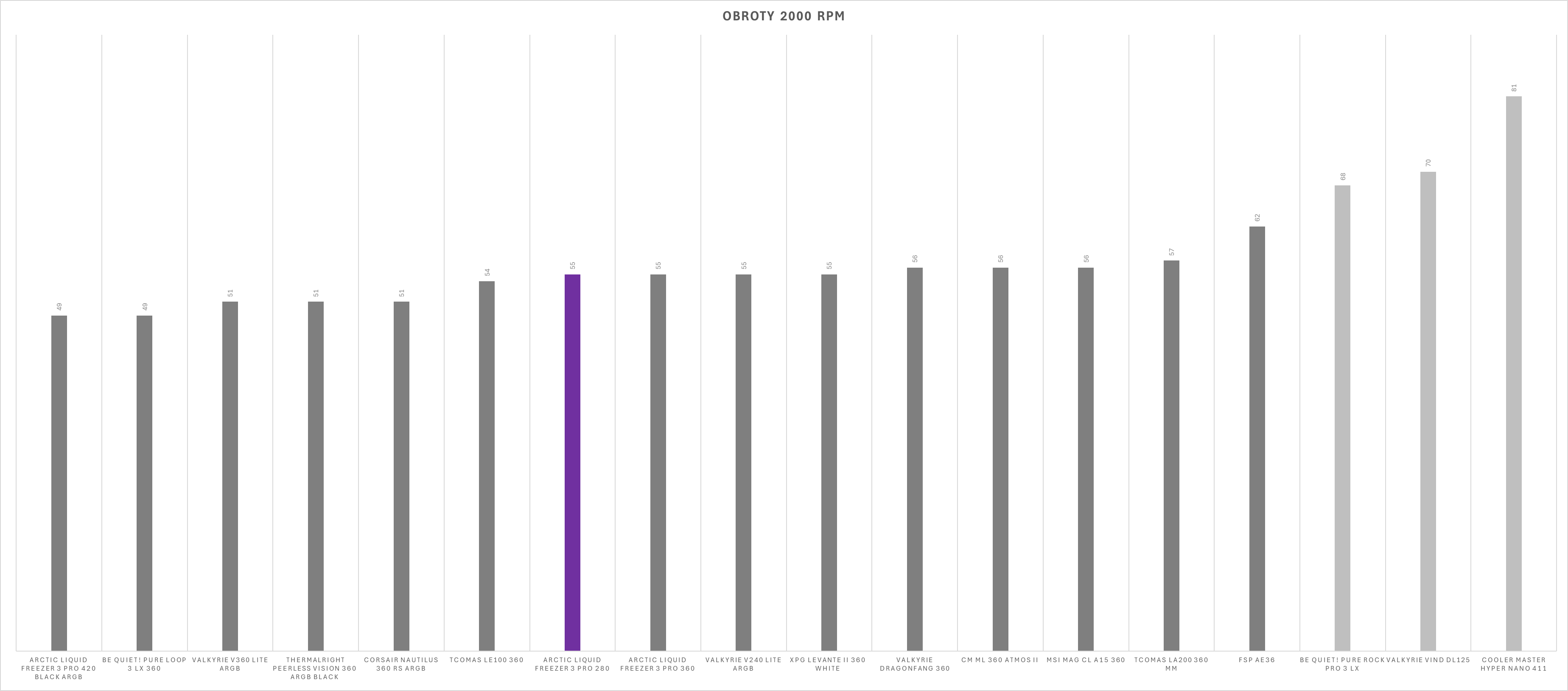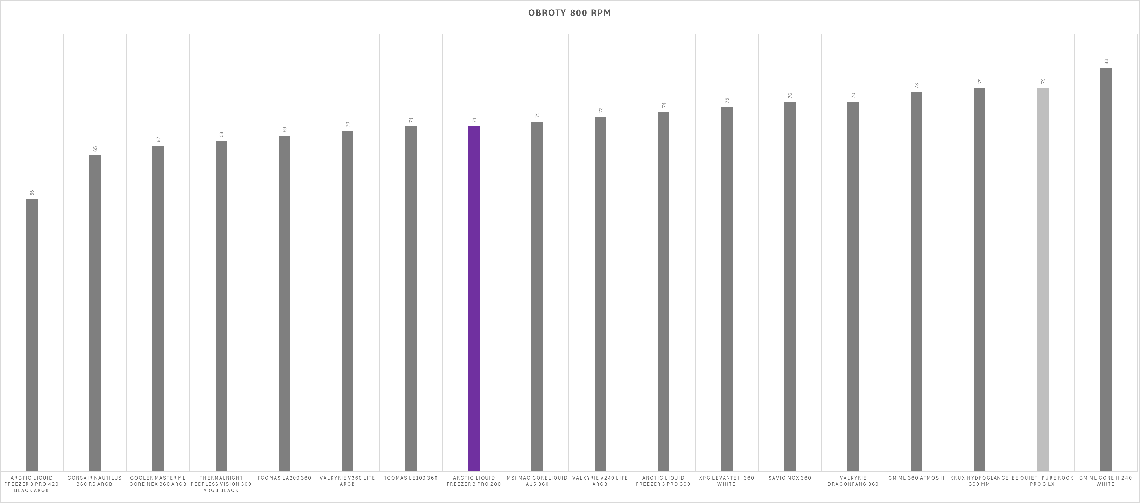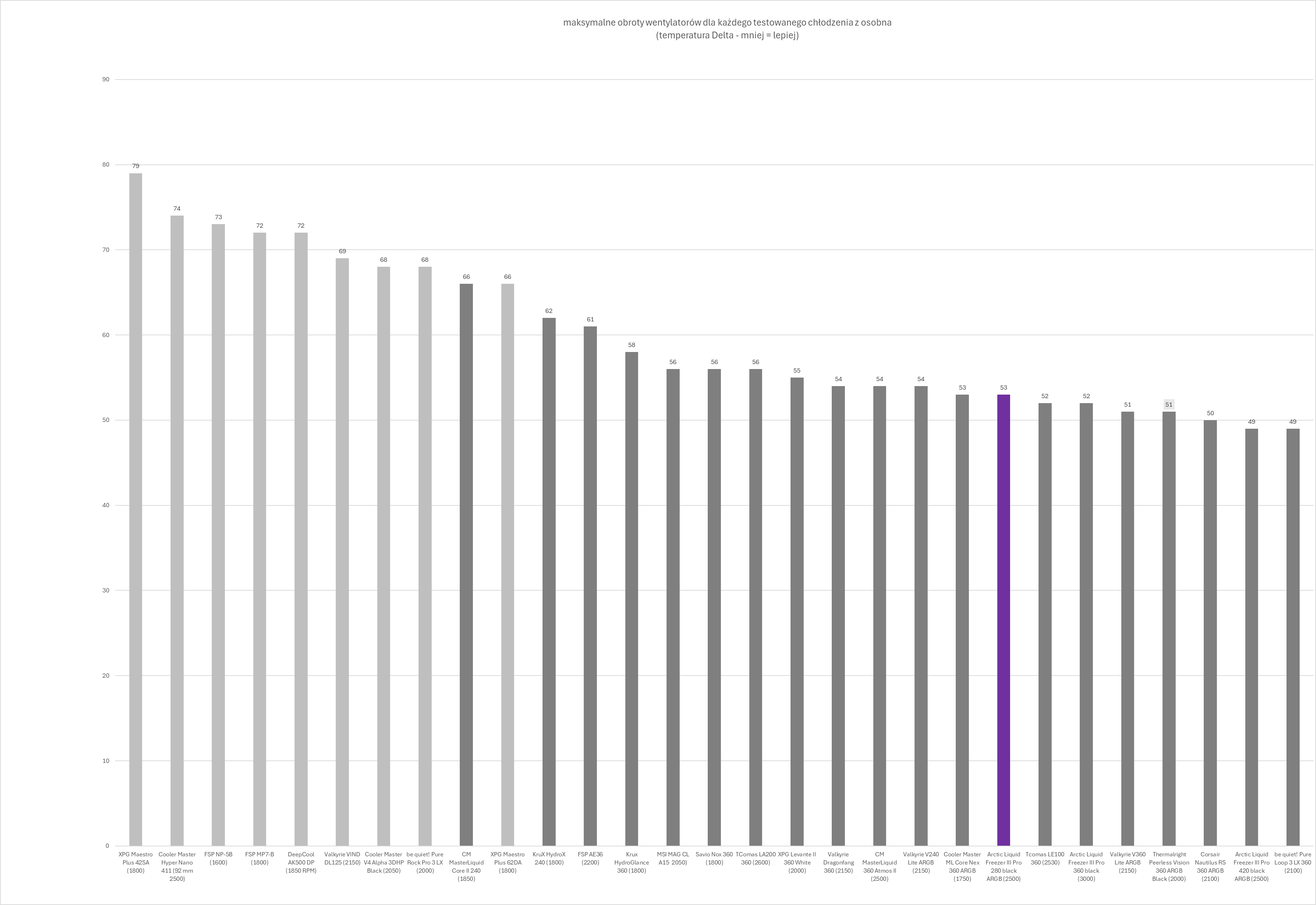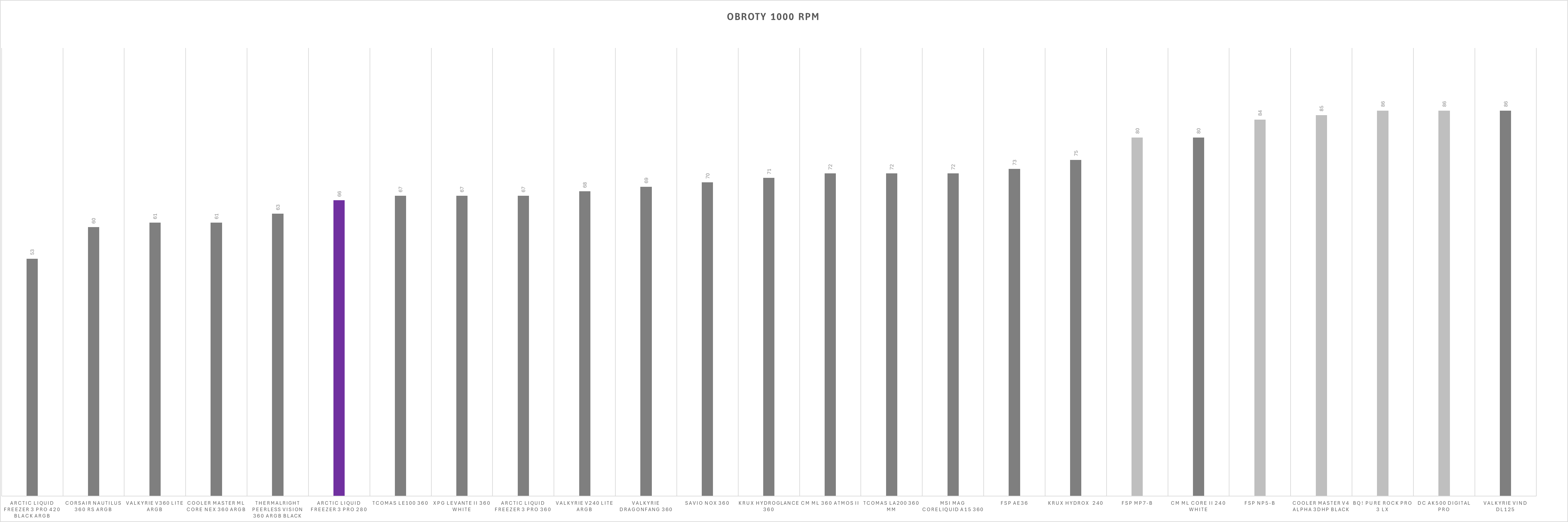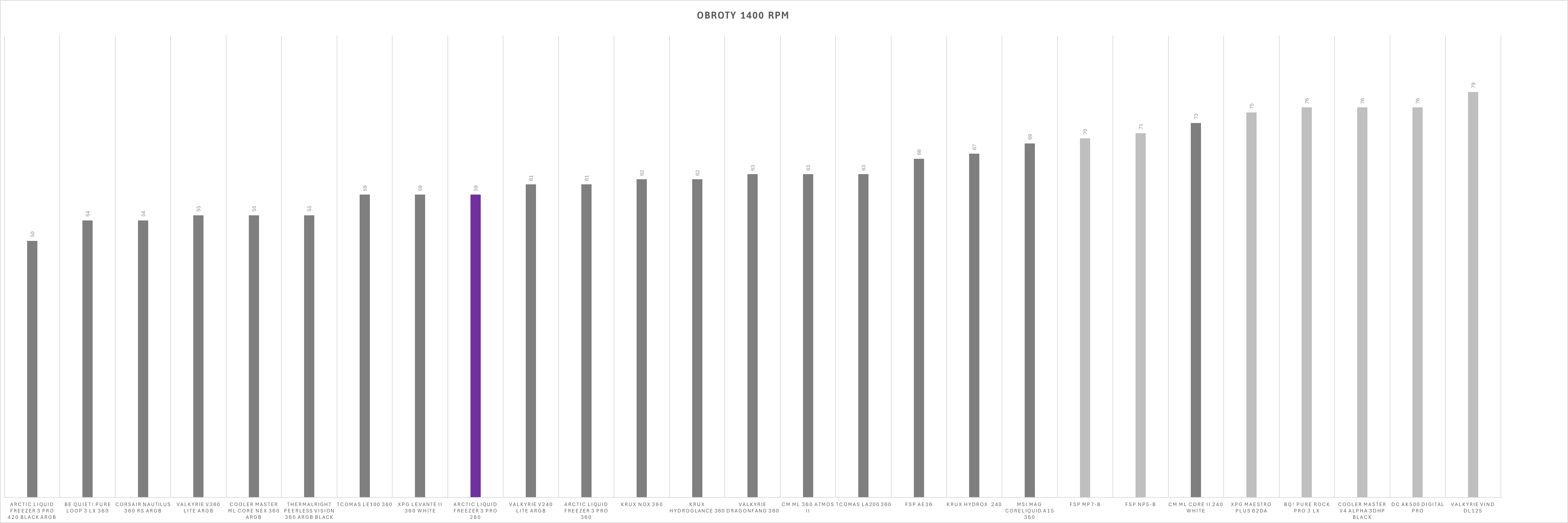 Kultura pracy w dużej mierze zależy od ustawień wentylatorów. Sama pompka oraz dodatkowy wentylator VRM działają cicho i nie wyróżniają się negatywnie nawet przy niższych wartościach PWM – w zamkniętej obudowie pozostają praktycznie niesłyszalne. Sytuacja zmienia się jednak przy wentylatorach chłodnicy. Po przekroczeniu około 60% prędkości obrotowej generowany hałas rośnie wyraźnie szybciej niż zyski wydajnościowe, a przy maksymalnych obrotach zestaw osiąga poziom 69 dBA, co czyni go aktualnie najgłośniejszym modelem wśród dotychczas testowanych.