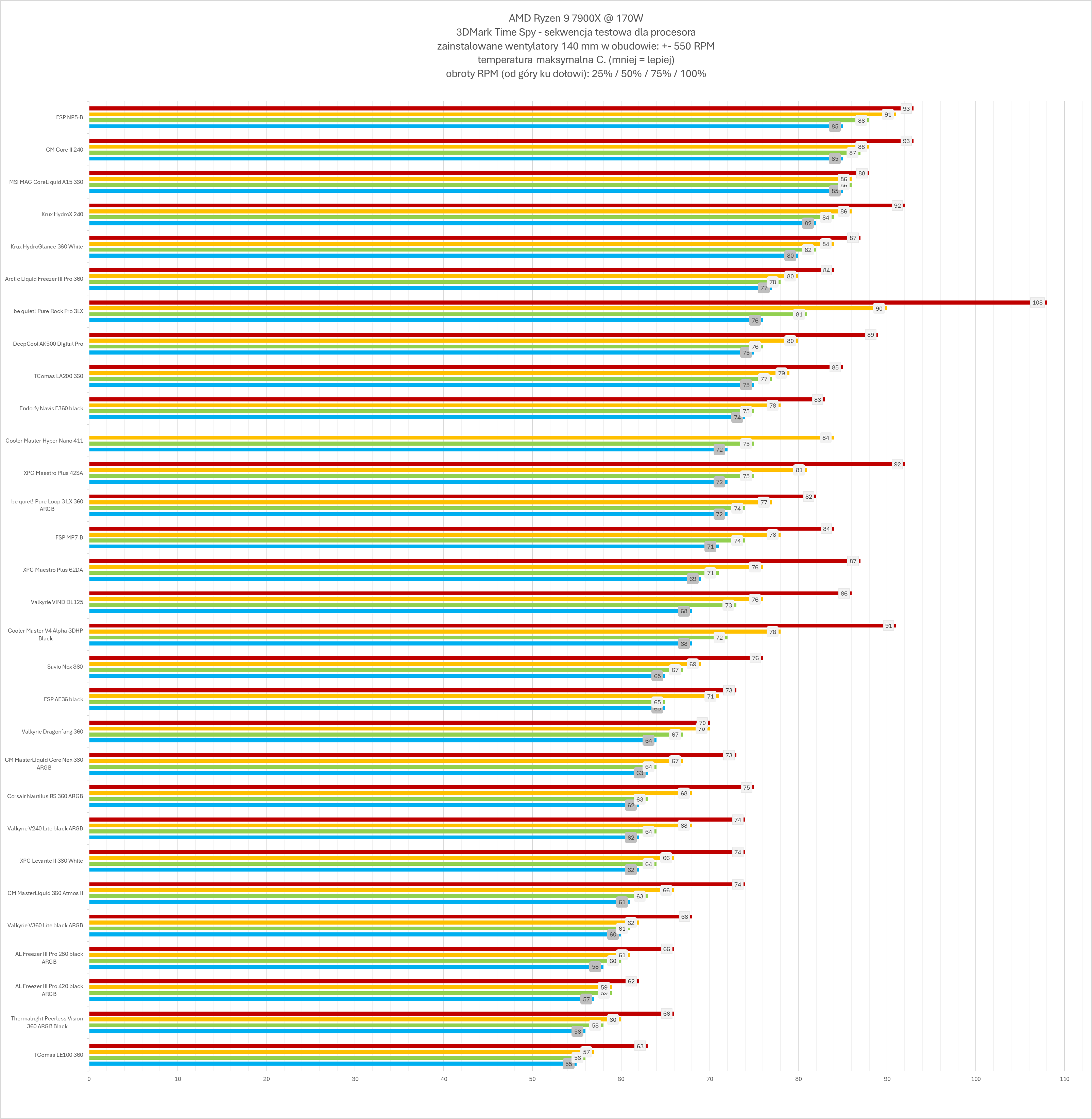 W praktyce nie jest to jednak scenariusz, który będzie często wykorzystywany. Przy odpowiednio ustawionej krzywej PWM można uzyskać bardzo dobry balans między wydajnością a kulturą pracy. Warto przy tym korzystać z rozdzielonego okablowania zamiast trybu all-in-one, co pozwala na niezależną kontrolę pracy pompy, wentylatora VRM oraz śmigieł chłodnicy.