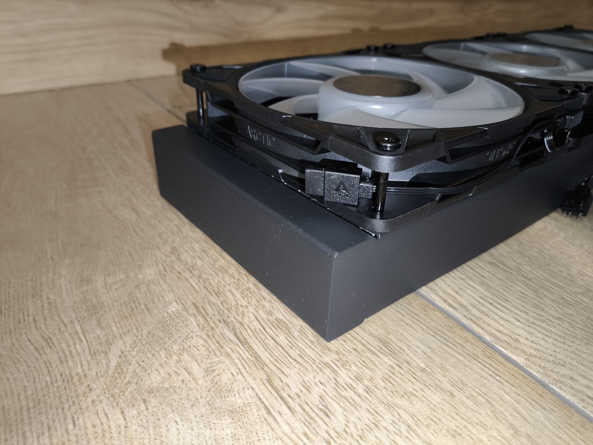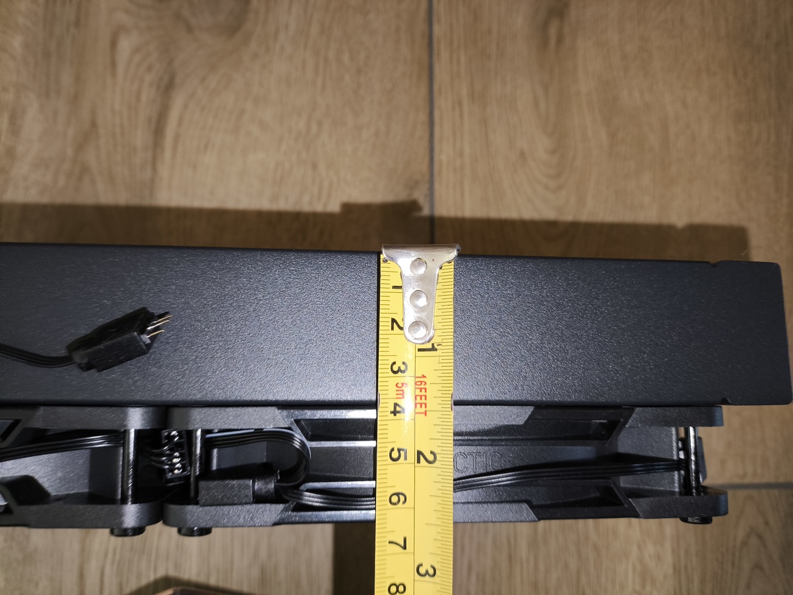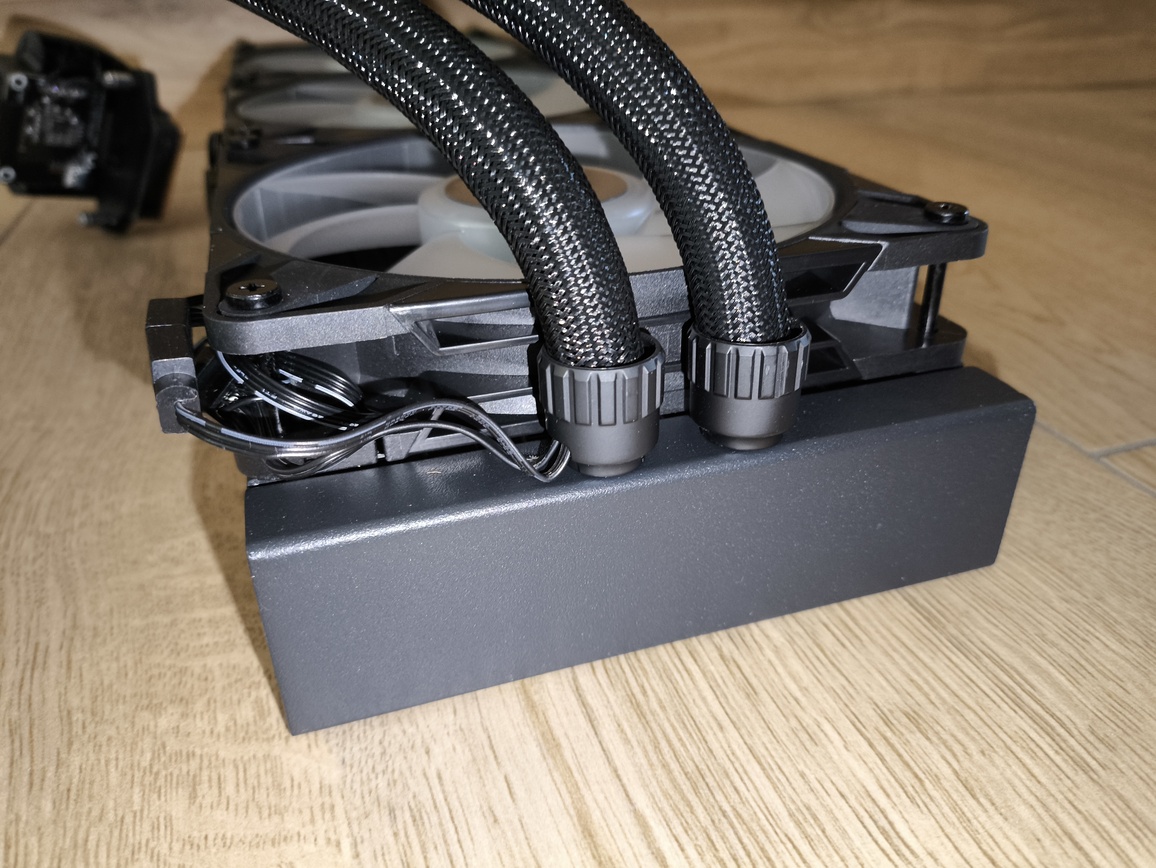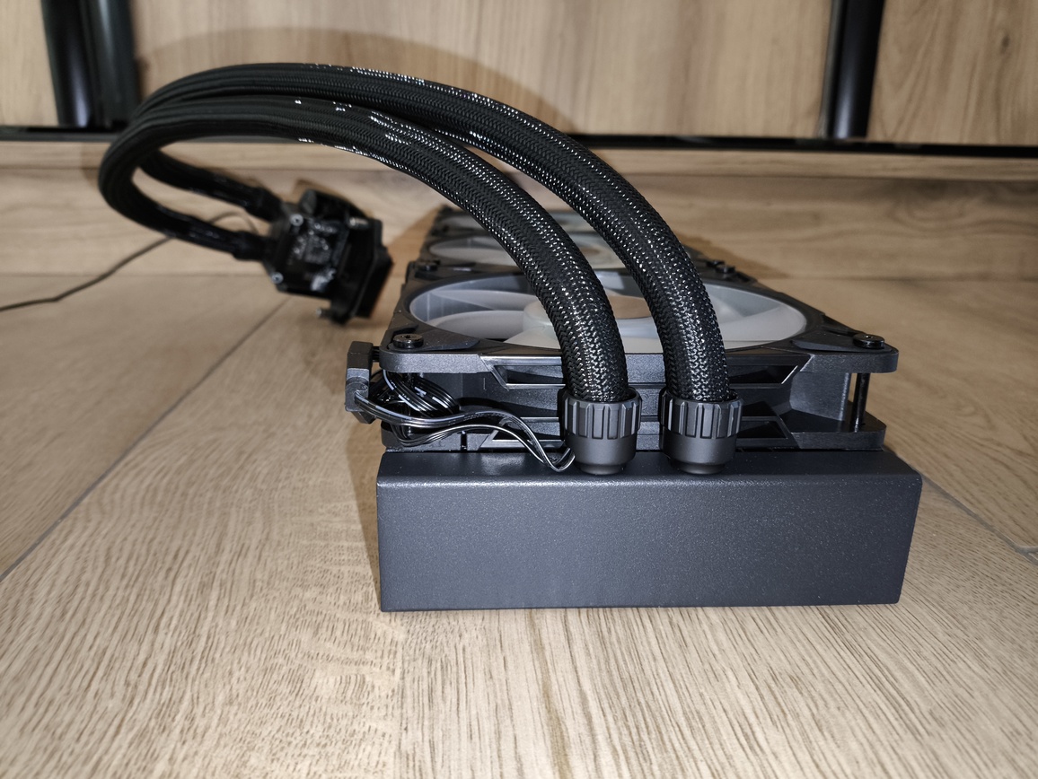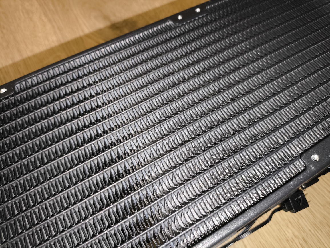 Zmniejszono wysokość tzw. „standoffów” – czyli dystansów między wentylatorami a właściwym rdzeniem chłodnicy – z typowych 5,5 mm do około 3 mm. Dzięki temu efektywna grubość rdzenia (czyli części z kanałami wodnymi i gęstą strukturą finów) wzrosła do około 32 mm, co zbliża ten radiator do tzw. „double-thick”, czyli konstrukcji znanych z customowych zestawów wodnych.