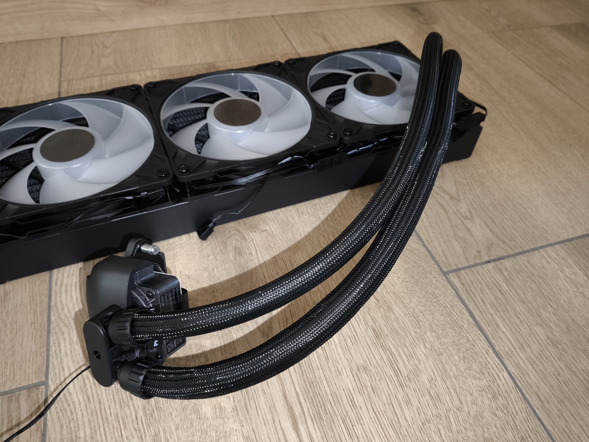 Przewody EPDM w czarnym, materiałowym oplocie mają długość 500 mm — to sporo, ale wynika bezpośrednio z długości radiatora; krótsze po prostu nie sięgałyby do gniazda procesora. Średnica zewnętrzna przewodów wynosi 12,4 mm, a wewnętrzna 6 mm.