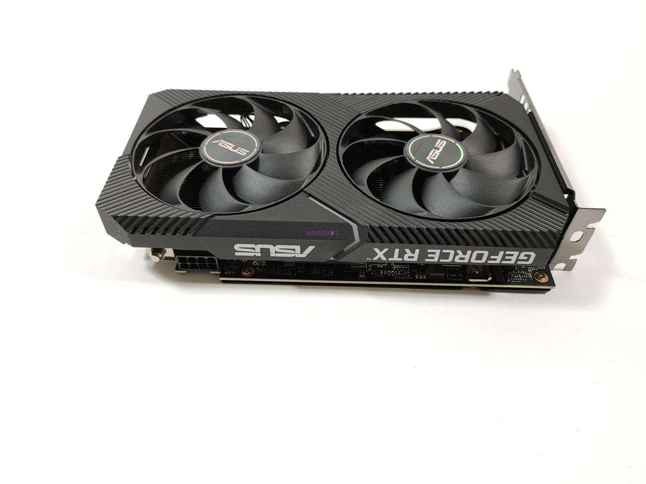 Asus GeForce RTX 3060 Dual OC zasilany jest z jednego złącza 8 pin, które znajduje się prawie na samym końcu. Asus sugeruje tutaj przynajmniej 650 W zasilacz. Za chłodzenie odpowiadają dwa wentylatory Axial-tech. Ich średnica wynosi 90 mm. Wentylatory pracują pasywnie przy niskich temperaturach, więc w spoczynku na pewno ich nie usłyszycie. Dostępne wyjścia obrazu to HDMI 2.1 i 3x DisplayPort 1.4a.