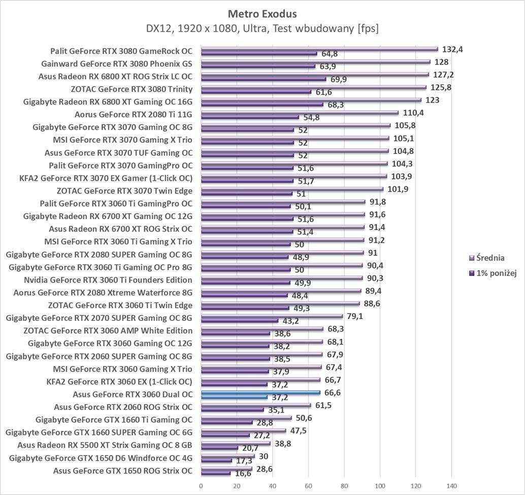 Asus GeForce RTX 3060 Dual OC ma taktowanie boost równe 1837 MHz. Jednakże w oprogramowaniu możecie włączyć OC Mode i podbić taktowania do 1867 MHz. W benchmarku Metro Exodus 2560 x 1440 px karta miała średnie taktowanie ok. 1870 MHz. Jest to najmniejsze spośród wszystkich testowanych RTX 3060.