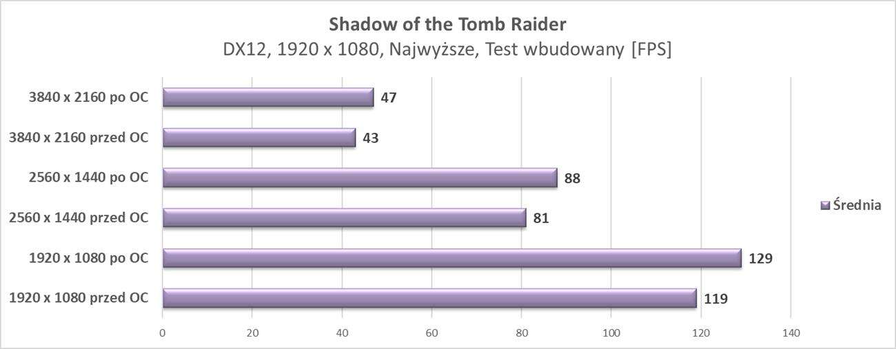 Dzięki półpasywnemu trybowi pracy na pewno karty nie usłyszycie w spoczynku. Pod obciążeniem jest już ona słyszalna, a także najgorętsza spośród testowanych modeli. Nie jest jednak tak źle i przy mocniejszym procesorze z AiO 240 raczej nie będzie Wam przeszkadzała. Warto też zwrócić uwagę na możliwości OC, które pozwalają na zyskanie sporej ilości fps w grach.