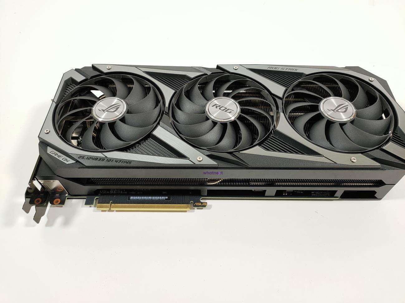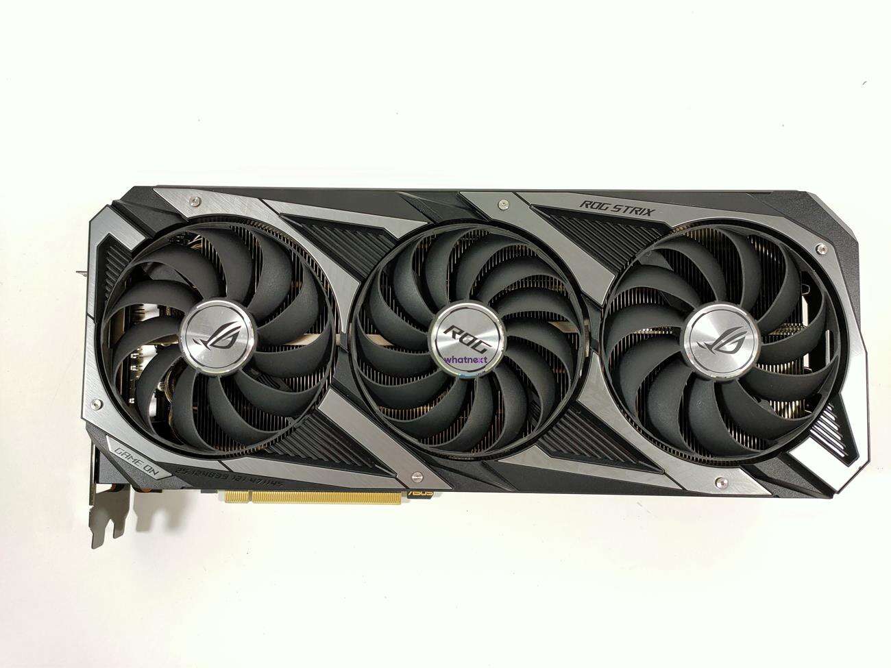 Asus GeForce RTX 3090 ROG Strix OC ma wymiary 318,5 mm x 140,1 mm x 57,8 mm i zajmuje aż 2,9 slota PCI. Zasilana jest ona z trzech złączy 8 pin, a rekomendowany zasilacz powinien mieć aż 850 W mocy. Grafika jest też fantastycznie wykonana. Asus użył do niej najlepszej jakości materiałów, przez co robi ona świetne wrażenie.