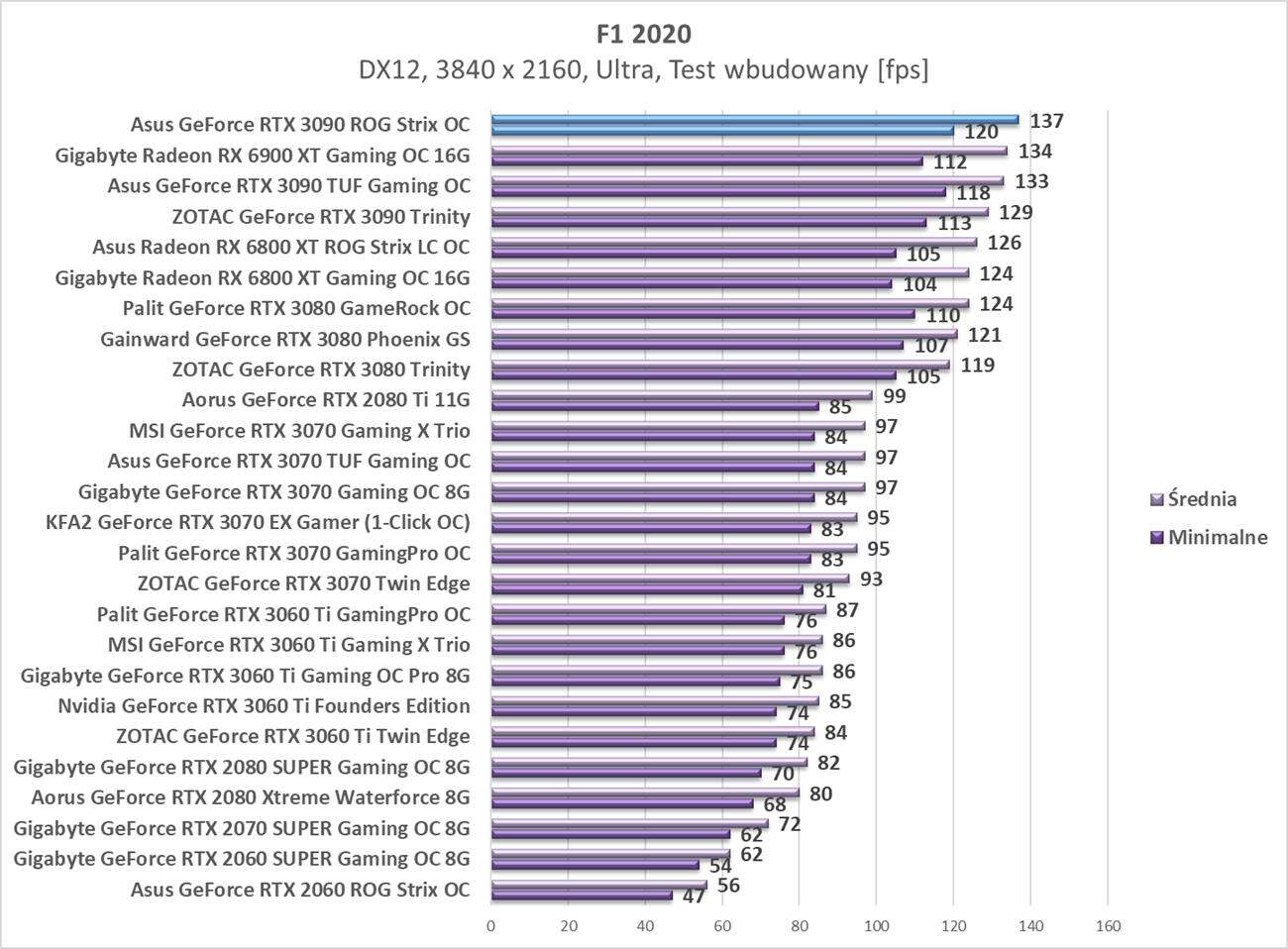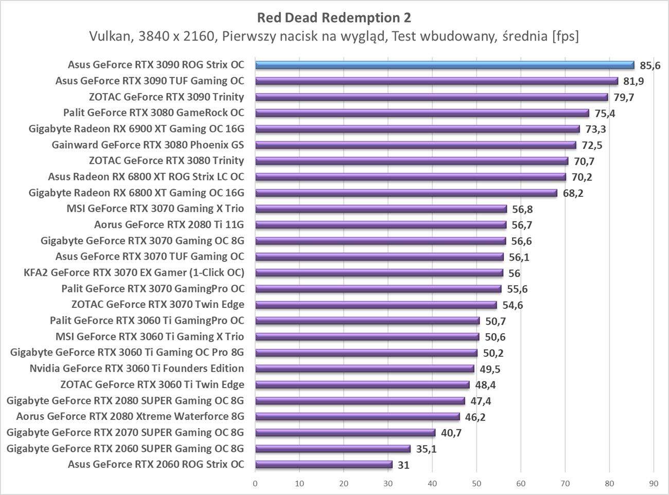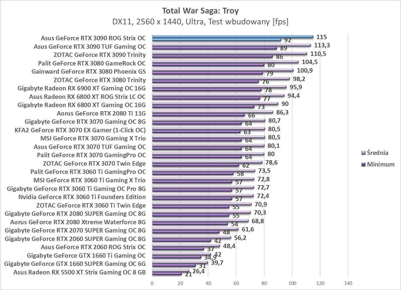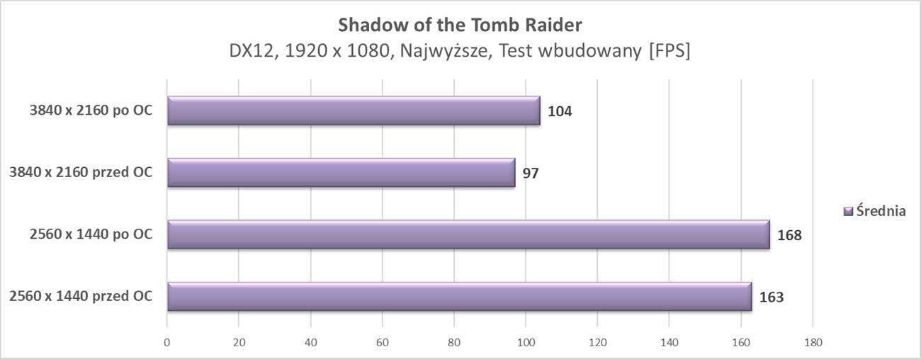 W kolejnej rozdzielczości również zawsze możecie liczyć na średnio powyżej 60 fps. Tym razem karta zajęła też pierwsze miejsce we wszystkich testach więc spokojnie można uznać, że do rozdzielczości 4K ciężko o wydajniejszą grafikę.