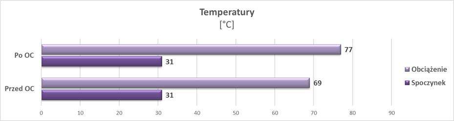 Podkręcanie przeprowadziłem poprzez przesunięcie suwaków z napięciem, power limit oraz thermal limit do maksymalnych dostępnych wartości w programie MSI Afterburner. Jak możecie zobaczyć, udało mi się podnieść taktowania o 80 MHz na rdzeniu oraz 112 MHz na układach pamięci. Przy wyższych wartościach były już problemy z grami. Przykładowe wyniki przy takich ustawieniach znajdziecie poniżej.