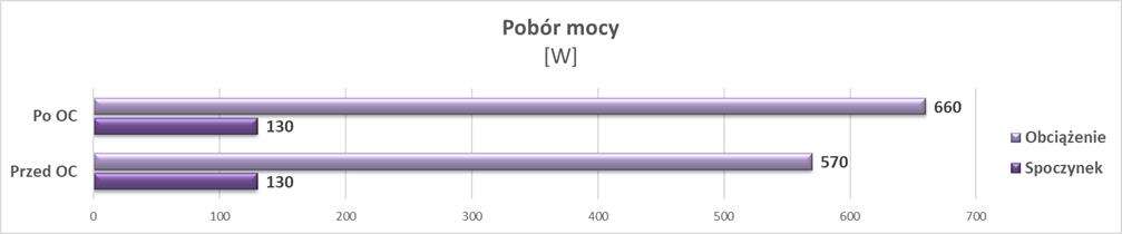 Tak jak wspominałem karta ma dwa BIOSy. P Mode oferuje bardzo przystępne temperatury ale za to kultura pracy jest bardzo słaba – grafika jest zwyczajnie głośna. W Q Mode jest już ciszej ale musicie się liczyć ze znacznie większymi temperaturami. W obu trybach mimo braku półpasywnej pracy wentylatorów w spoczynku jest dosyć cicho. Zwróćcie też uwagę na bardzo wysoki pobór mocy przez grafikę.