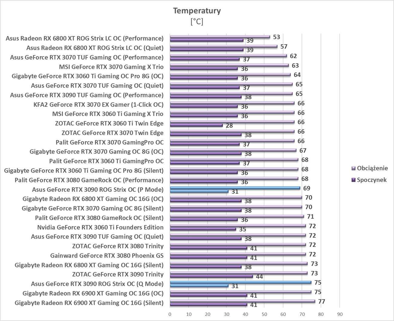 Asus GeForce RTX 3090 ROG Strix OC to bez wątpienia najwydajniejsza karta w naszym zestawieniu. RÓżnica w stosunku do RTX 3080 jest znacznie większa, niż w przypadku słabszych modeli RTX 3090 i wynosi ok. 13% w stosunku do najmocniej podkręconego RTX 3080 w naszym zestawieniu w 4K. Nadal jest to zbyt mała różnica aby dopłacać prawie 2x ceny, ale dla entuzjastów sprzętu może mieć spore znaczenie.