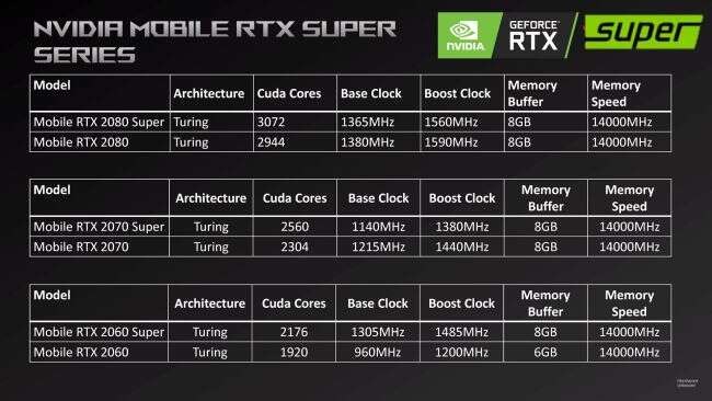 Mobilny RTX 2060 SUPER ma 2176 rdzeni CUDA, 272 tensor, 34 RT oraz 8 GB pamięci GDDR6. Mobilne odpowiedniki grafik mają zazwyczaj niższe taktowania od desktowowych, bowiem musza one sprostać znacznie niższym limitom TDP.