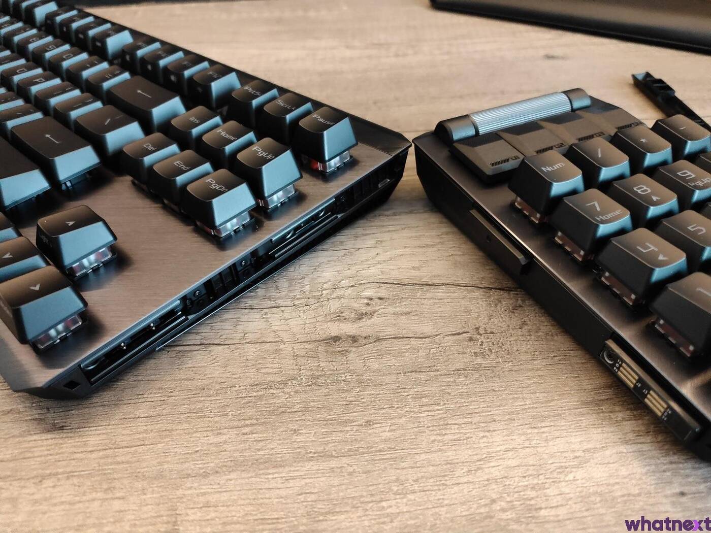 Bardzo, ale to bardzo przyjemna w dotyku podkładka pod nadgarstki na magnes przyzwoitej sile z pianki memory i wysokiej jakości skóry z wytłoczeniem po prawej stronie nadaje całości jeszcze wyższej stabilności oraz charakteru premium, co tyczy się również odpinanego bloku numpada. Ten w swoim prawym górnym roku posiada świetną, szeroką rolkę z zestawem czterech multimedialnych klawiszy, które nie są podświetlane, ale które można z łatwością zaprogramować pod kątem makr.
