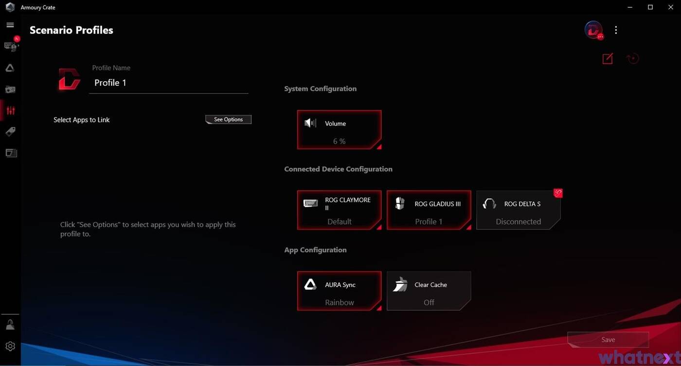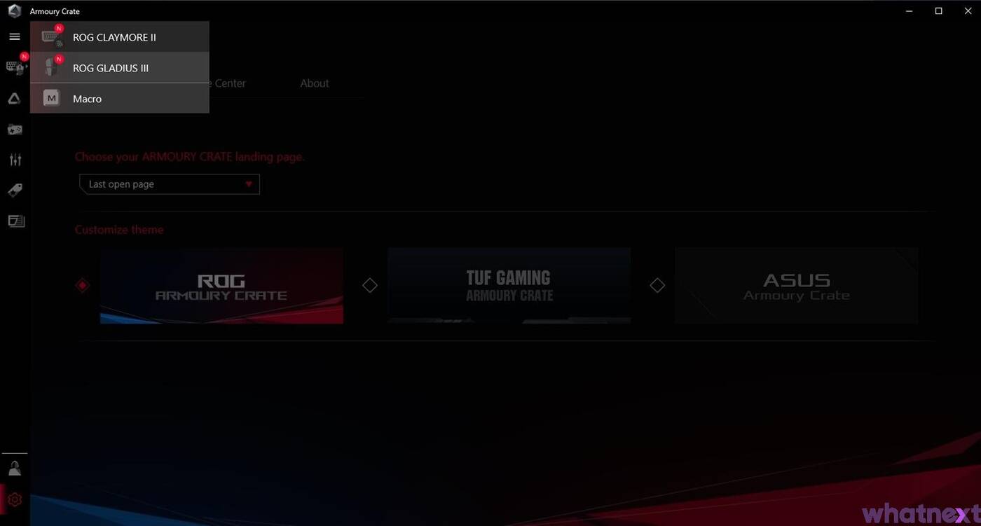 Omówienie najlepiej rozpocząć od oprogramowania Armoury Crate, które to jest dla ASUSa swoistym HUBem dla wszystkich nowych sprzętów. Możecie uznać je za takiego „Steama dla sprzętów ROG”, gdzie pobierzecie najnowsze aktualizacje, ustawicie do pięciu profili do zapisania w pamięci masowej, przypniecie do nich konkretne aplikacje i wreszcie zajmiecie się konfiguracją samego sprzętu. Niestety skłamałbym, gdybym powiedział, że to najlepsza aplikacja producenta tej klasy na rynku.