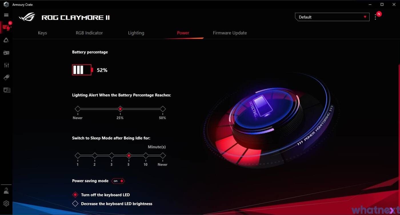 W oprogramowaniu możemy też zabawić się z funkcjami oszczędzania baterii z ustawieniem specjalnego wskaźnika w lewym górnym rogu na czele, efektem podświetlenia wszystkich klawiszy, czy podmianą funkcji poszczególnych klawiszy.