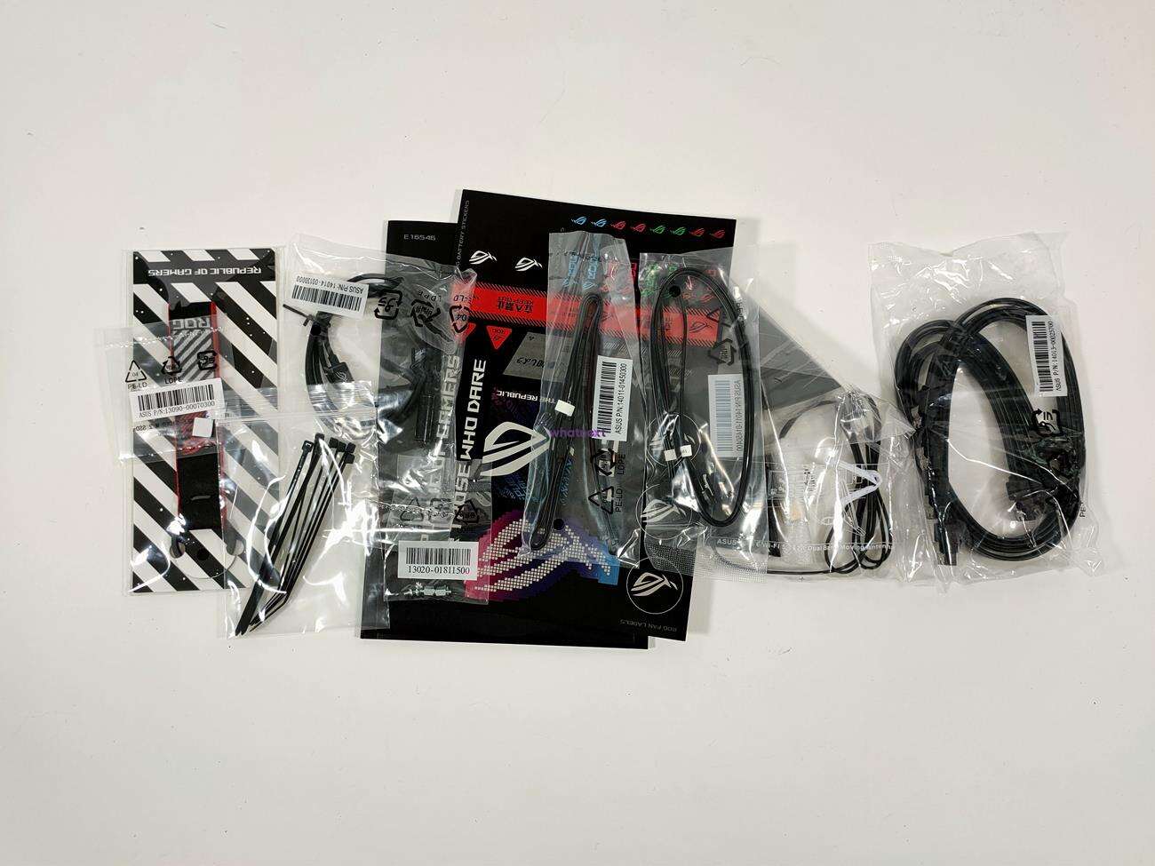 Płytę otrzymałem wraz ze sporą ilością dodatków. Są cztery kable SATA, płyta DVD, instrukcja, opaski zaciskowe, przedłużacze dla RGB i ARGB, karta WiFi, kabel USB-C -> audio czy śrubki. Ilość dodatków jest więc spora – powinna ona każdego zadowolić.