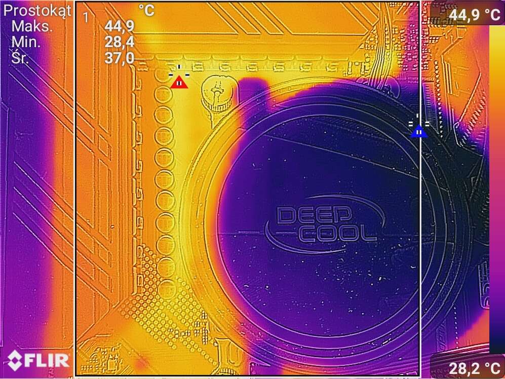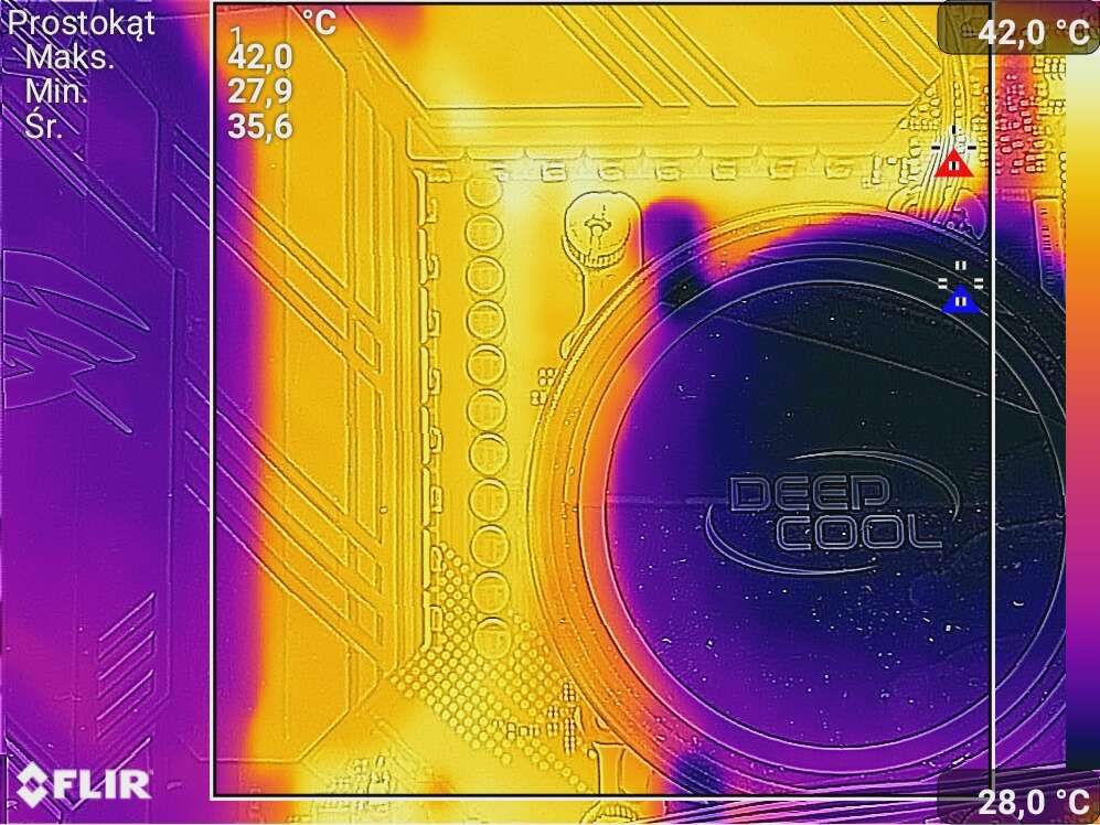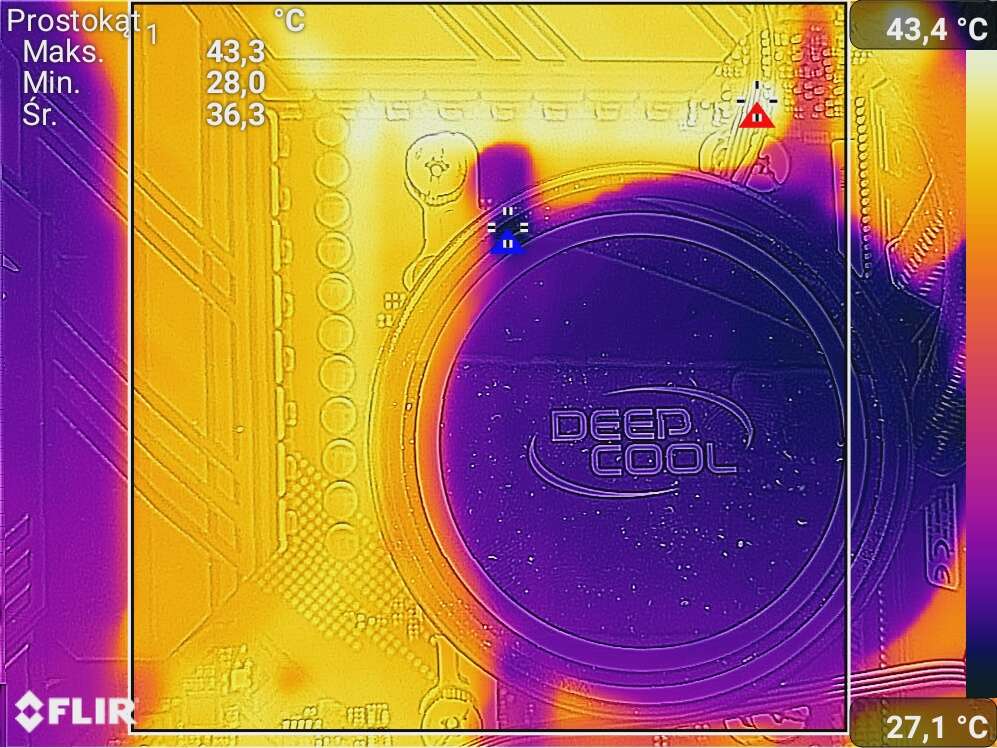 W testach temperatury wykorzystałem moduł termowizyjny smartfonu CAT S61. Obciążenia dokonałem za pomocą programu OCCT, test Linpack, który trwał 5 minut. Spoczynek polegał na włączeniu komputera i pozostawieniu go na 5 minut bez ruszania. Test przeprowadziłem też po podkręceniu procesora do 4,3 GHz przy napięciu 1,4 V.
