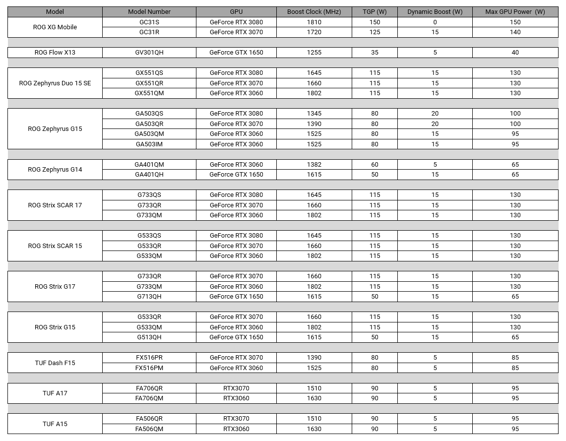 ASUS opublikował tę ważną specyfikację na swojej stronie internetowej, dzięki czemu można łatwo ustalić, który laptop jest wyposażony w które GPU i jakie z nich posiada ograniczoną moc, a jeśli tak, to w jakim stopniu. Specyfikacja wspomina nawet o zegarach dla każdego z układów.