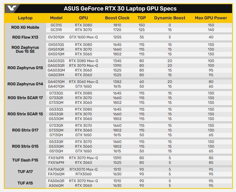 Lista obejmuje 28 różnych konfiguracji laptopów. Firma poszła jednak jeszcze dalej i dostarczyła taktowania dla każdego z modeli GPU. Dzięki tym informacjom można łatwo określić, który model grafiki w danym laptopie będzie wydajniejszy.