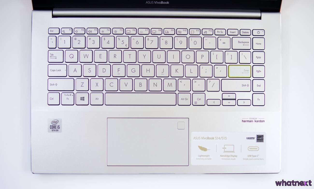Touchpad jest nieduży, nieco panoramiczny, ale korzysta się z niego bardzo przyjemnie. Bardzo dobrze reaguje na dotyk i ma odpowiednio śliską powierzchnię. Testowany egzemplarz ma w górnym rogu płytki dotykowej wbudowany czytnik linii papilarnych. W innym wariancie VivoBooka S14 możemy uruchomić na touchpadzie klawiaturę numeryczną, ale kosztem czytnika.