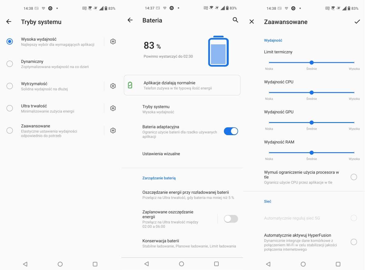 Z pomocą przychodzą tryby pracy – wysoka wydajność, dynamiczny, wytrzymałość, ultra trwałość i zaawansowany. Każdy z nich można dowolnie konfigurować. I tak w trybie wytrzymałość po odznaczeniu spadku odświeżania do 60 Hz smartfon działa zauważalnie dłużej, a różnicy w jego działaniu praktycznie nie zobaczymy. Z kolei tryb zaawansowany pozwala nam ustawić ręcznie wydajność podzespołów i dostosować działanie do naszych potrzeb. Fajnie, że jest taka opcja, ale jeśli dużo korzystacie ze smartfona, to jest wręcz obowiązkowa. Inaczej będziecie wisieć na ładowarce.