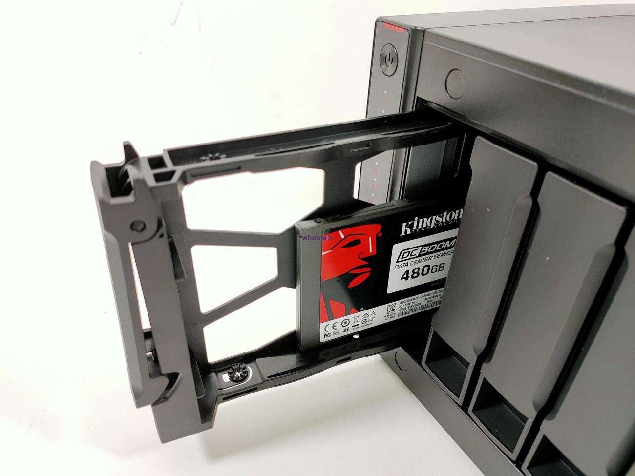 Serwer NAS otrzymałem z dwoma dyskami Kingston Data Center 500M 480 GB. Są to dyski SSD o prędkości odczytu równej 555 MB/s i zapisu 520 MB/s. Dyski wykorzystują pamięci 3D TLC NAND i są one przeznaczone specjalnie dla serwerów. Implementują one wymagania QoS, dzięki czemu świetnie sprawdzą się w każdym serwerze NAS i nie tylko. Kingston Data Center 500M 480 GB mają też mnóstwo innych technologii, które docenią osoby szukające dysków SSD do serwerów. Są to więc jedne z najlepszych dysków, SSD jakie można wybrać do tego typu zastosowań.