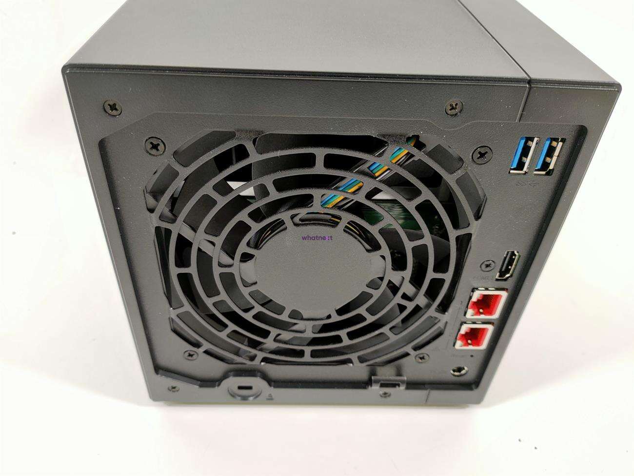 Z tyłu znajdują się dwa złącza USB 3.2 Gen1, dwa ethernet 2,5 GbE oraz HDMI 2.0a. Cieszą w szczególności szybsze złącza ethernet – pozwolą one na lepszą wydajność zbudowanej konfiguracji. Z tyłu znajduje się także 120 mm wentylator – jego maksymalna głośność to 32 dBA (19,7 dBA w spoczynku), więc całość powinna być dosyć cicha. Jest tam także blokada Kensington Lock, wejście na kabel zasilający oraz przycisk reset.